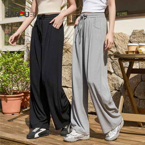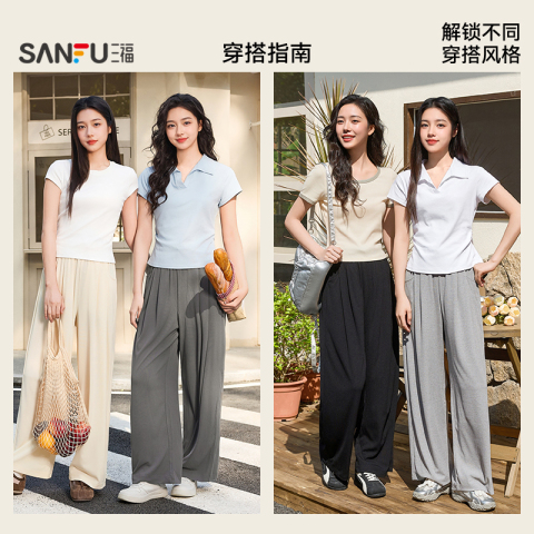 三福休闲裤2026新款夏季宽松高腰显瘦阔腿裤直筒灰色坑条裤子女装