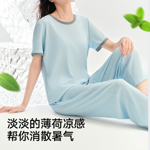 松山棉店小薄荷睡衣女短袖假两件冰丝带胸垫家居服套装可外穿夏季
