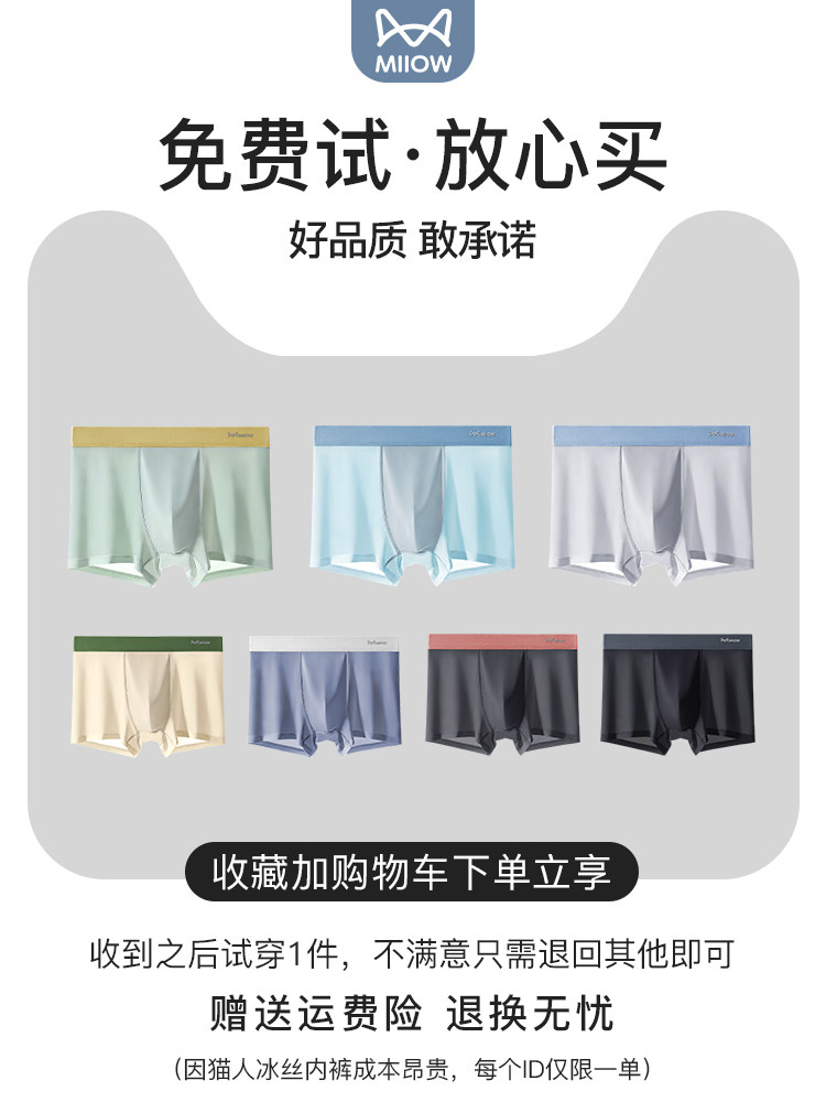 猫人冰丝内裤专享福利透气冰丝×薄款设计!抗菌面料,AAA级抑菌守护!立体剪裁,无痕贴合!猫人品质,值得信赖!多尺码任选,舒适一夏!