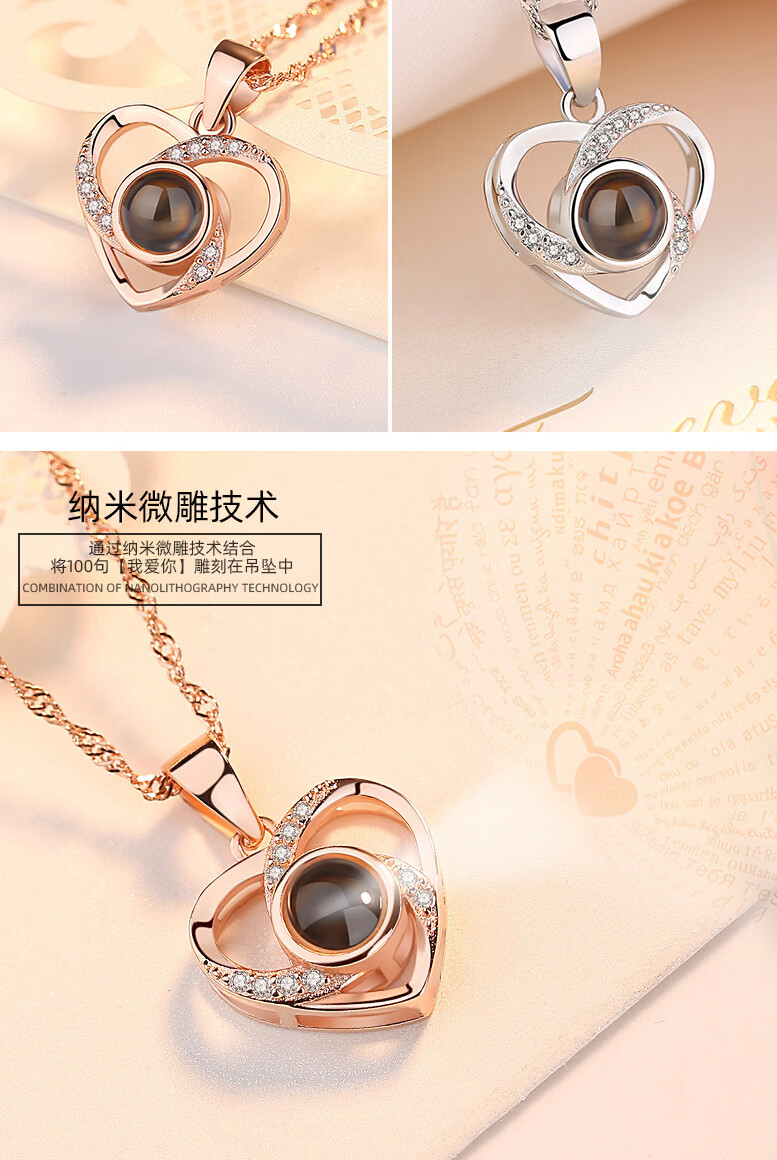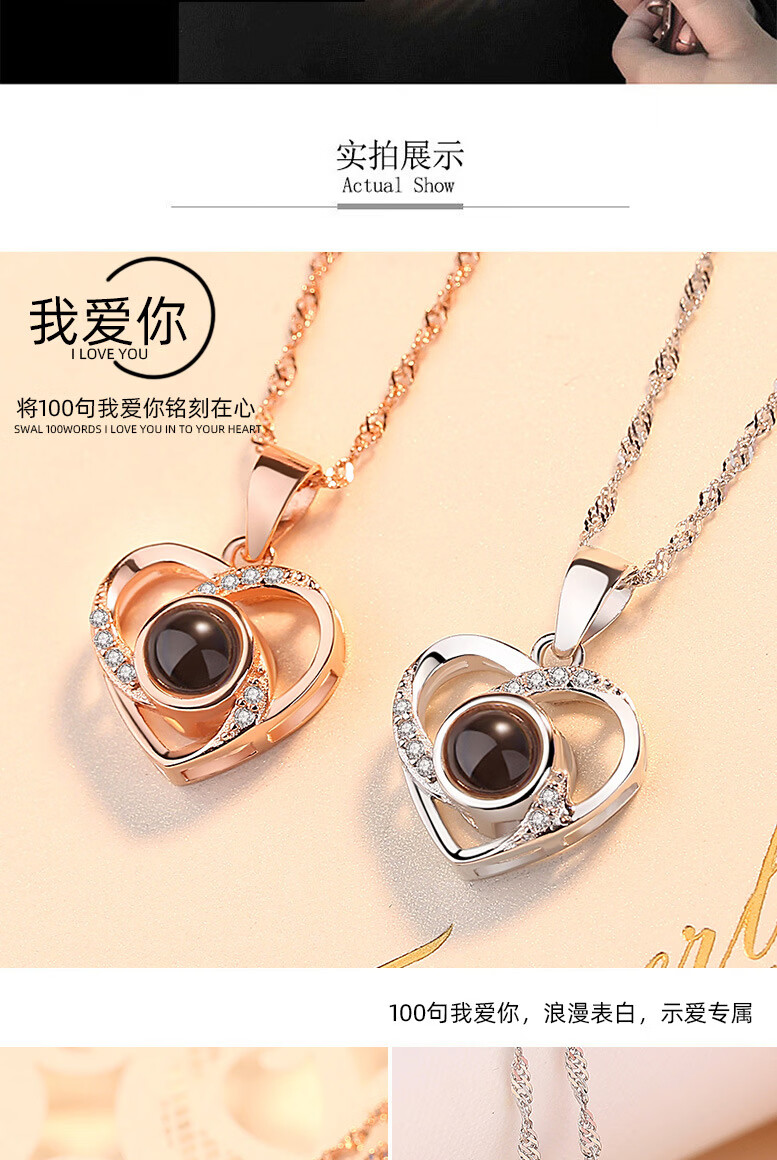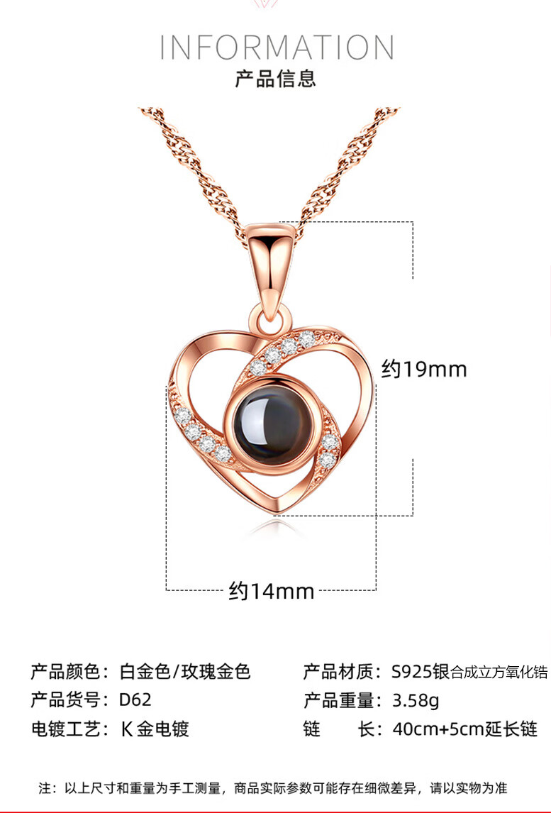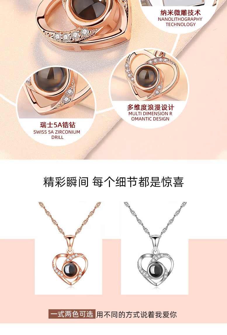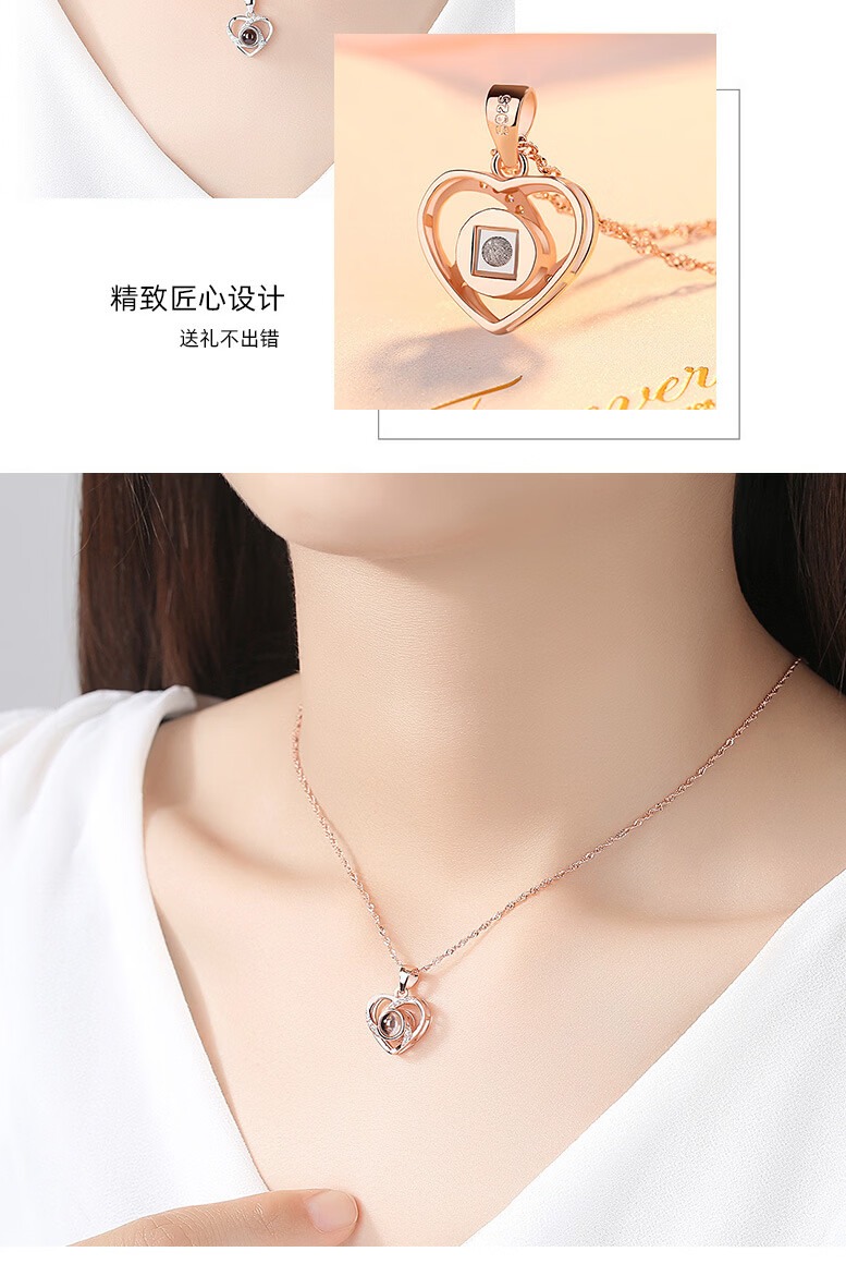 ZAVO定制投影爱的记忆纯银项链女款银吊坠锁骨链情人节送女友生日礼物 【不定制版+证书】玫瑰金色爱的记忆项链