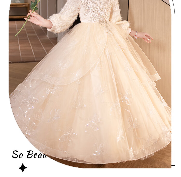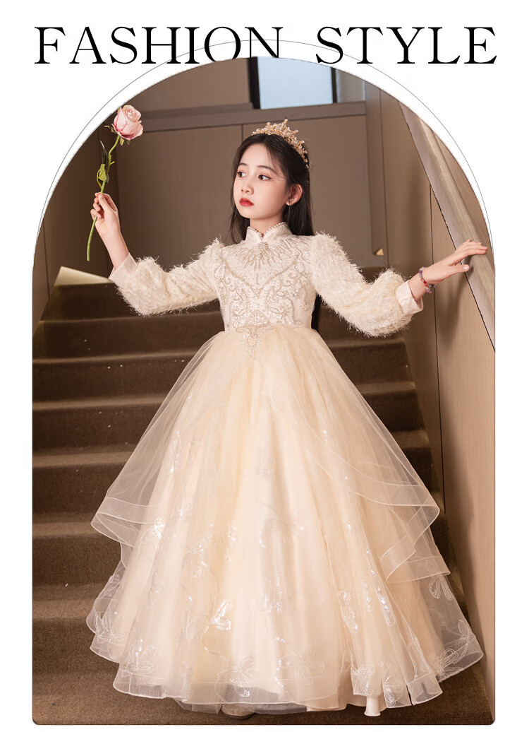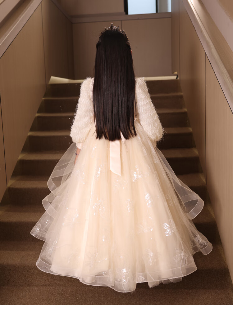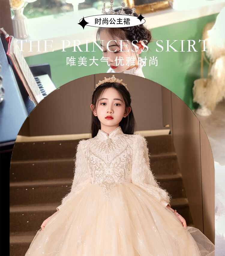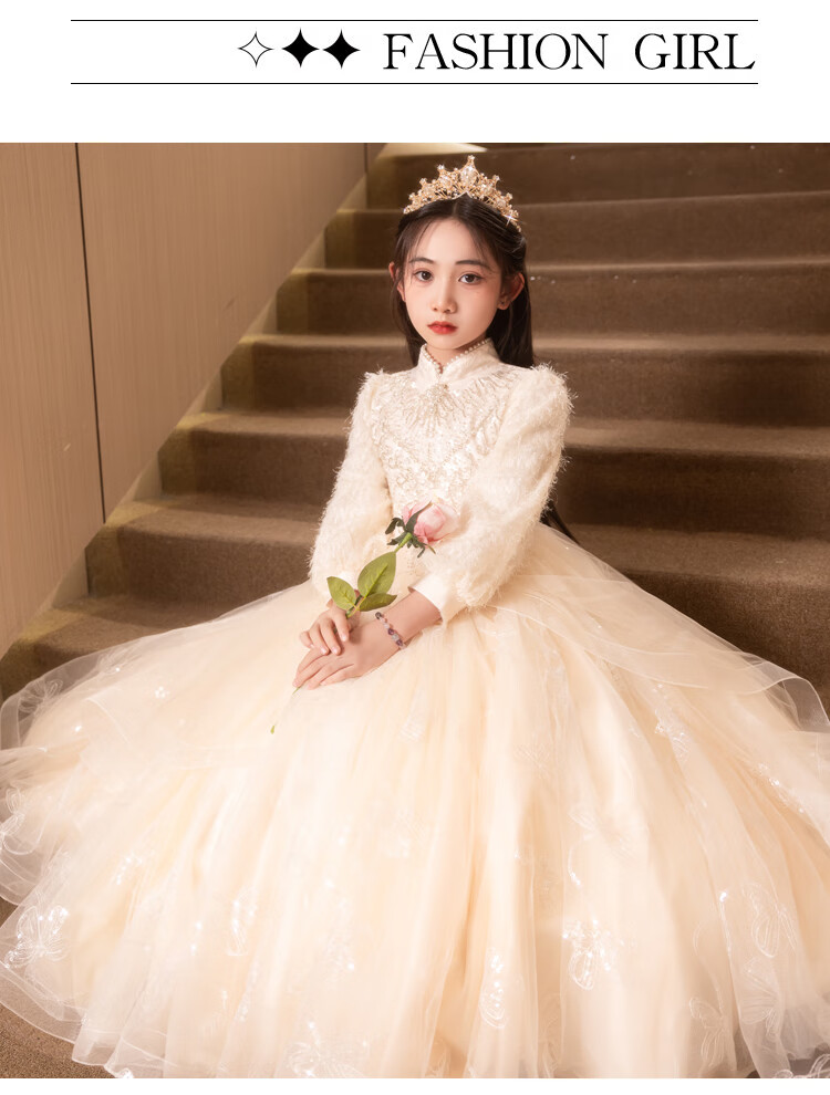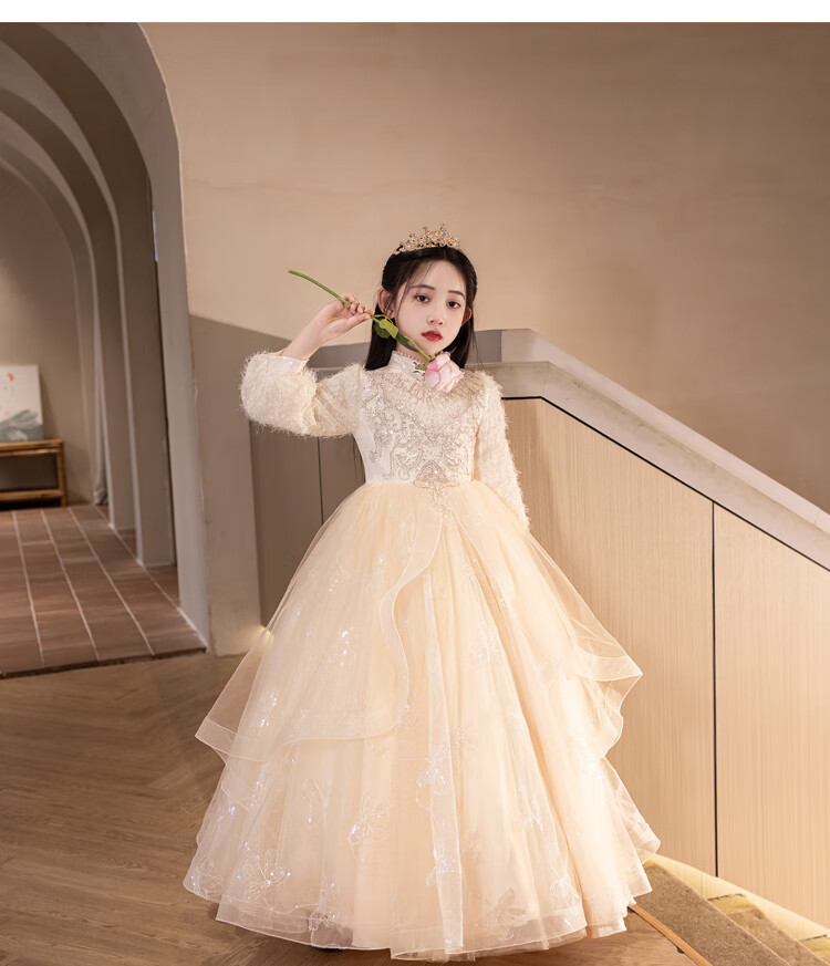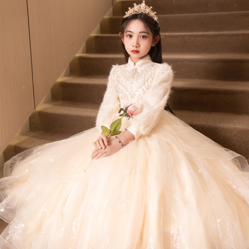 迪士尼(Disney)女童礼服主持人秋冬花童小女孩高端轻奢儿童生日公主裙钢琴出演服 1518长款香槟不加绒 关注送水晶皇冠 160 cm