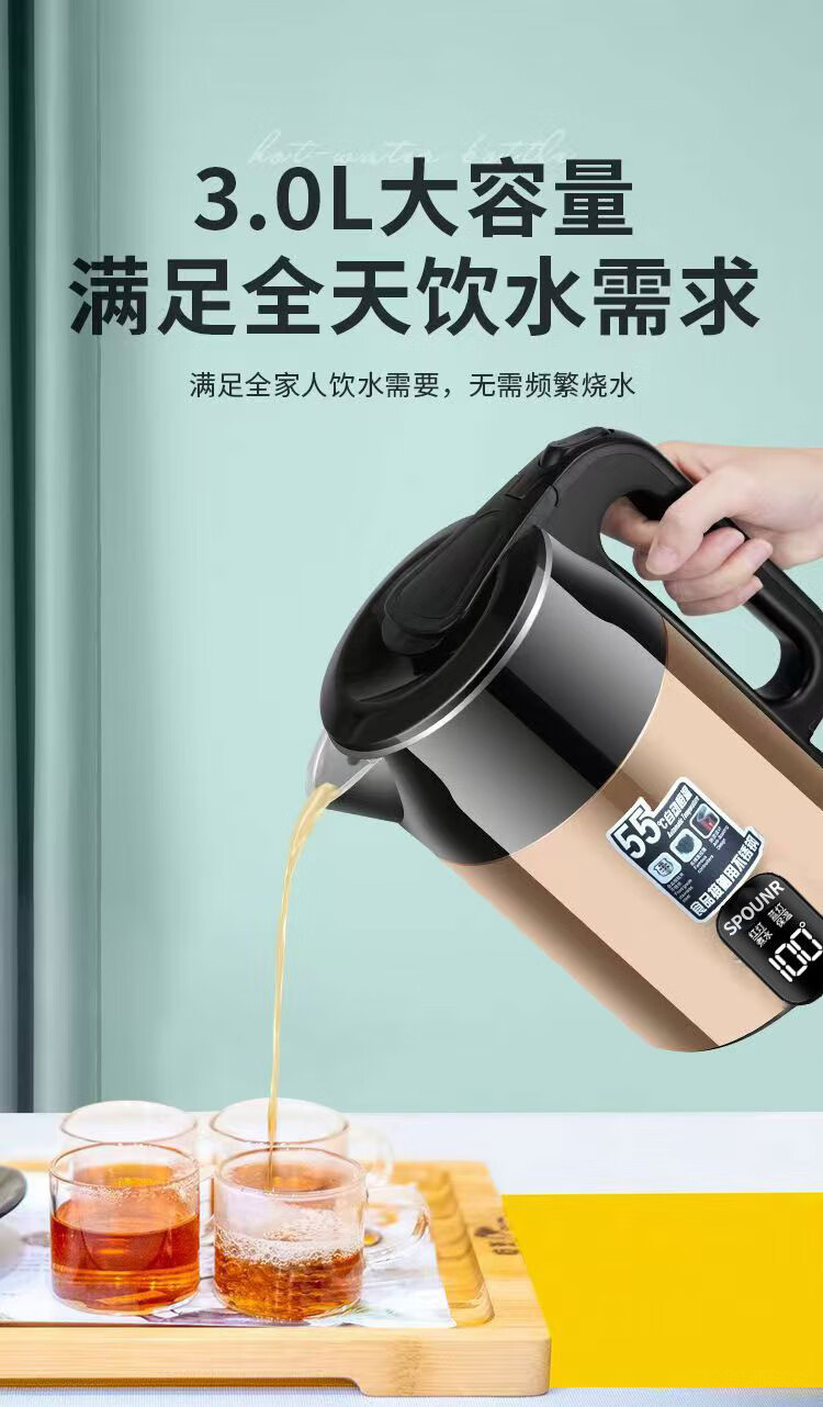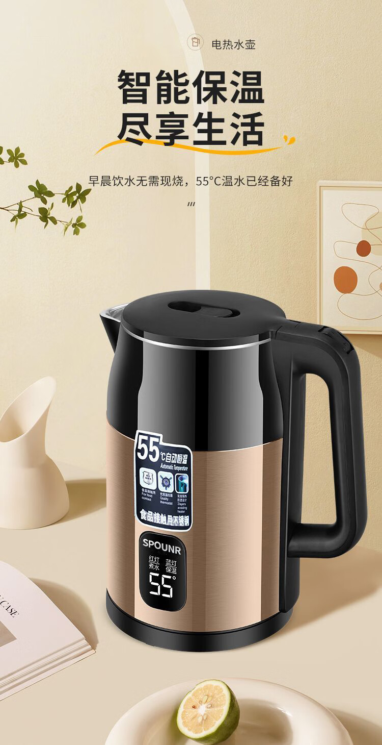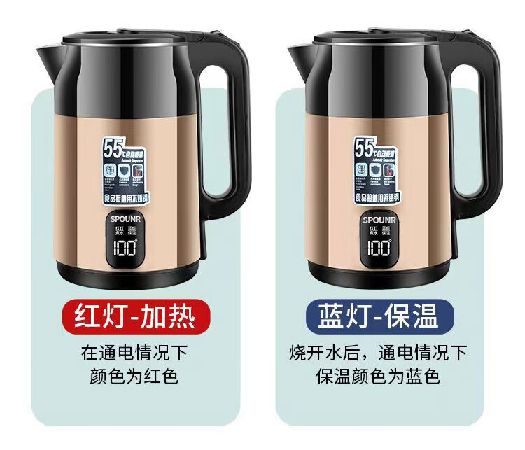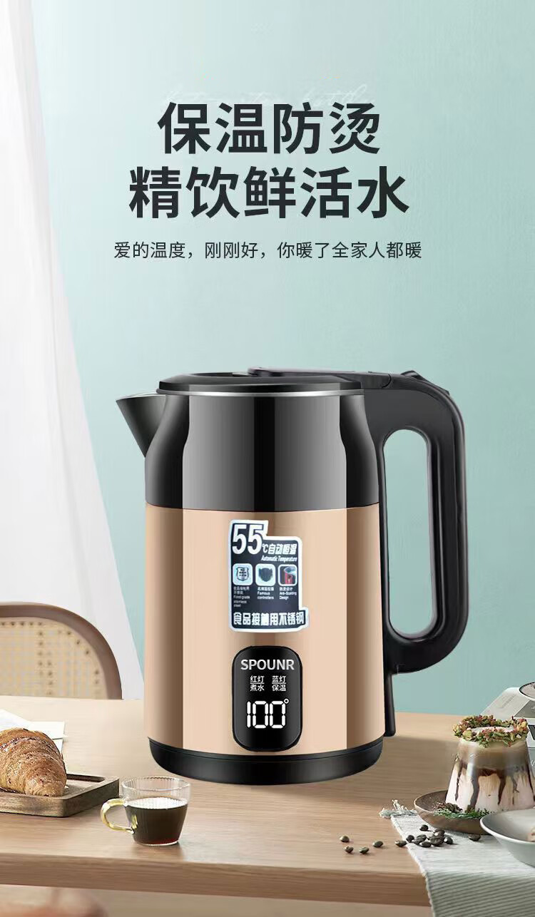 SPOUNR正品苏泊电热水壶家用304不锈钢烧水壶保温一体智能恒温开水壶 3L 金色彩钢【智能保温】 加厚内胆