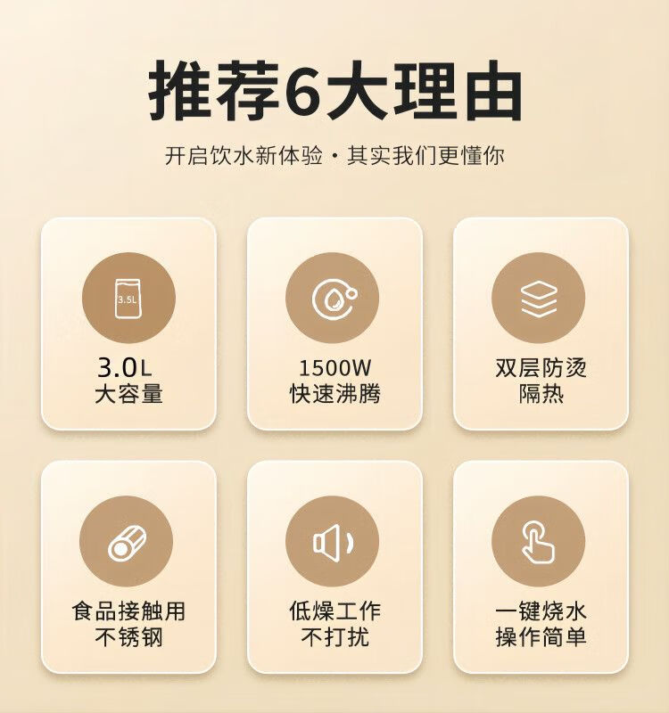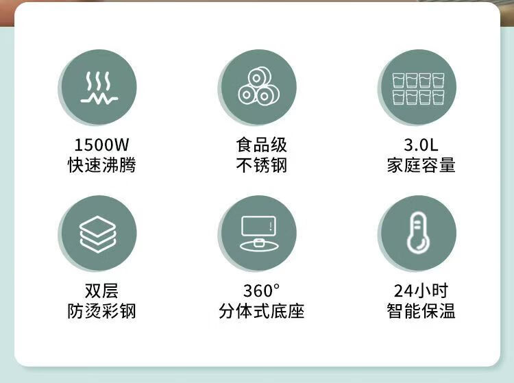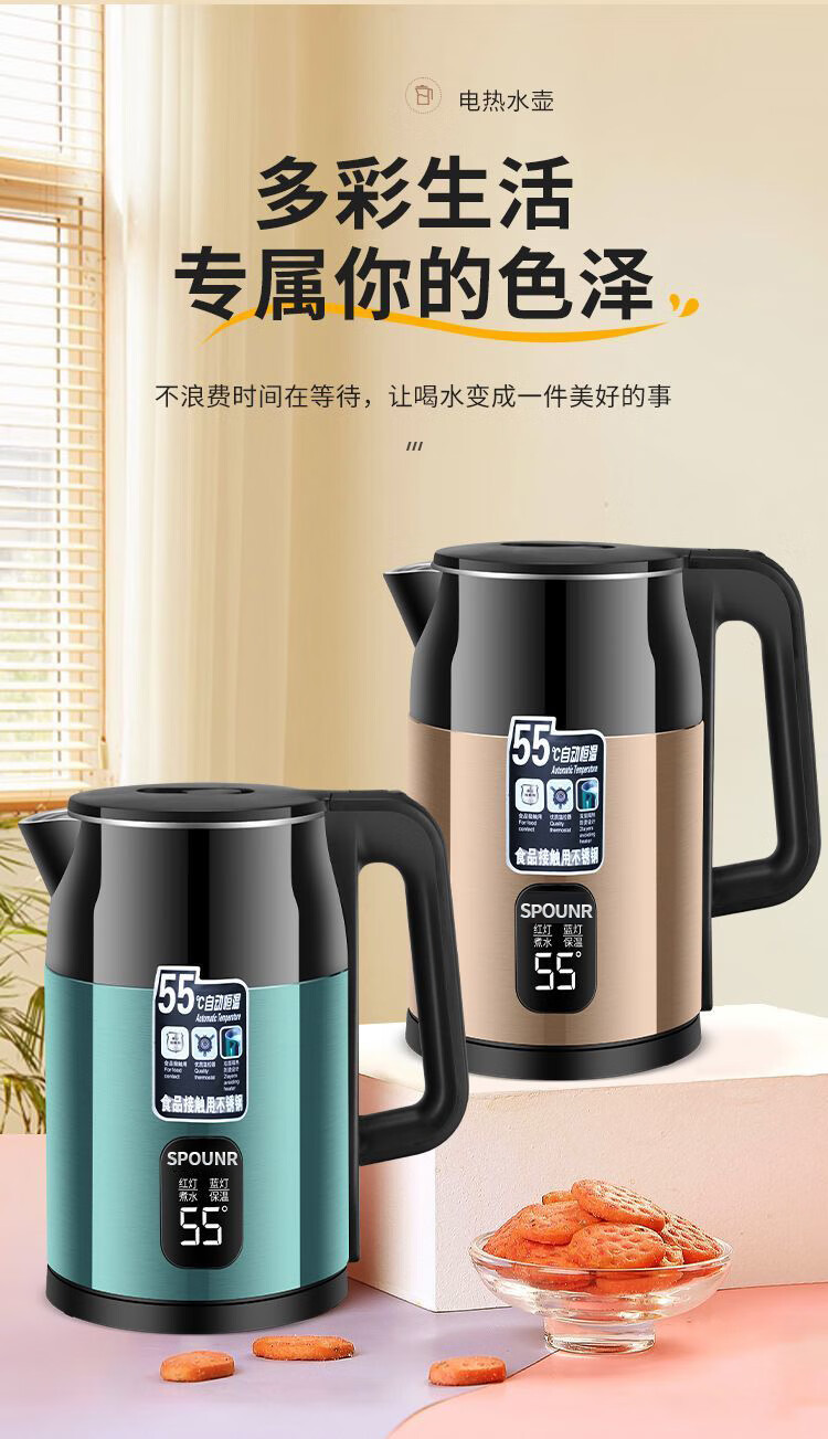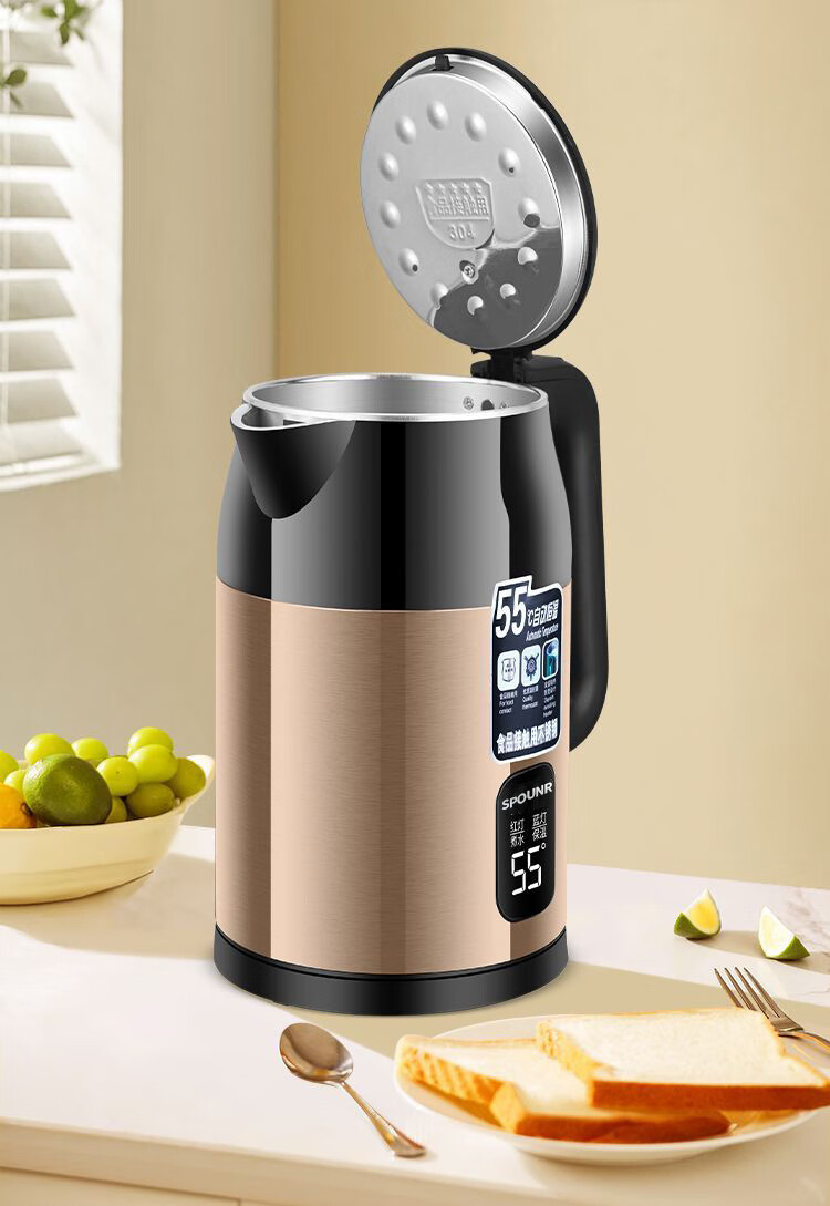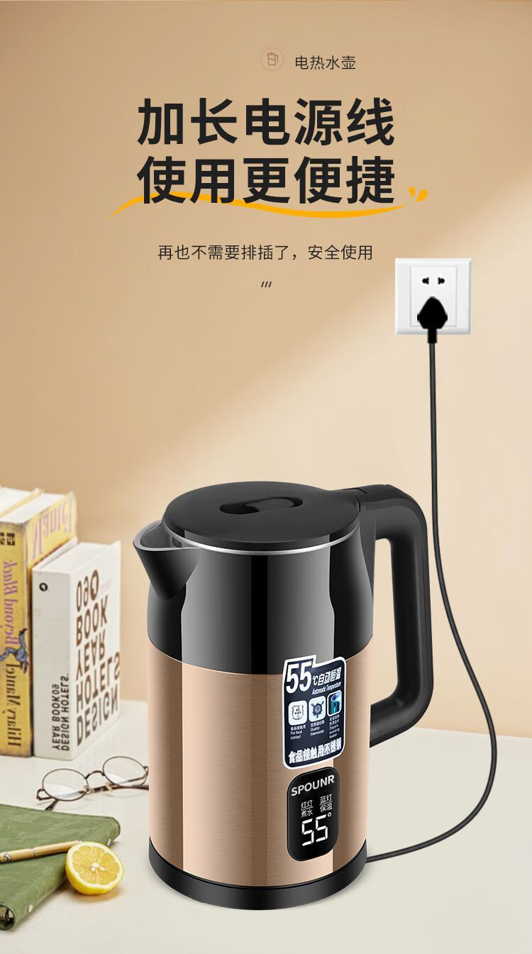 SPOUNR正品苏泊电热水壶家用304不锈钢烧水壶保温一体智能恒温开水壶 3L 金色彩钢【智能保温】 加厚内胆