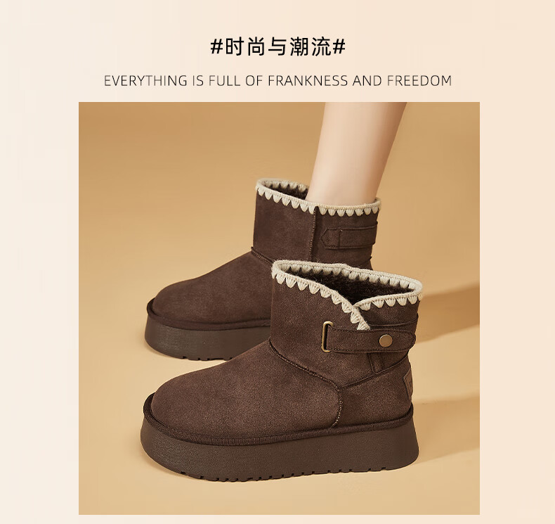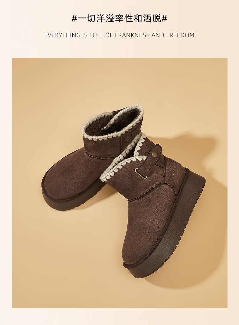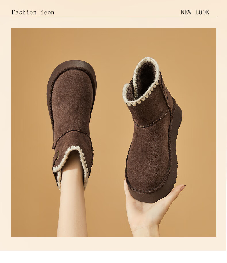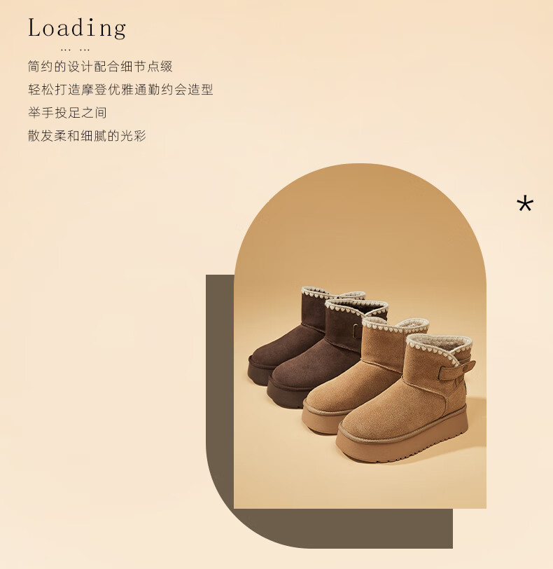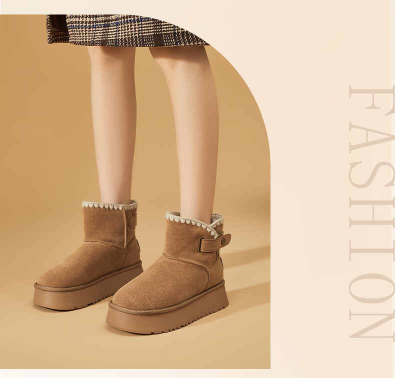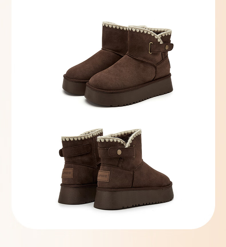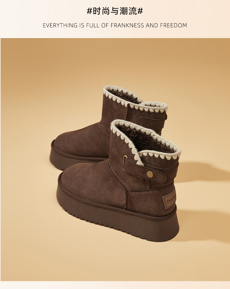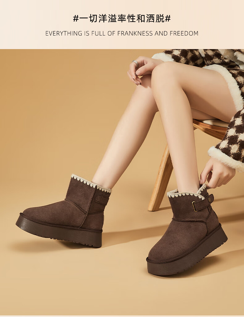 达芙妮雪地靴女冬季2025新款真皮羊毛一体厚底低帮编织防滑加厚短靴 棕色 36