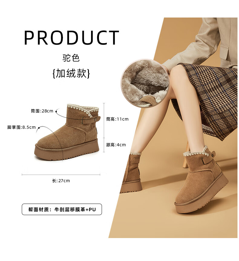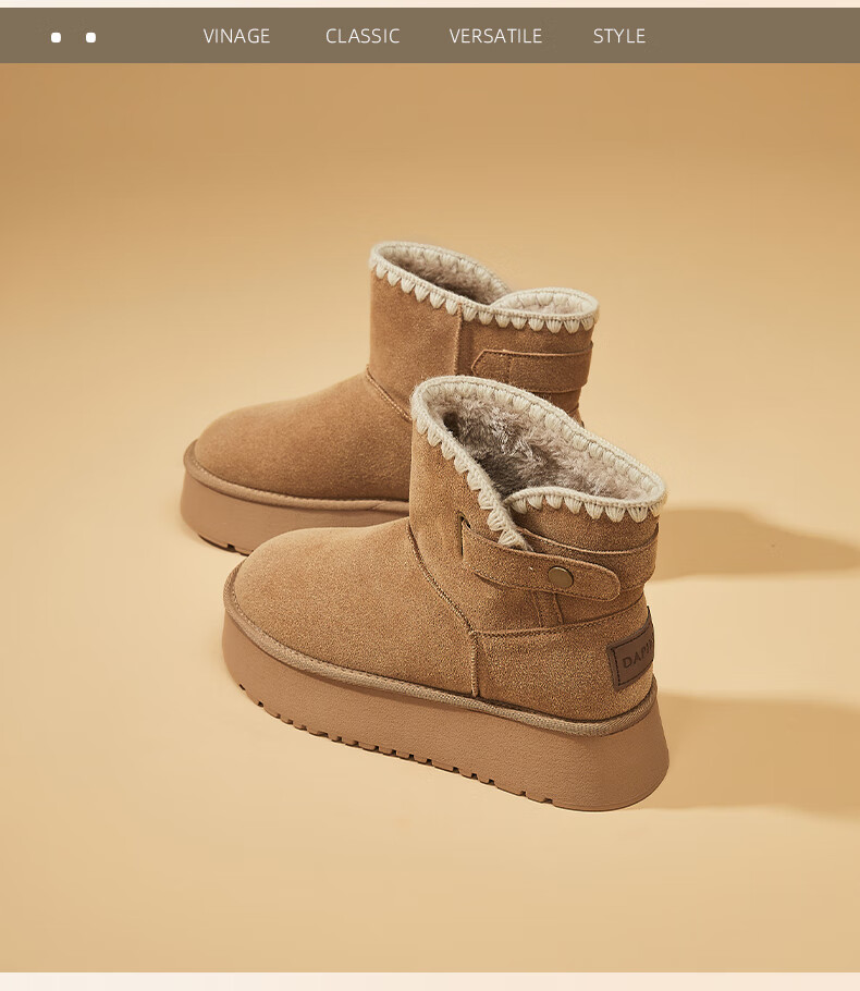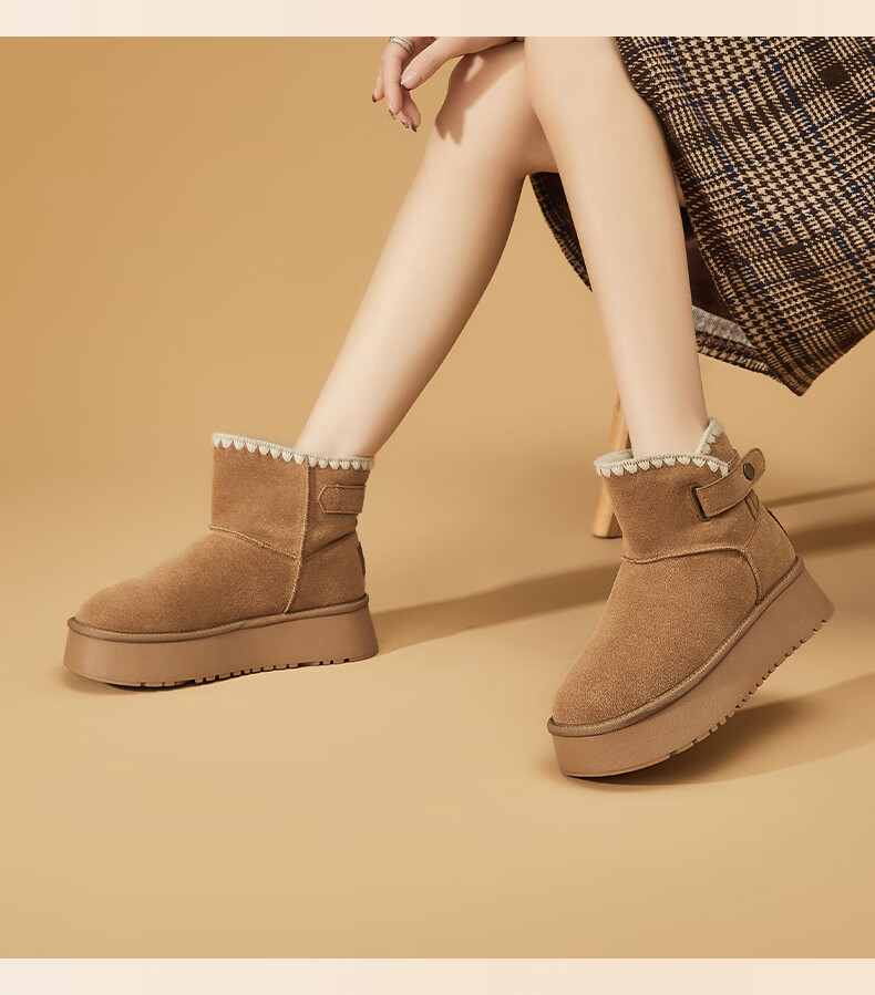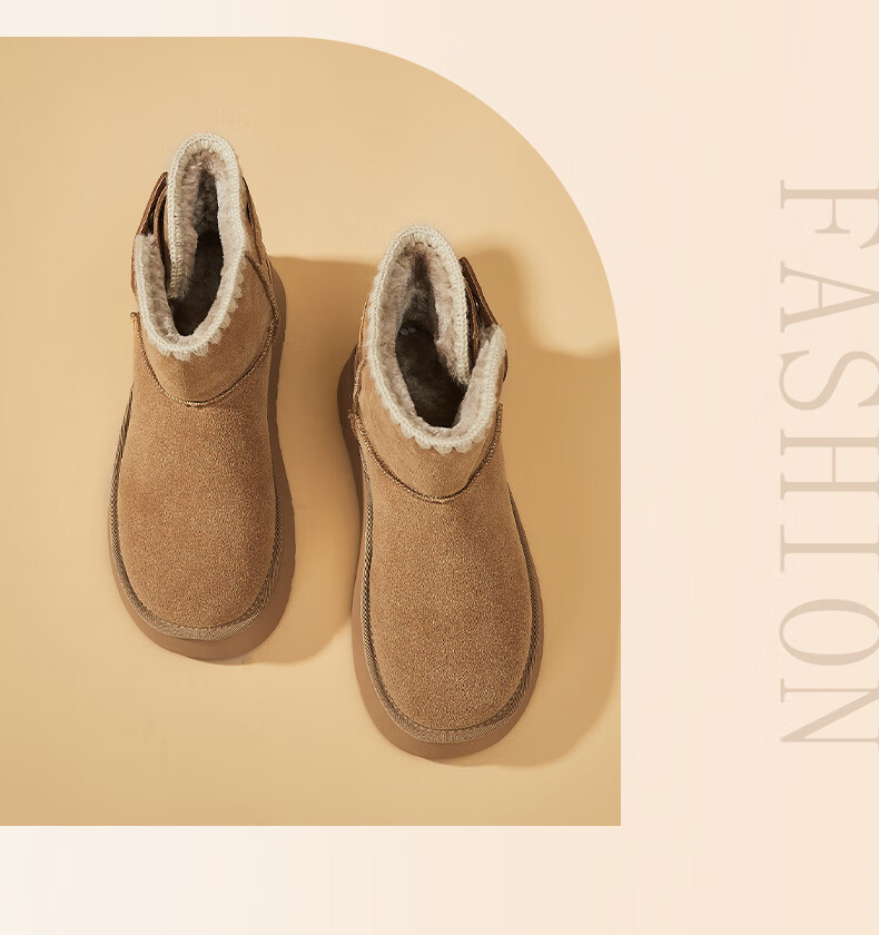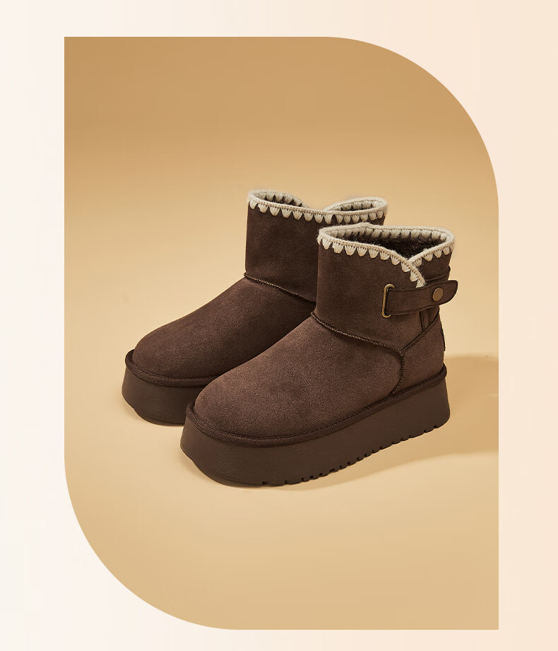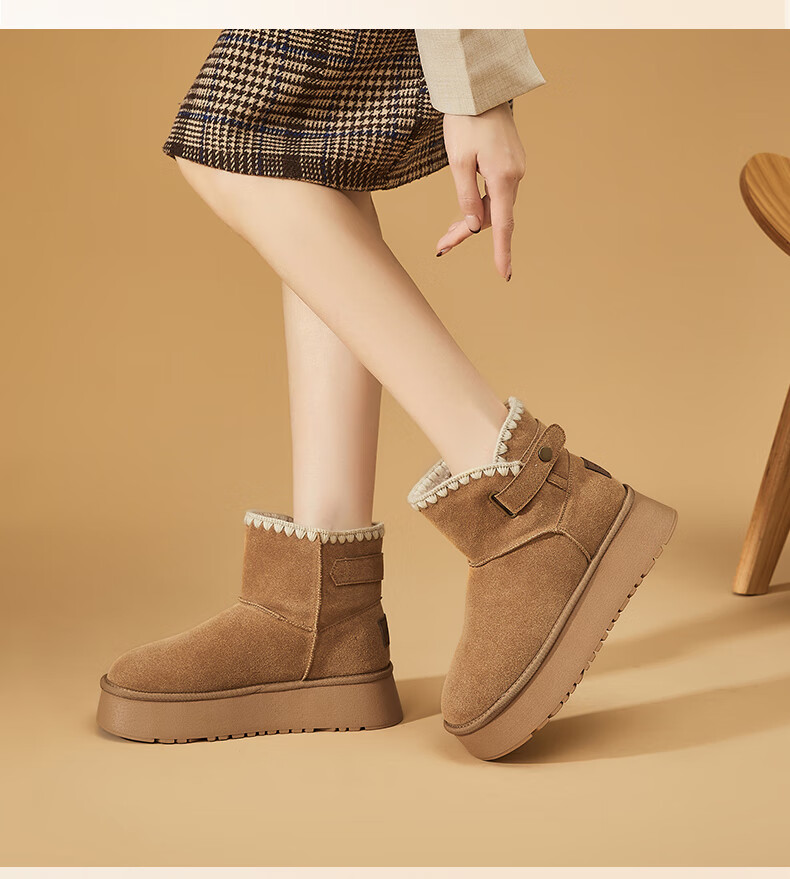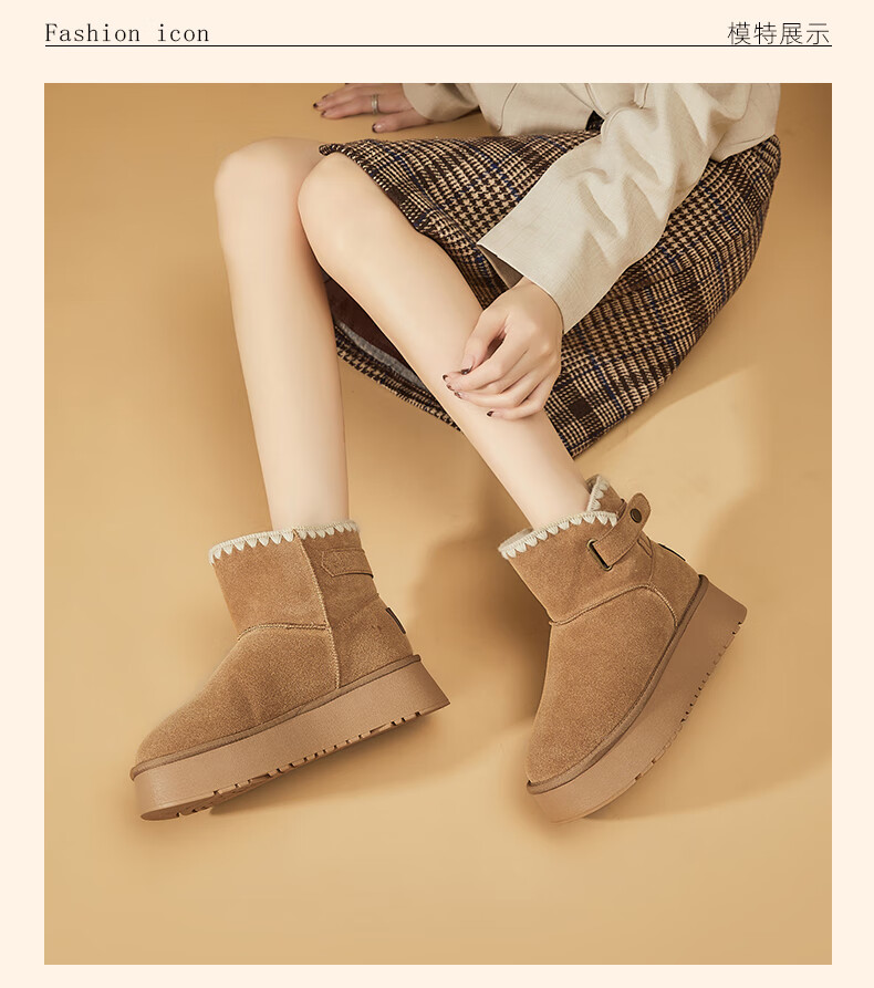 达芙妮雪地靴女冬季2025新款真皮羊毛一体厚底低帮编织防滑加厚短靴 棕色 36