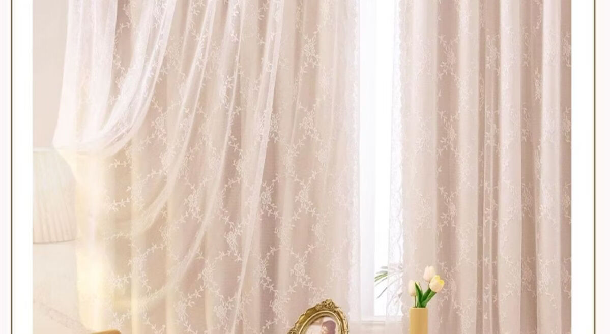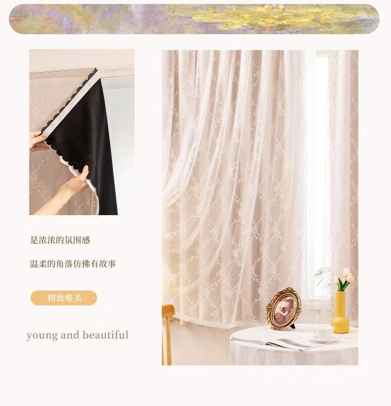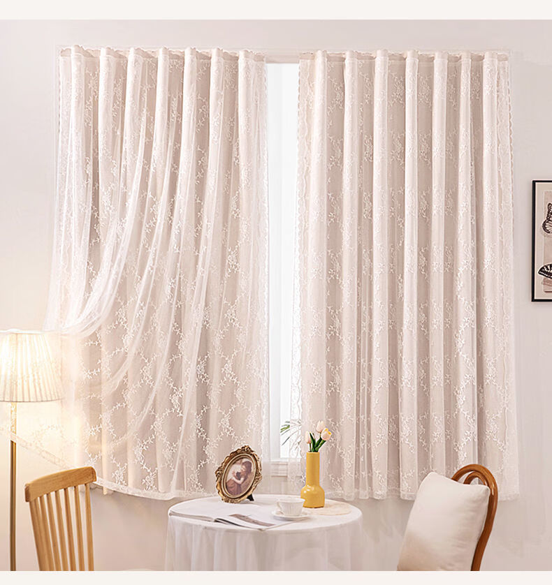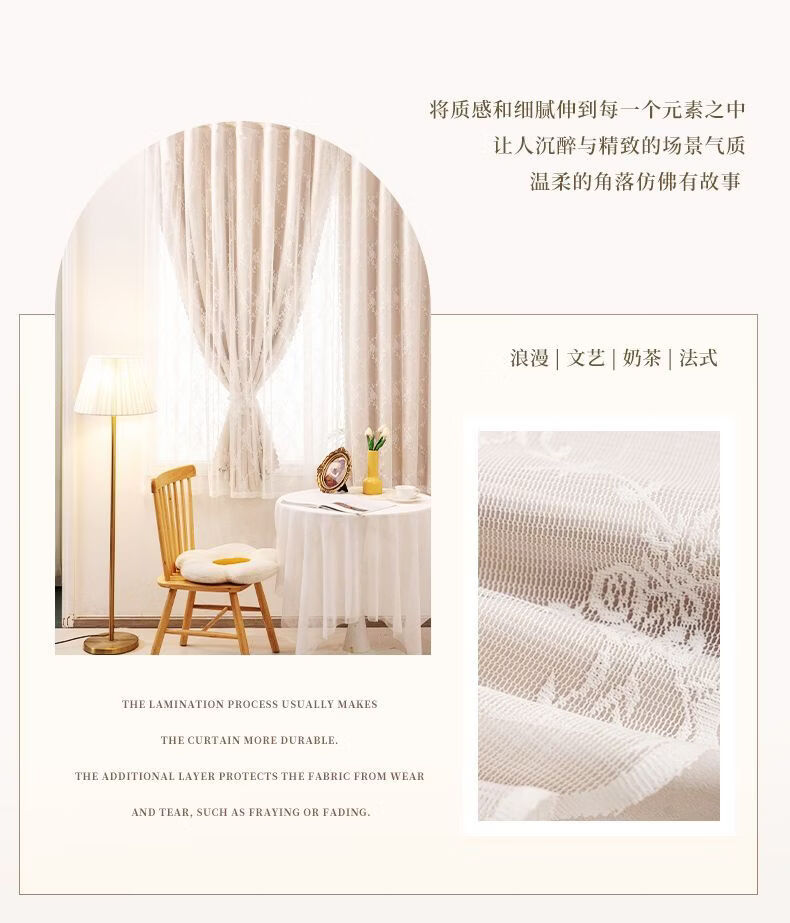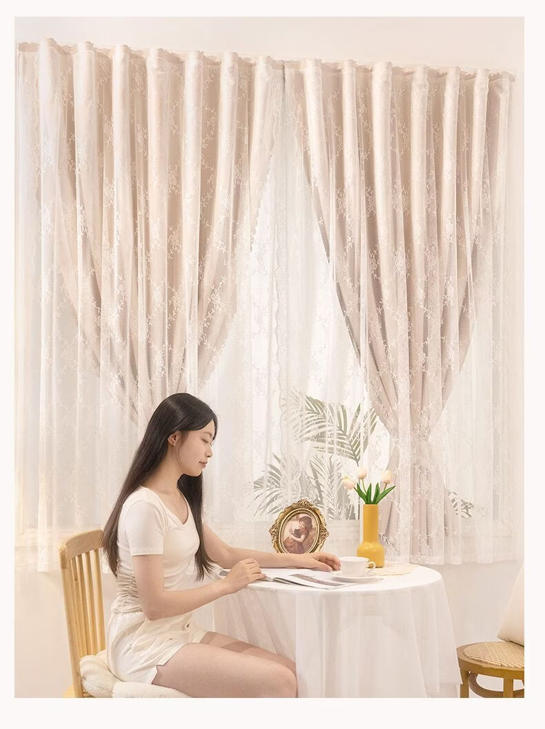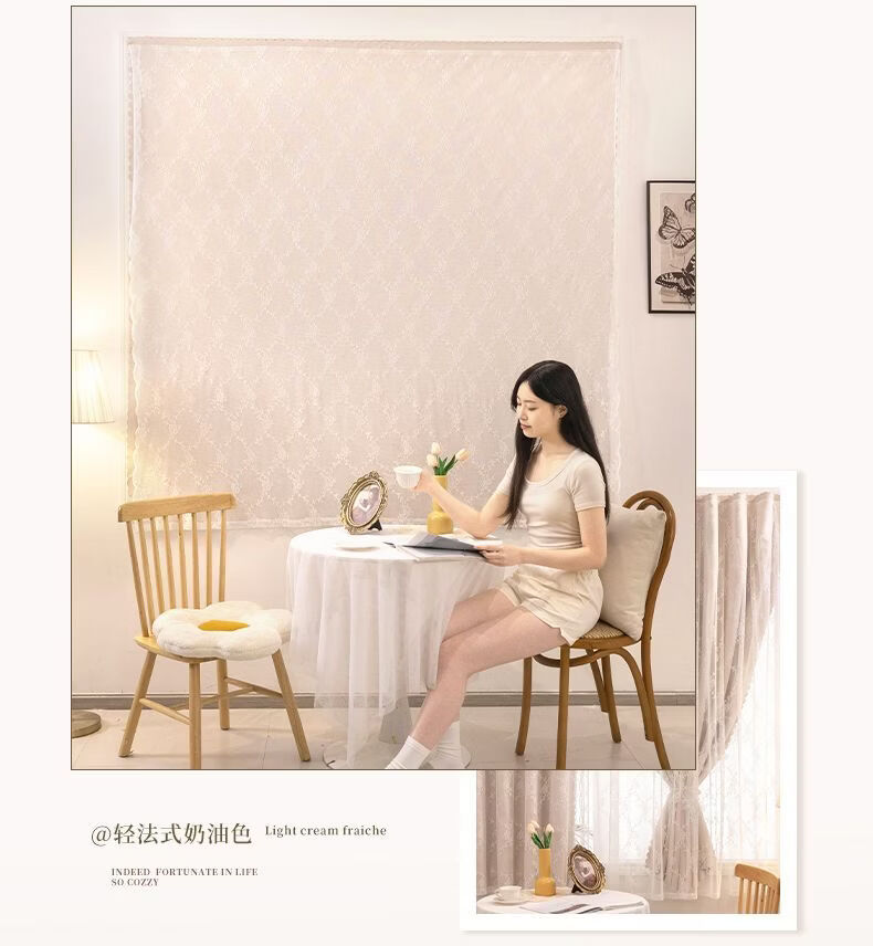 高睿2026新款法式蕾丝双层魔术贴窗帘全遮光飘窗阳台女生窗帘免打孔 芝士奶油【帘纱一体】100%全遮光 宽0.9m*高1.5m【1片】