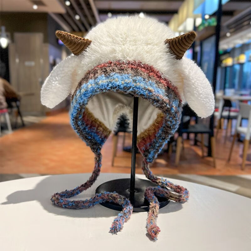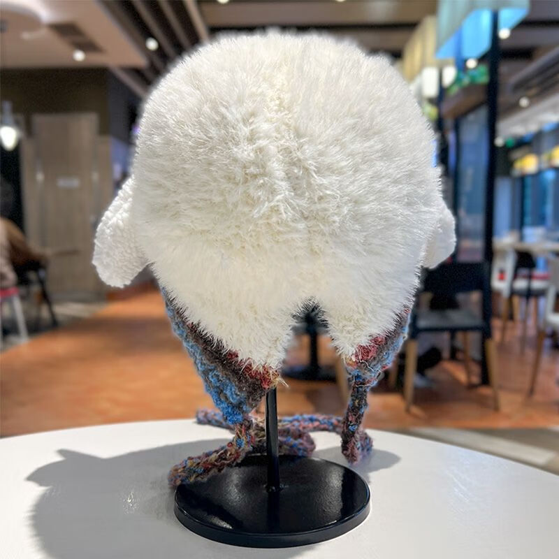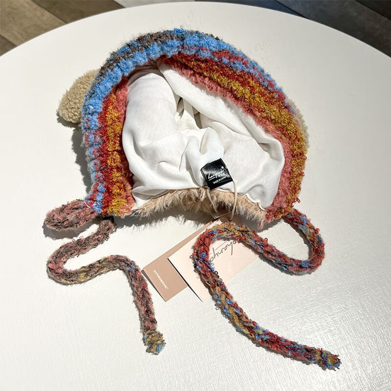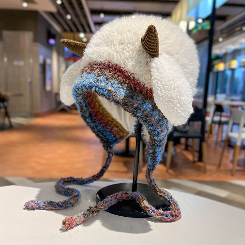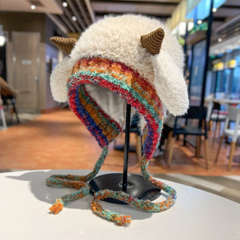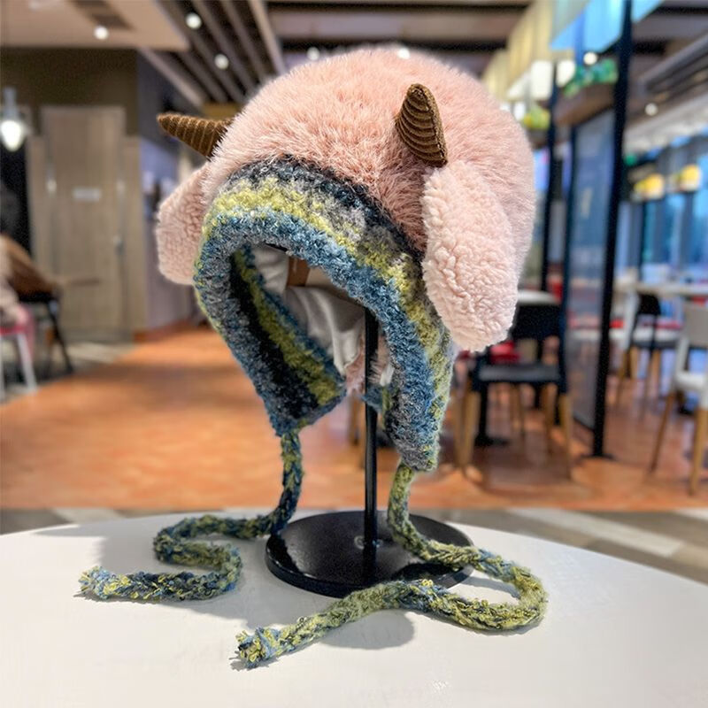 新款毛绒帽子女冬季显脸小雷锋帽加绒加厚女士大头围民族风辫子帽 米色