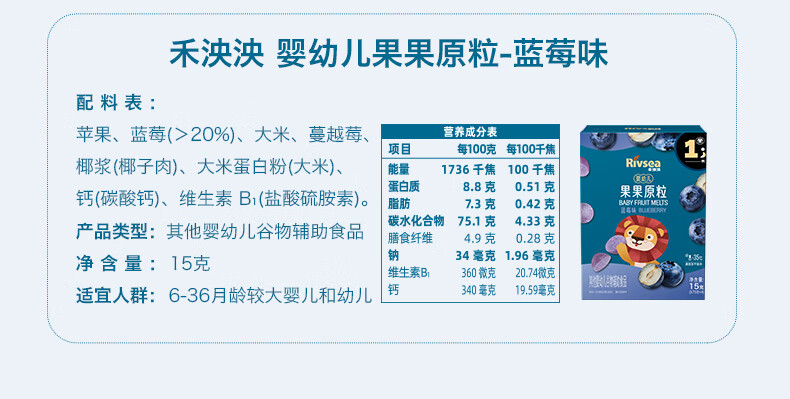 禾泱泱婴幼儿果果原粒蓝莓味15g高钙宝宝零食小巧练抓握6月+