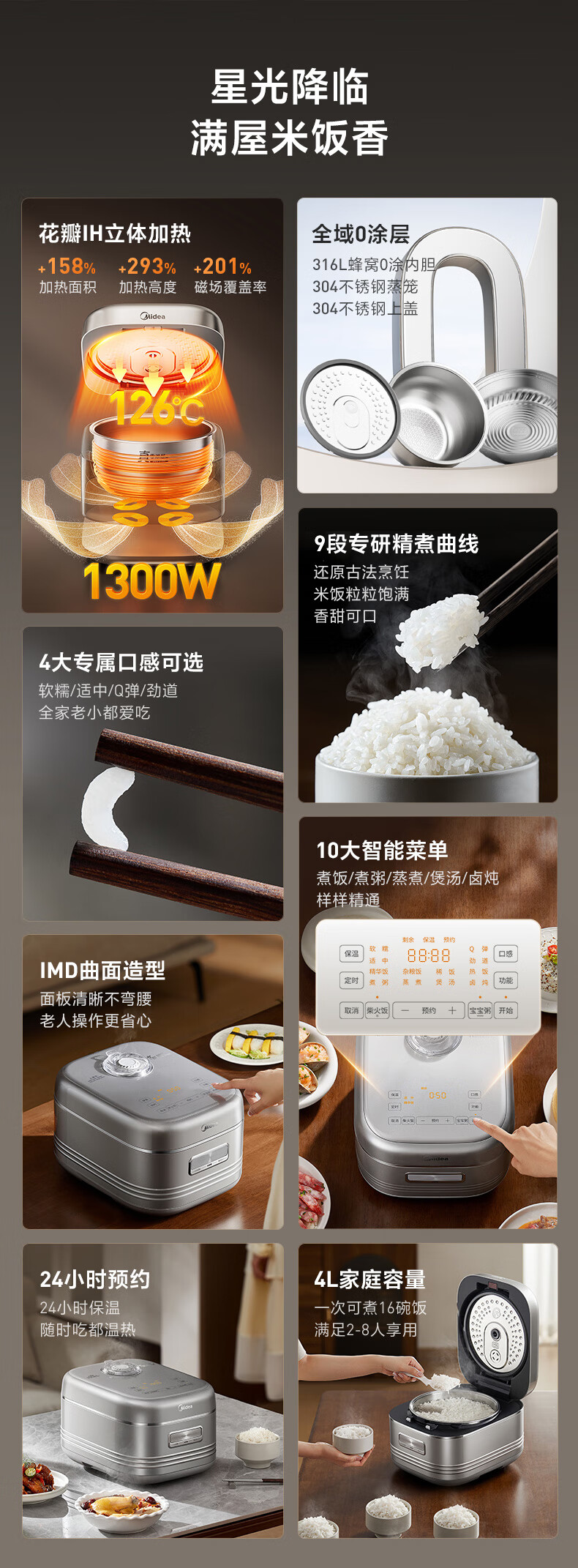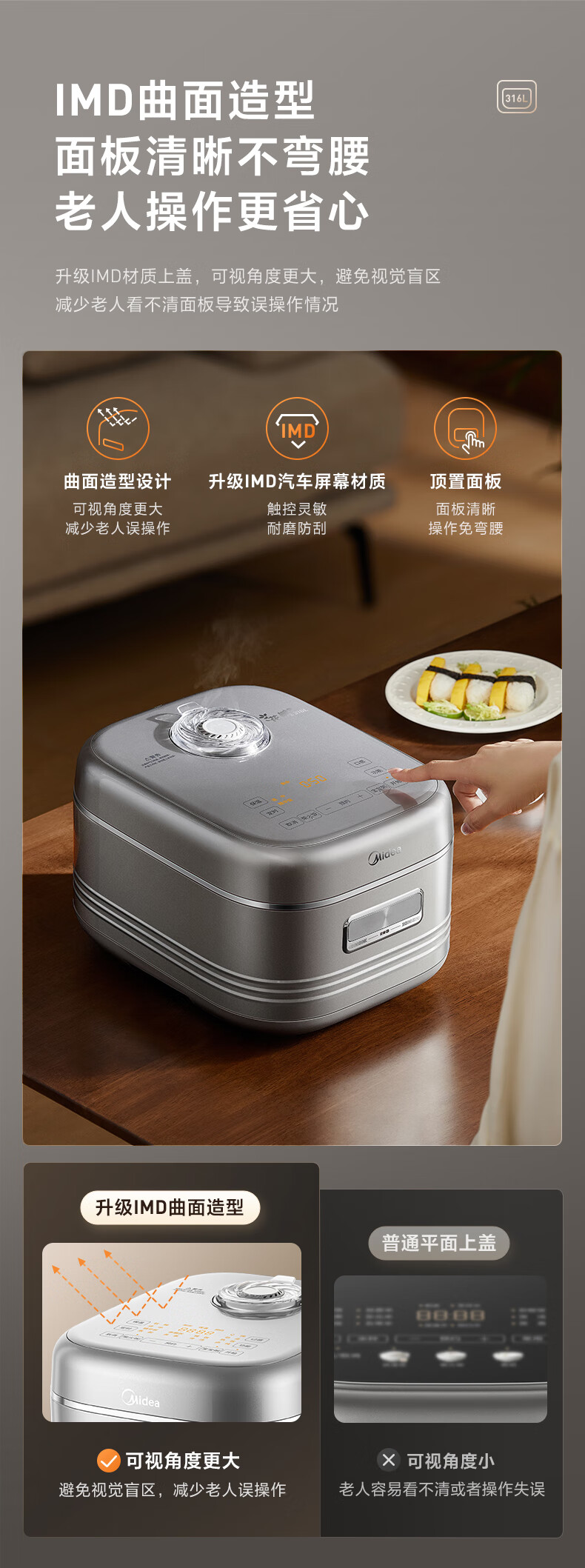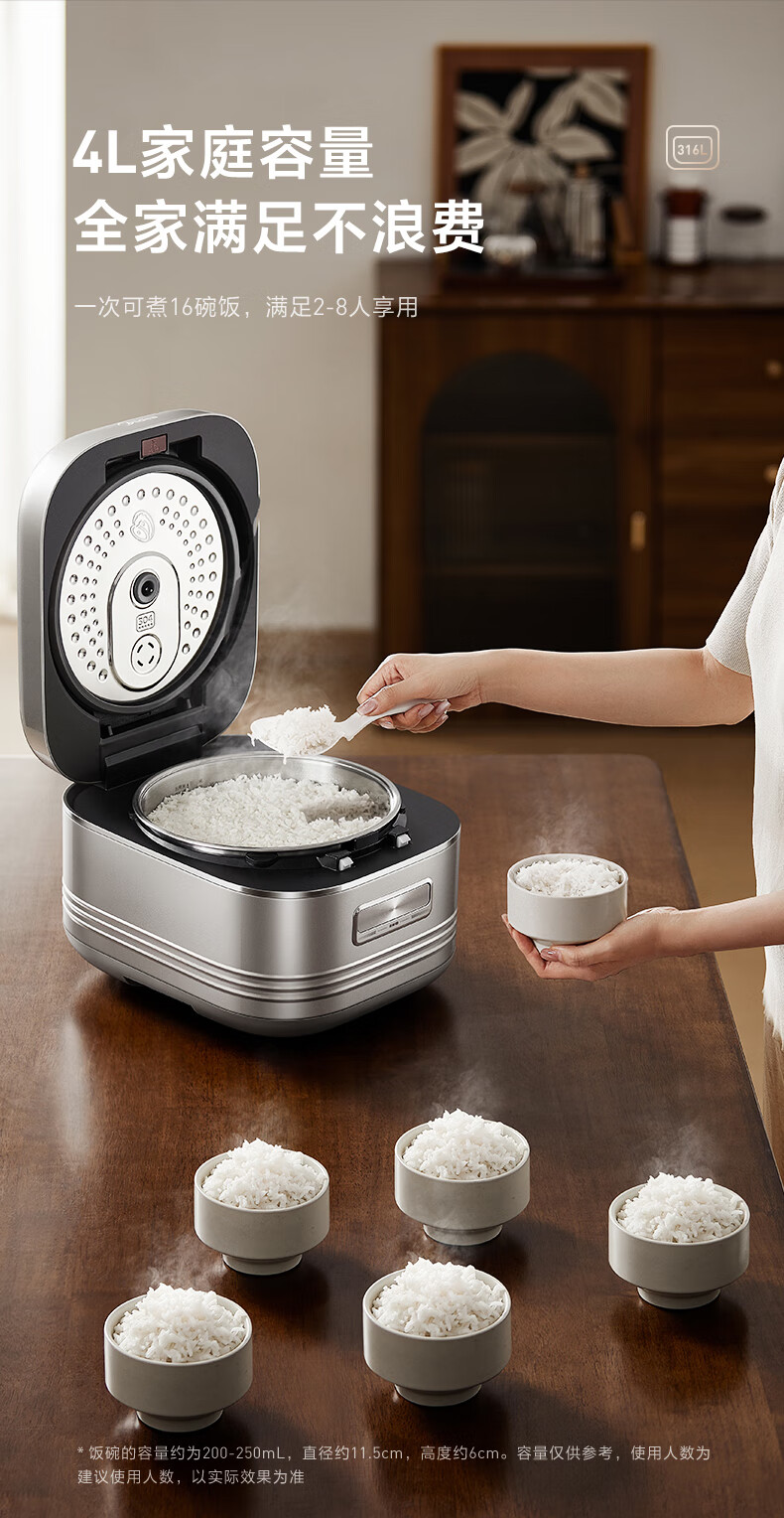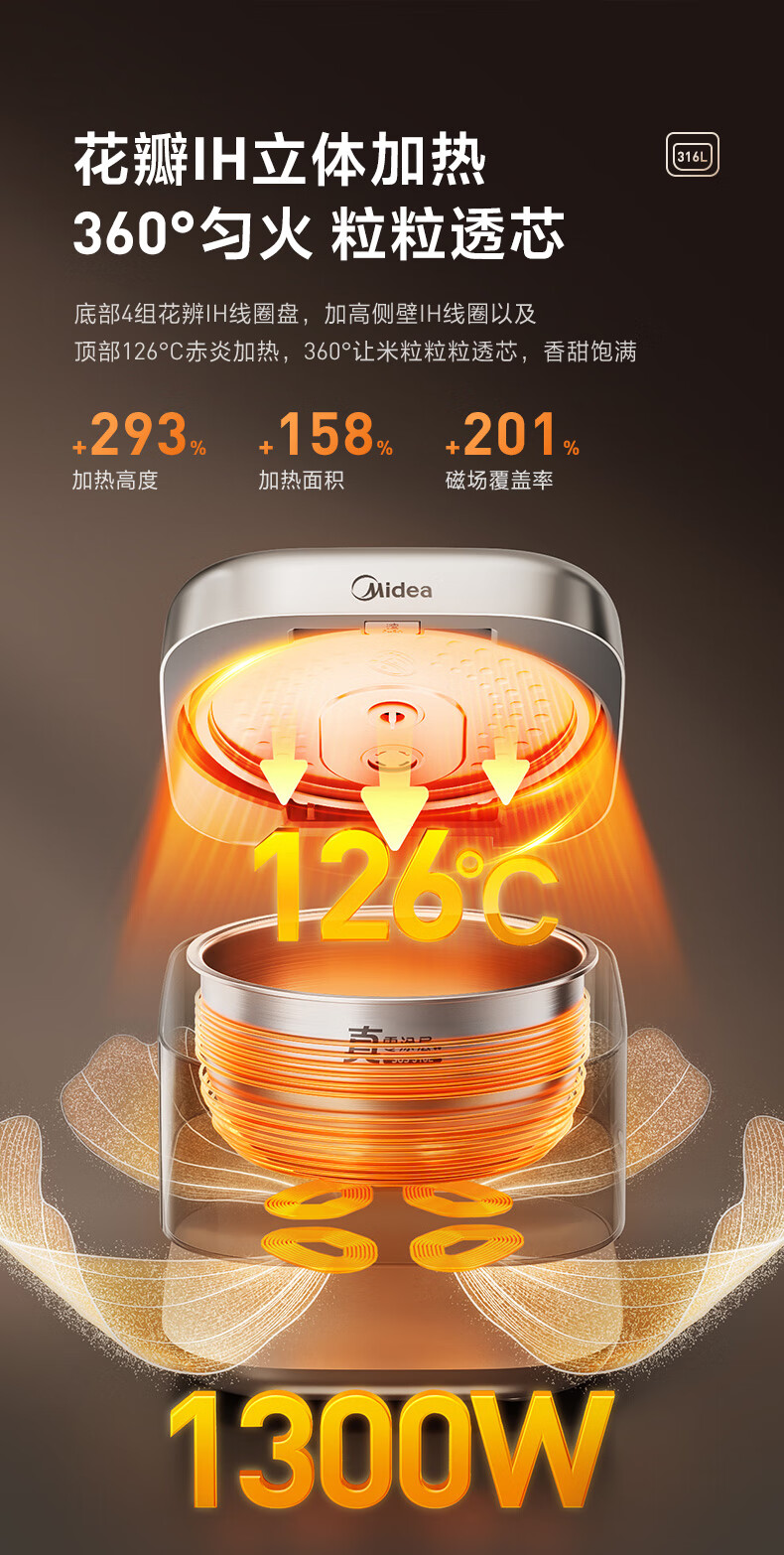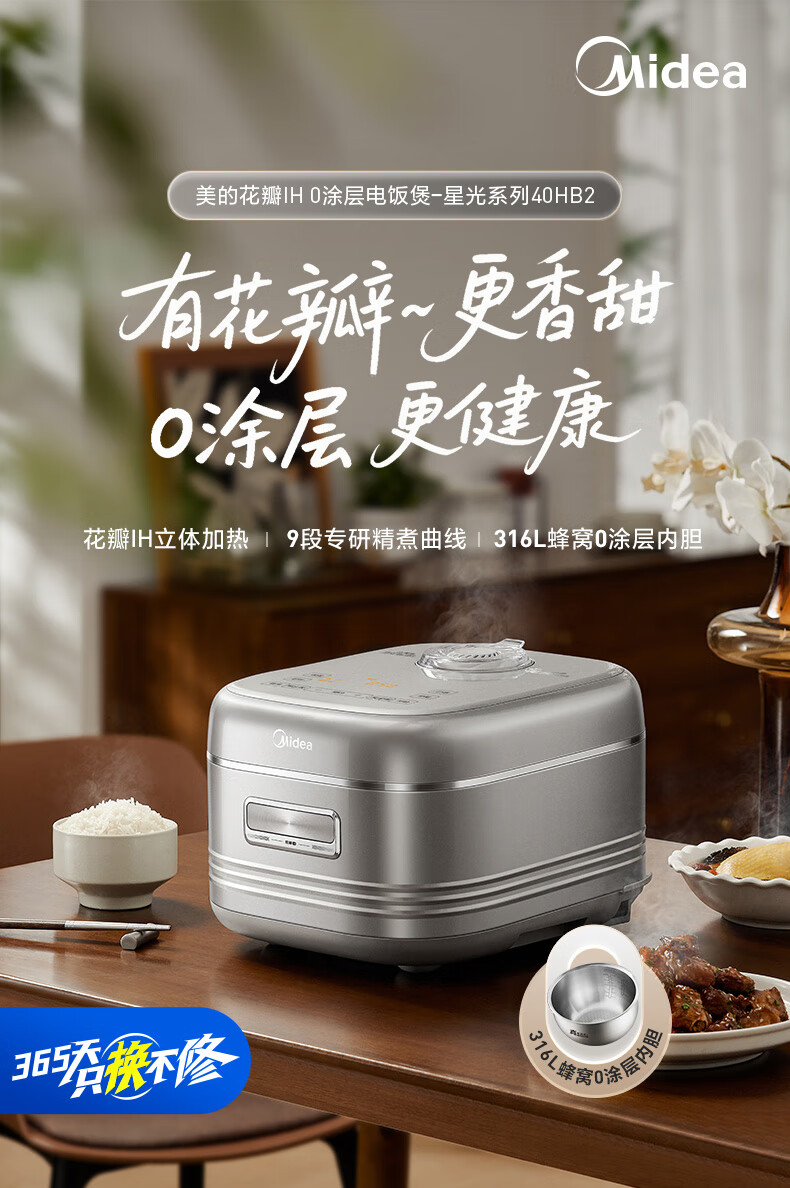 美的(Midea)电饭煲 花瓣IH 3-4-5-6人0涂层低压电饭锅 无涂层 家用316不锈钢内胆小米粥智能多功能 【316不锈钢0涂层内胆】MB-40HB2 4L
