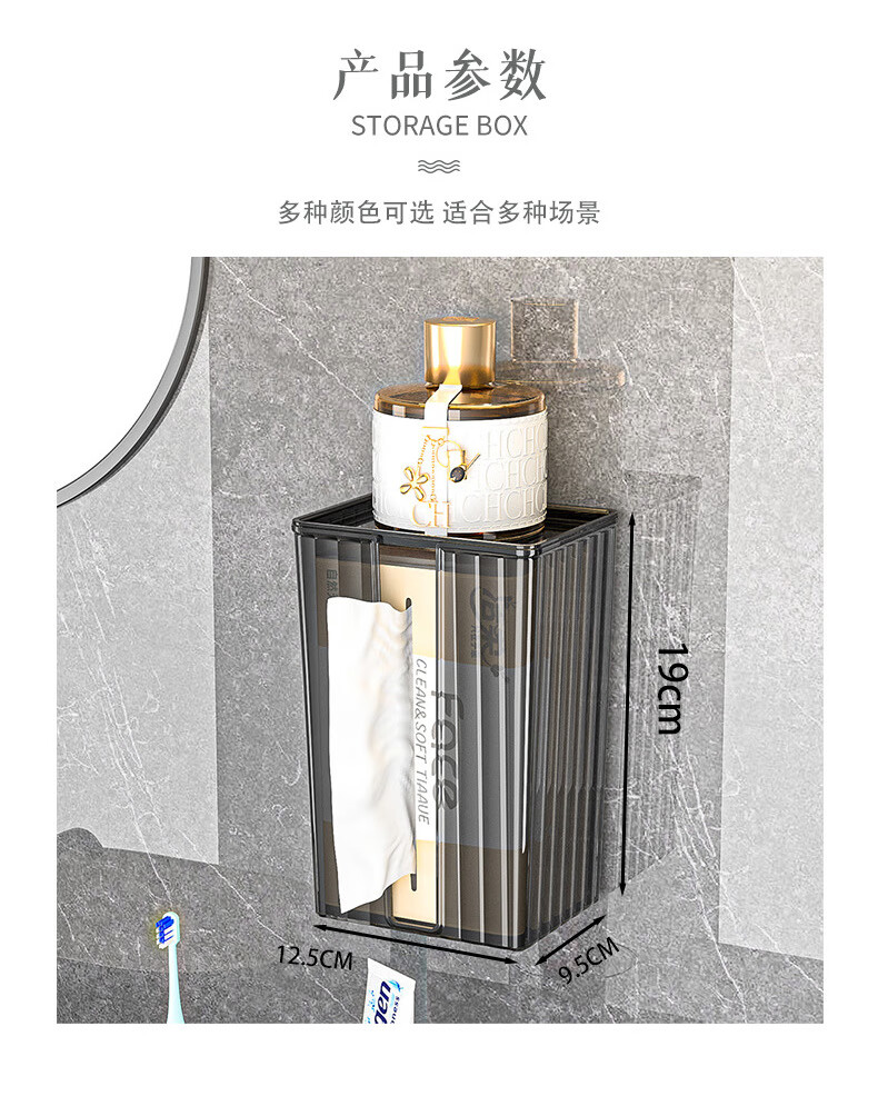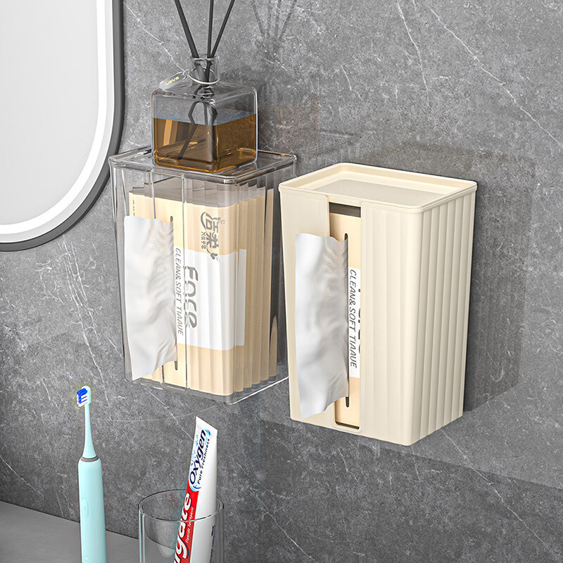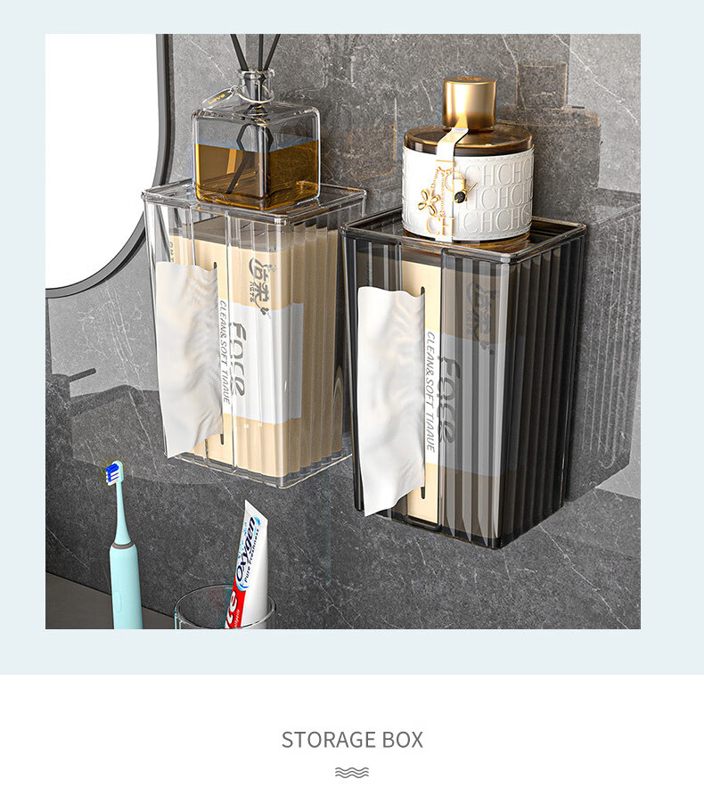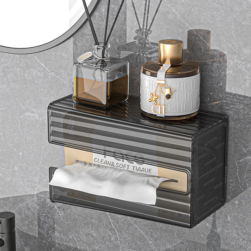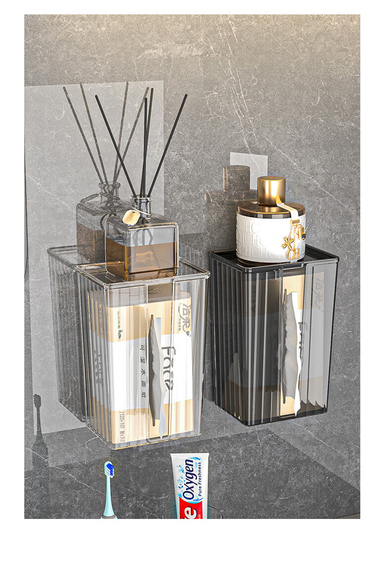 【直发】纸巾盒壁挂式免打孔抽纸盒卫生间厕所防水洗脸巾轻奢收纳 透灰 带盖