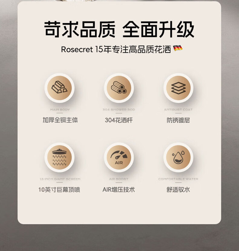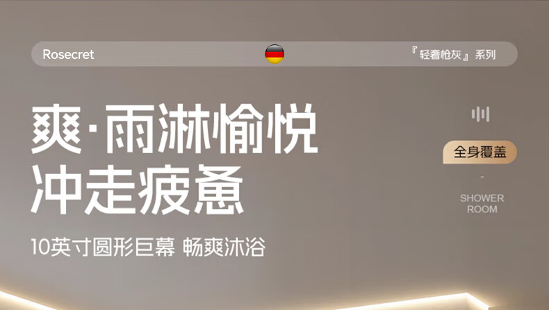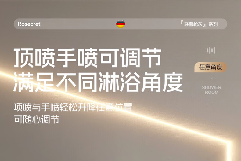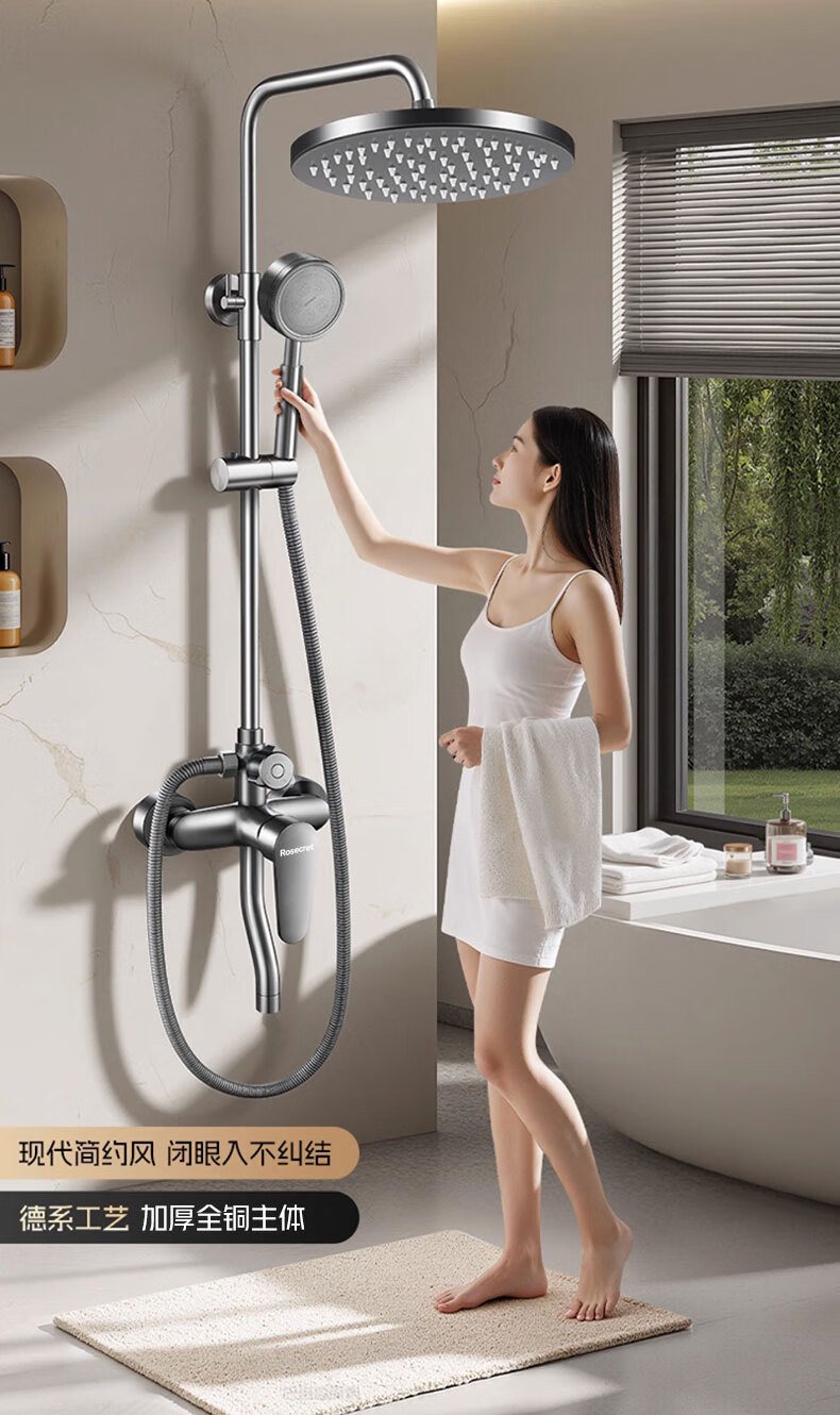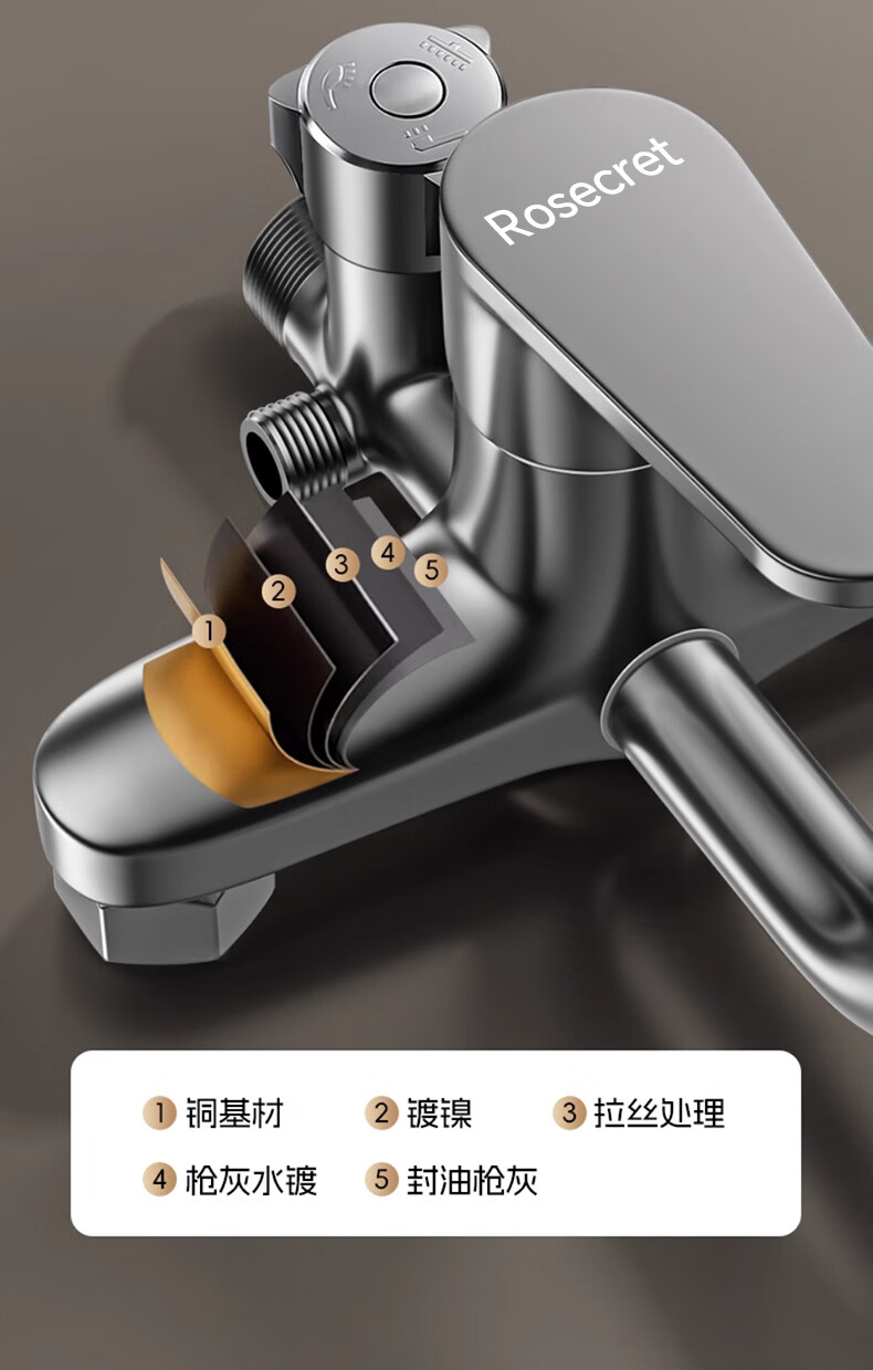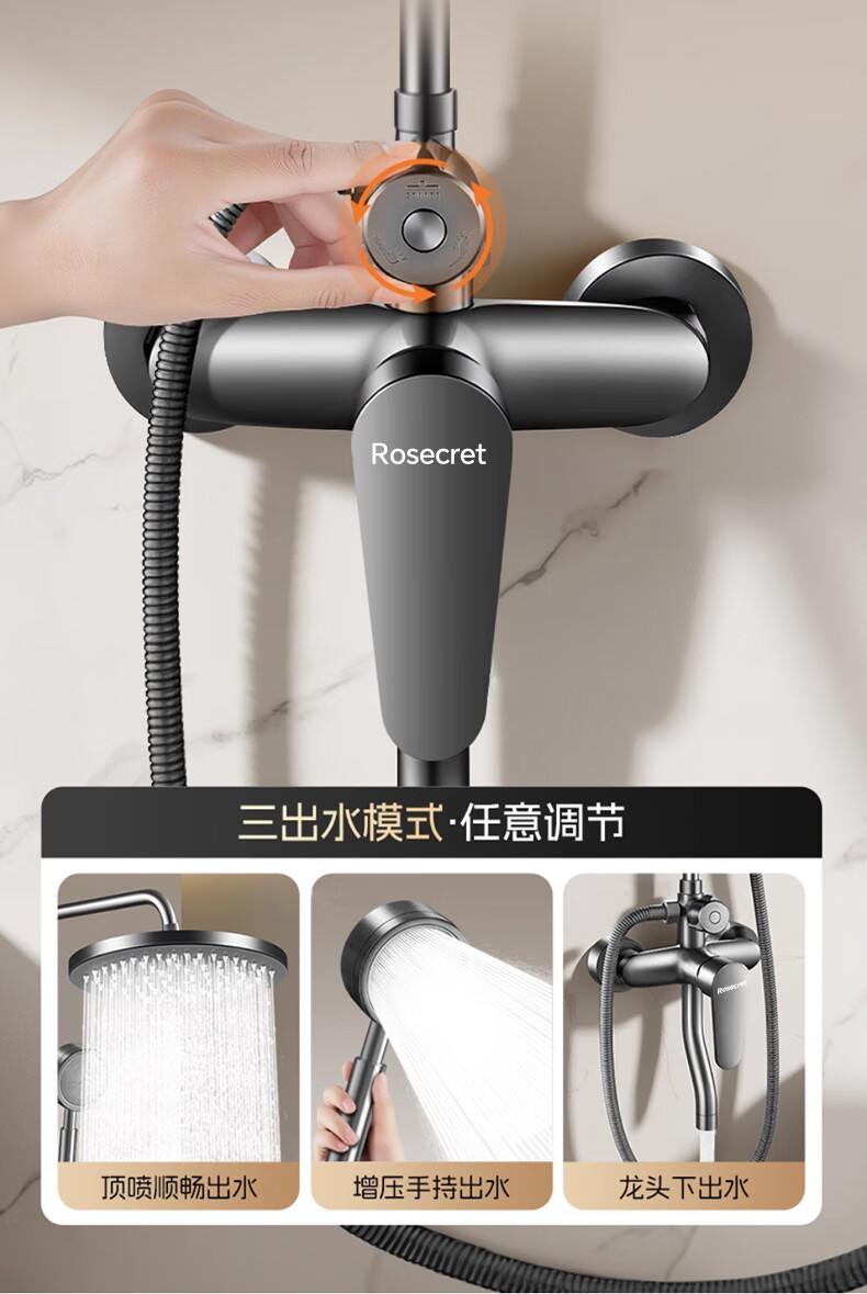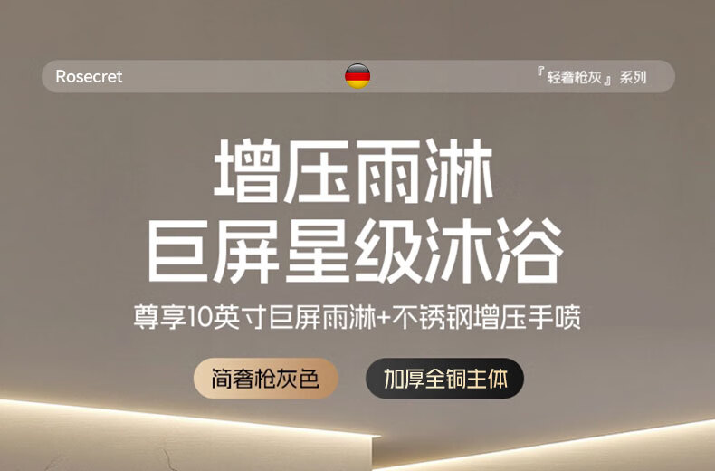 Rosecret【德国】全铜主体淋浴花洒套装家用卫生间洗澡带顶喷全套一整套装 三档混水阀+304手喷+巨幕顶喷【枪灰】 增压雨淋丨过滤净水丨配安装件包