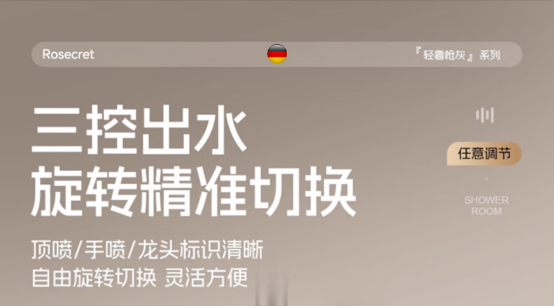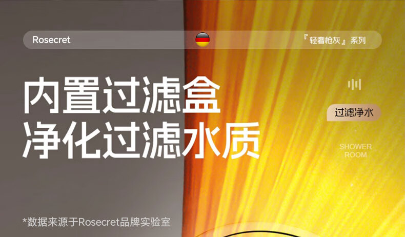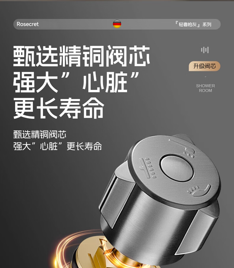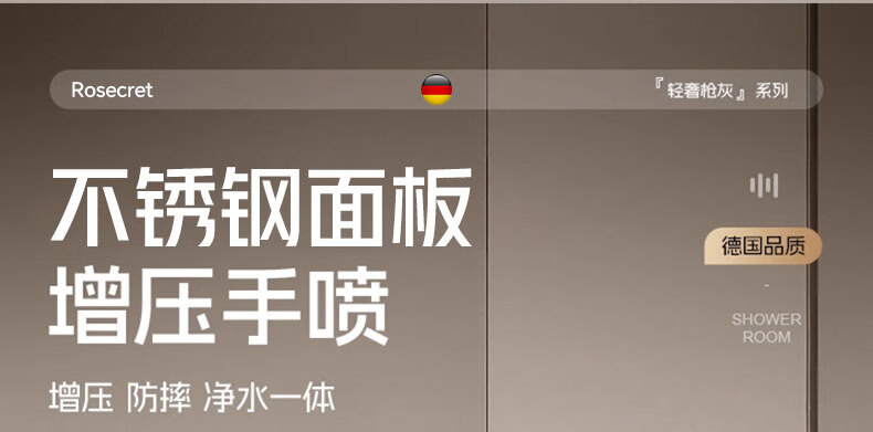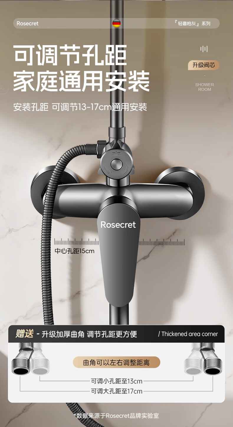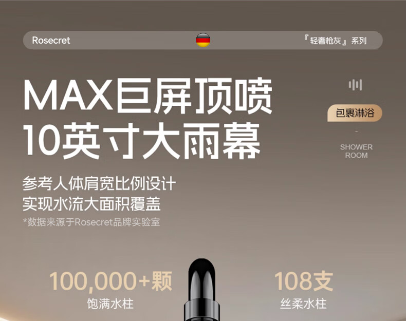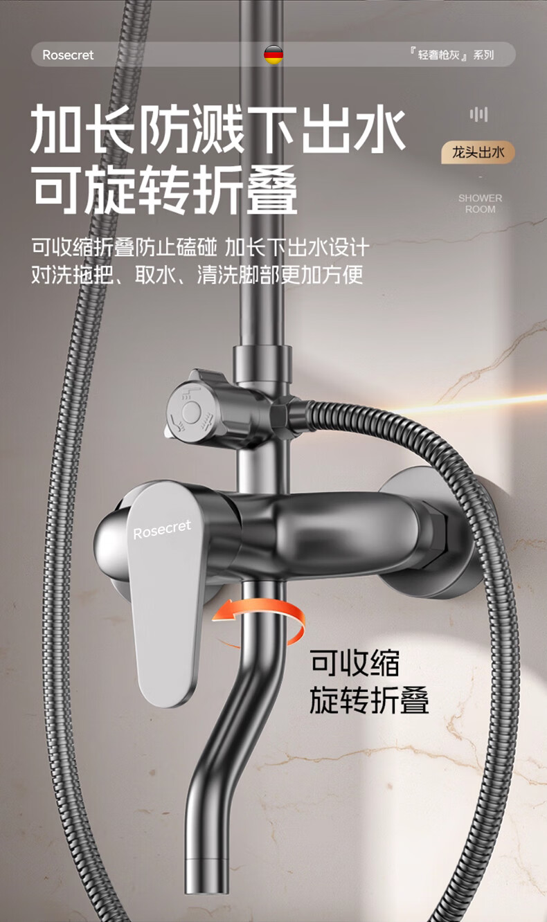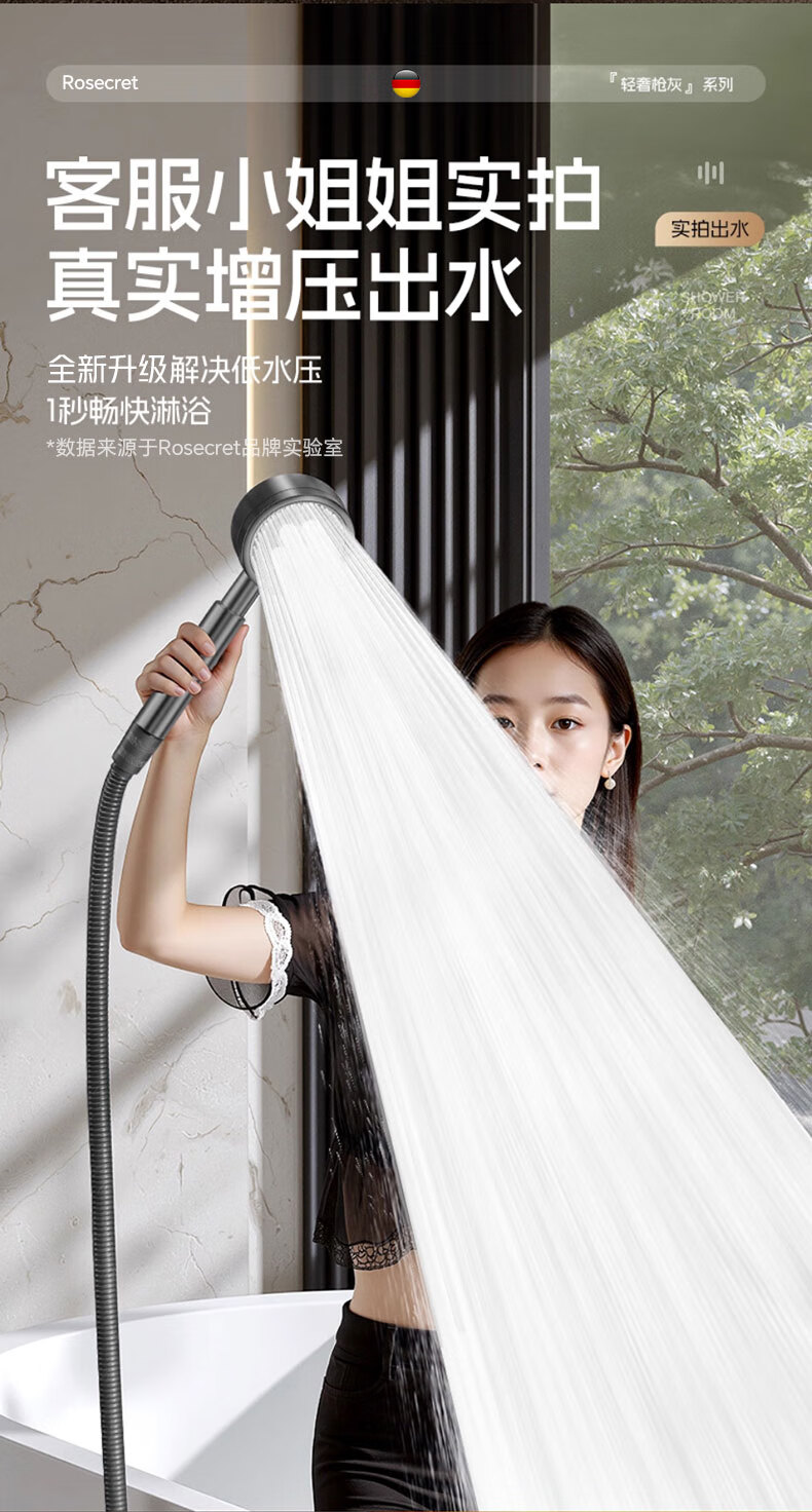 Rosecret【德国】全铜主体淋浴花洒套装家用卫生间洗澡带顶喷全套一整套装 三档混水阀+304手喷+巨幕顶喷【枪灰】 增压雨淋丨过滤净水丨配安装件包