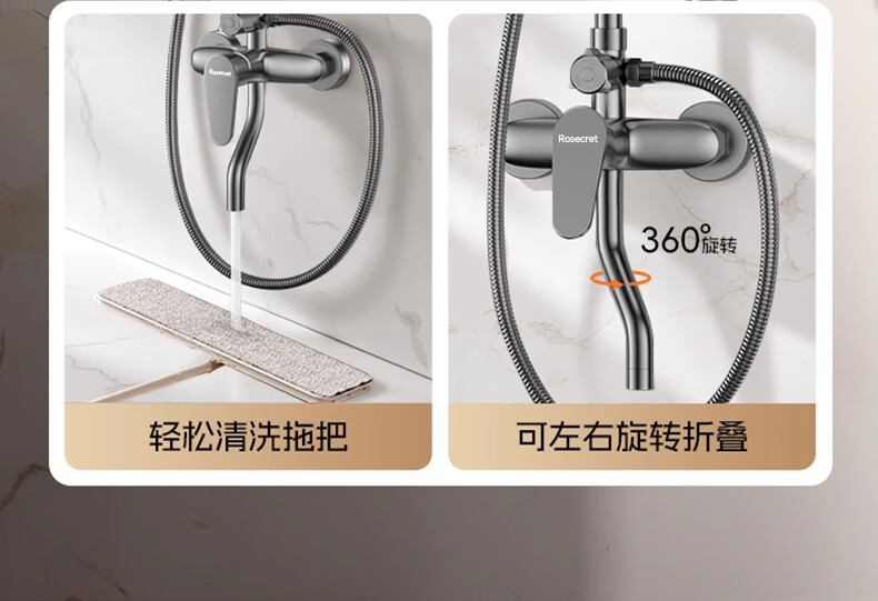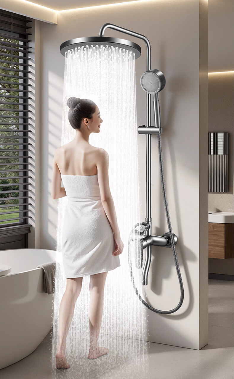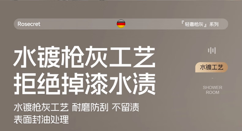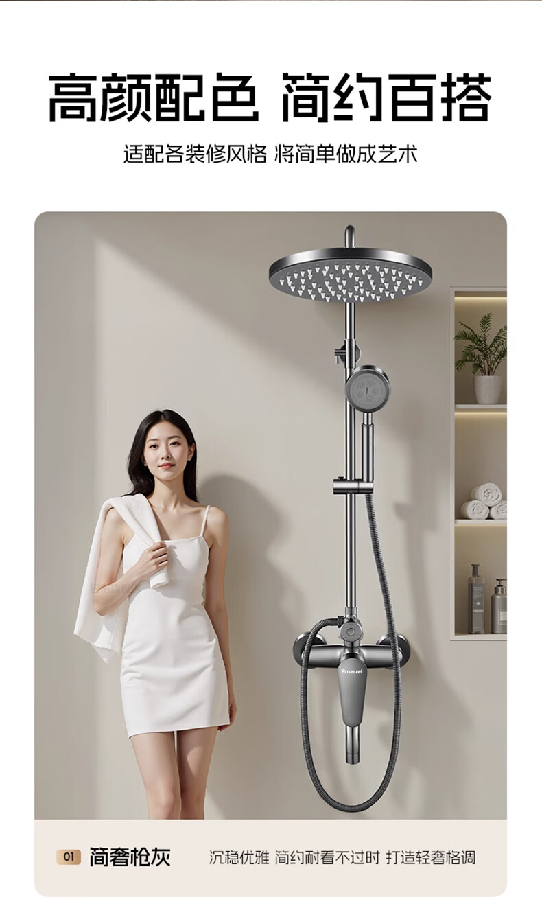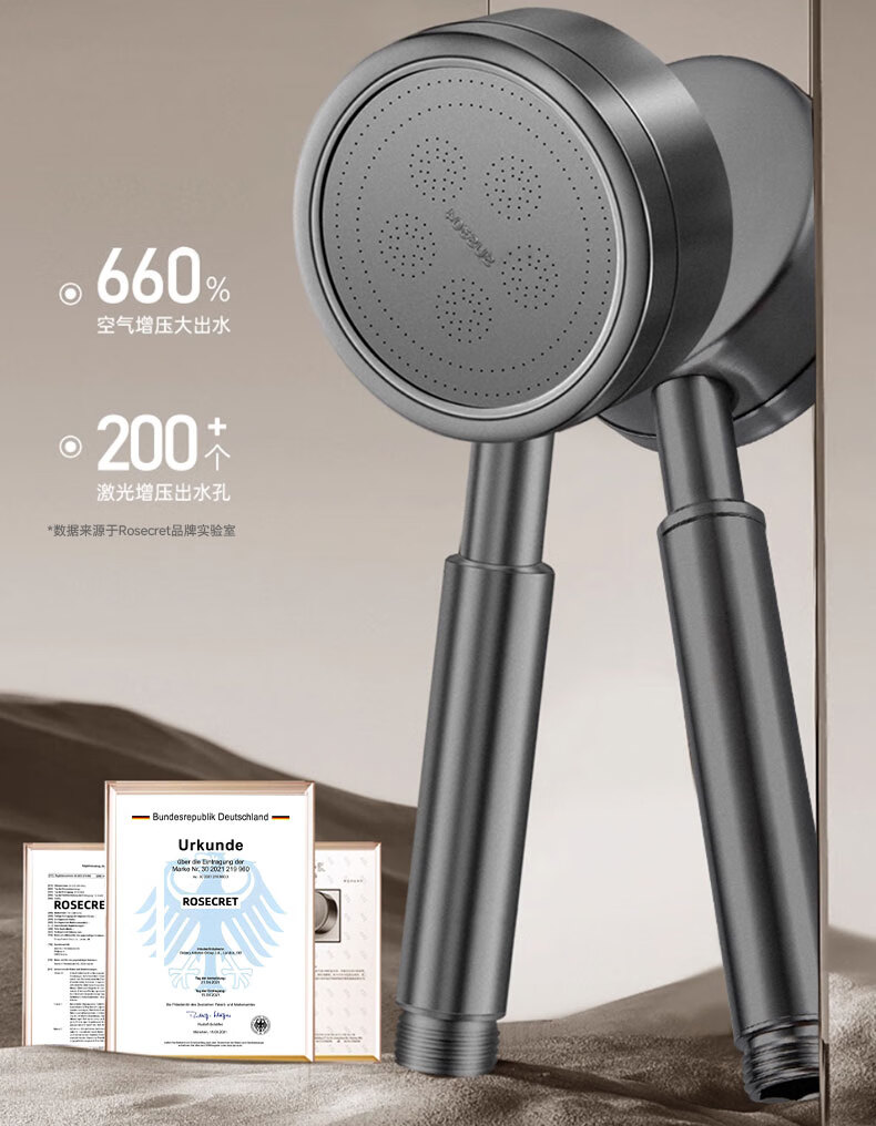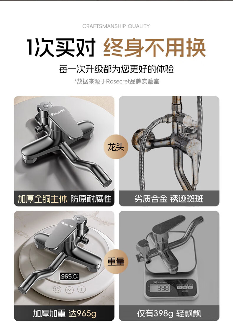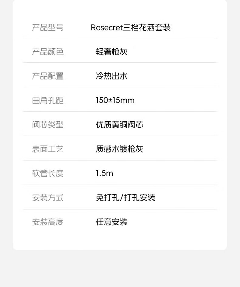 Rosecret【德国】全铜主体淋浴花洒套装家用卫生间洗澡带顶喷全套一整套装 三档混水阀+304手喷+巨幕顶喷【枪灰】 增压雨淋丨过滤净水丨配安装件包