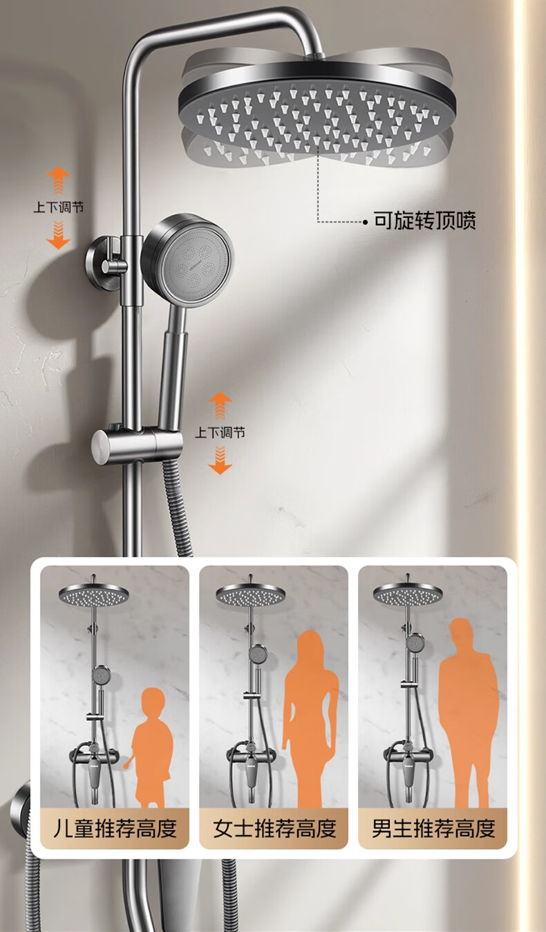 九牧(JOMOO)花洒淋浴花洒套装钢琴按键大置物方管贴墙淋浴顶喷喷增压淋浴器 丝雨星幕版36661爆款灰