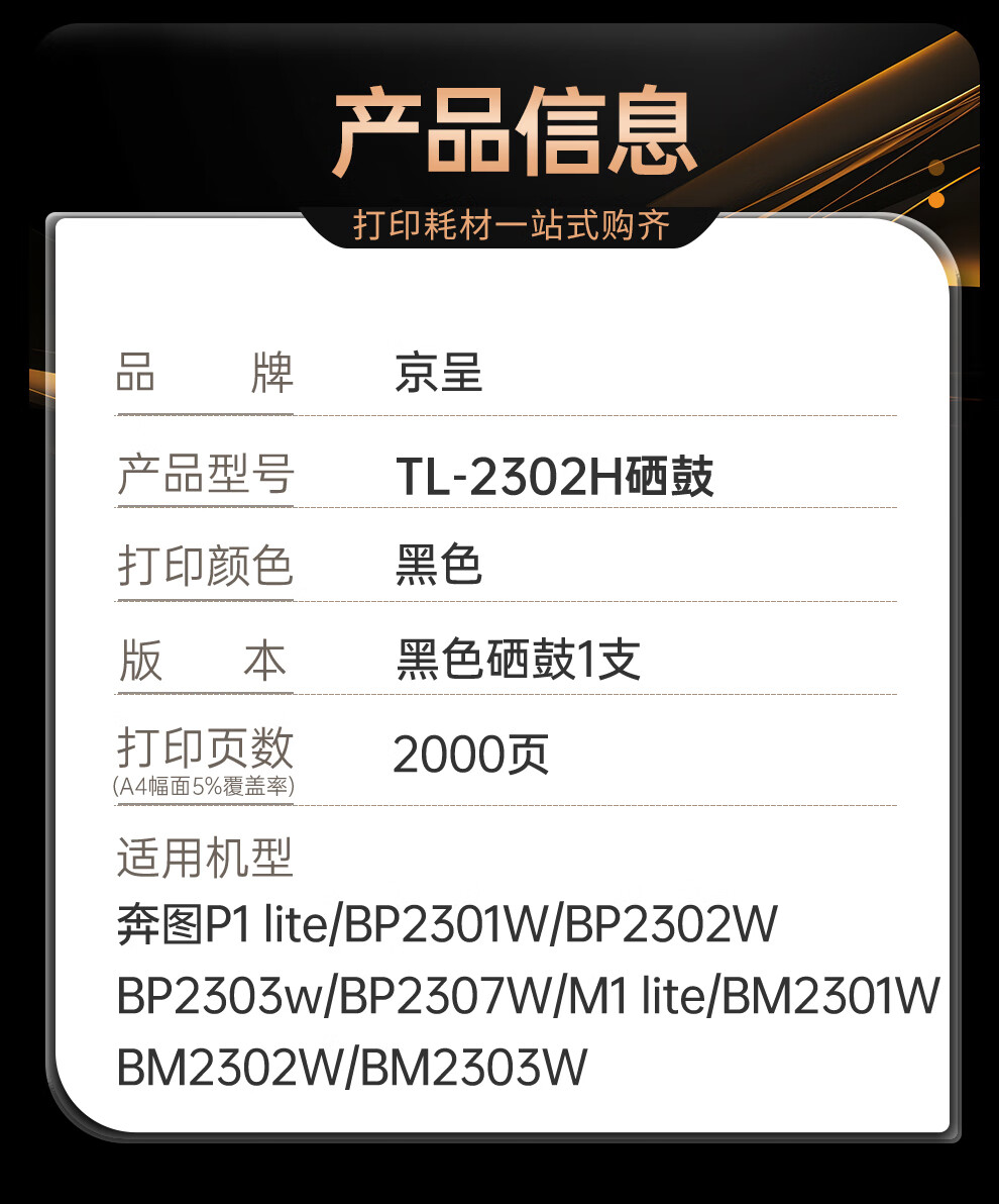京呈TL-2302H硒鼓适用奔图P1 lite BP2301W/2302W/2303W/2307W M1 Max/BM2310W/2312NW/BP2312NW打印机硒鼓碳粉盒