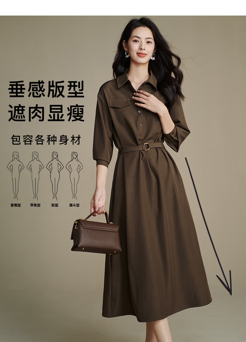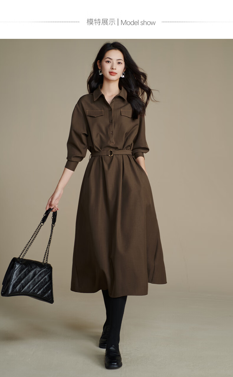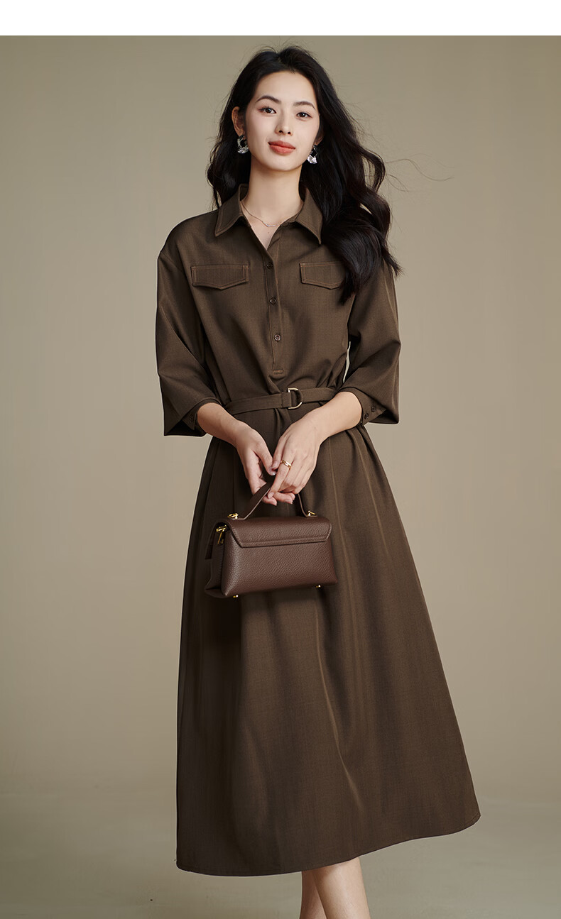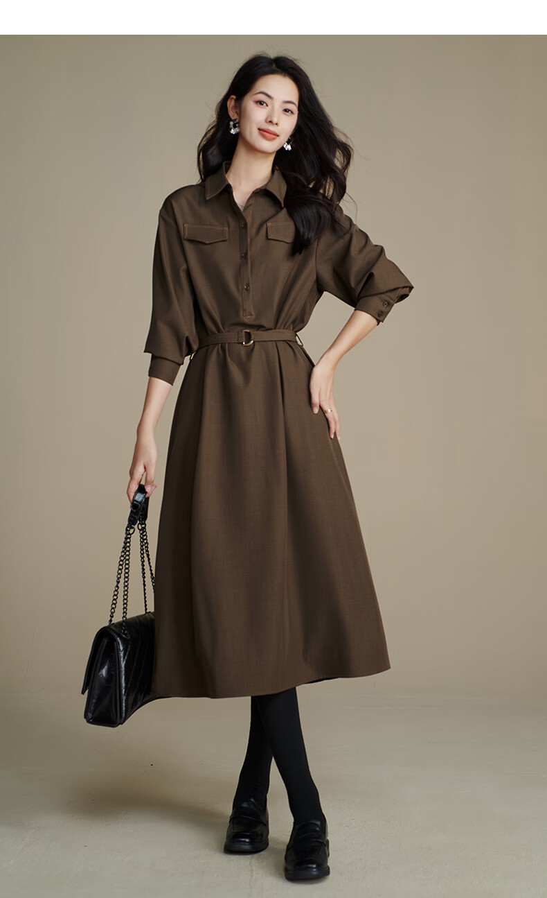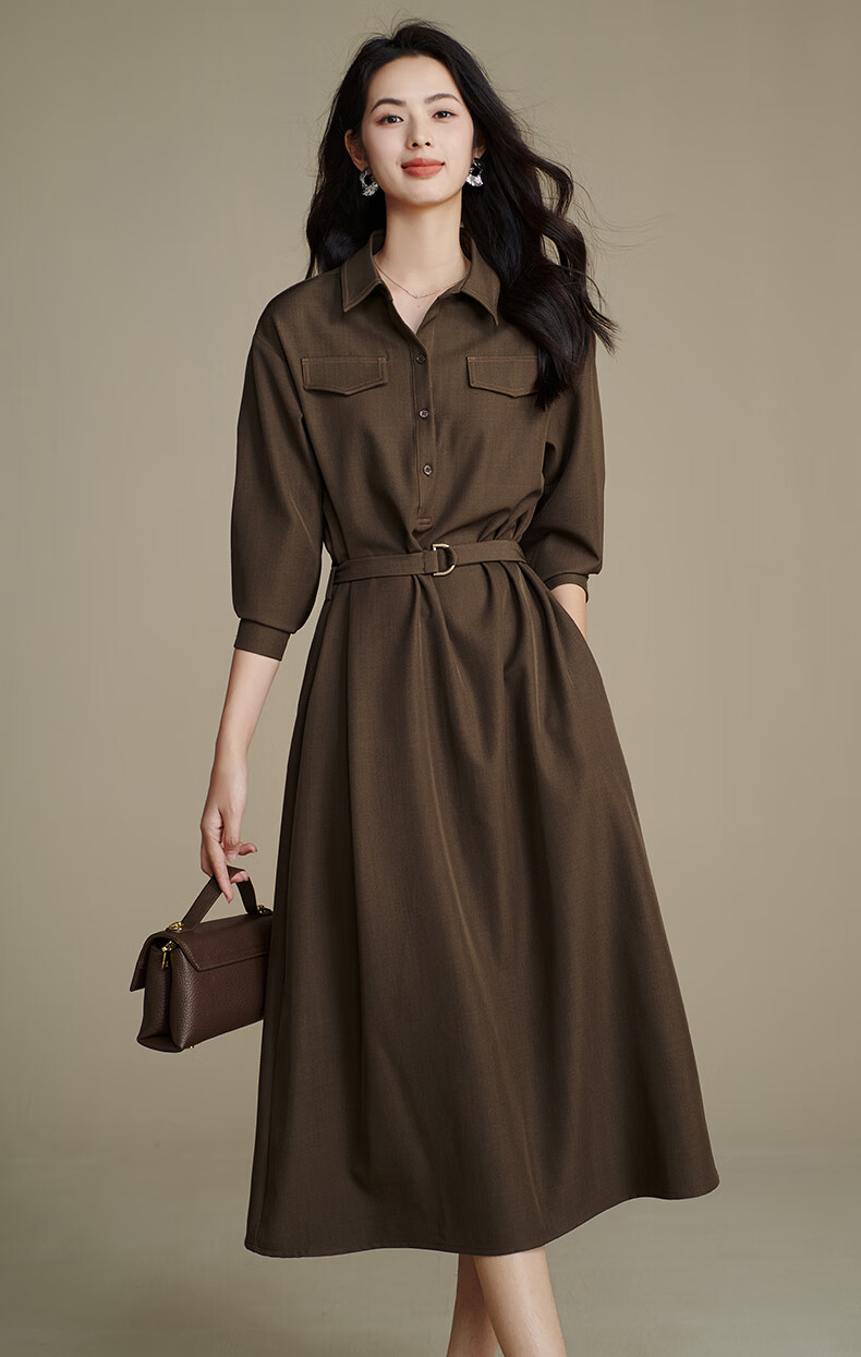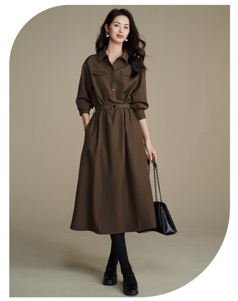 晚白【新品】2026春季收腰显瘦裙子优雅时尚百搭宽松大码长袖连衣裙 深咖色 L