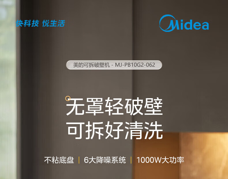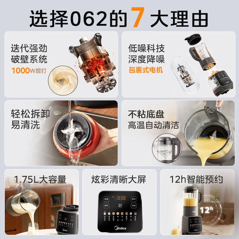 美的(Midea)破壁机家用 1.75L大容量多功能可拆洗豆浆机 降噪静轻音榨汁杯 全自动辅食机打小米糊料理机 【刀盘可拆好洗】PB10G2-062