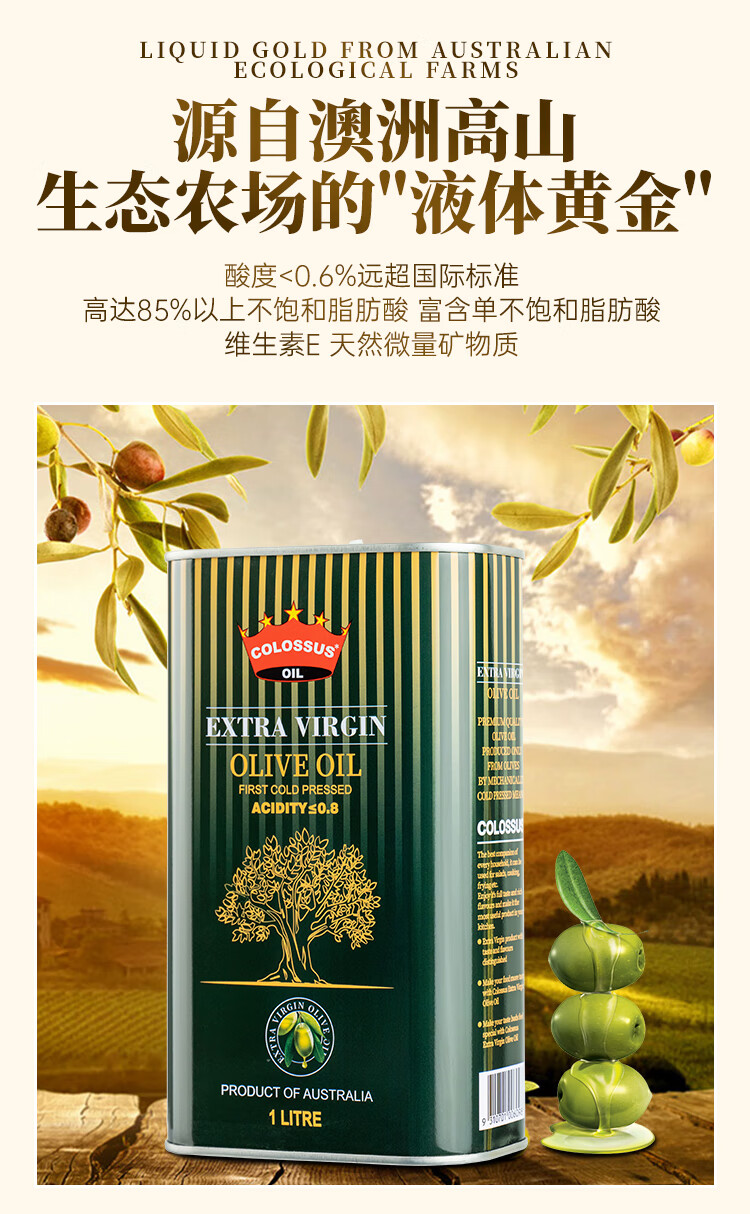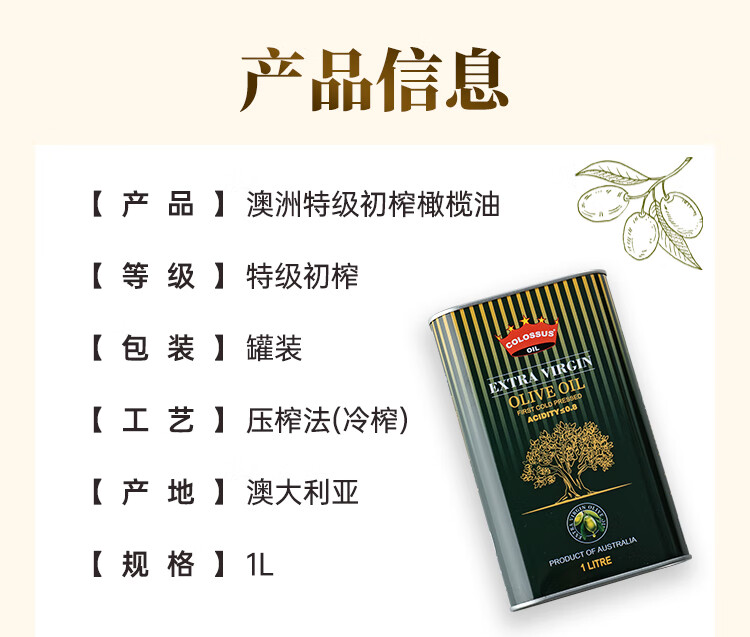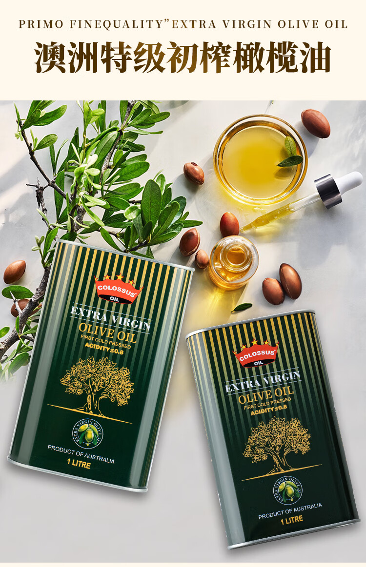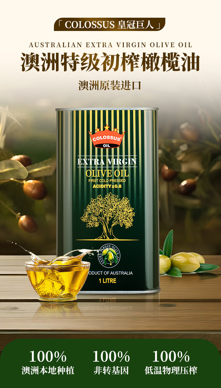 Colossus【保真橄榄油】特级初榨橄榄油 澳洲原瓶进口食用油 1升铁罐装