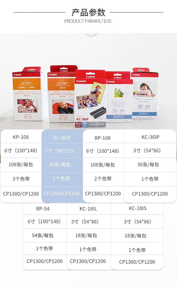 佳能(Canon)佳能cp1500相纸cp1300相纸5寸6寸照片纸3寸贴纸相纸佳能原装相纸照片打印机相纸打印机墨盒色带 KP-108IN(6英寸108 张+3个色带) .