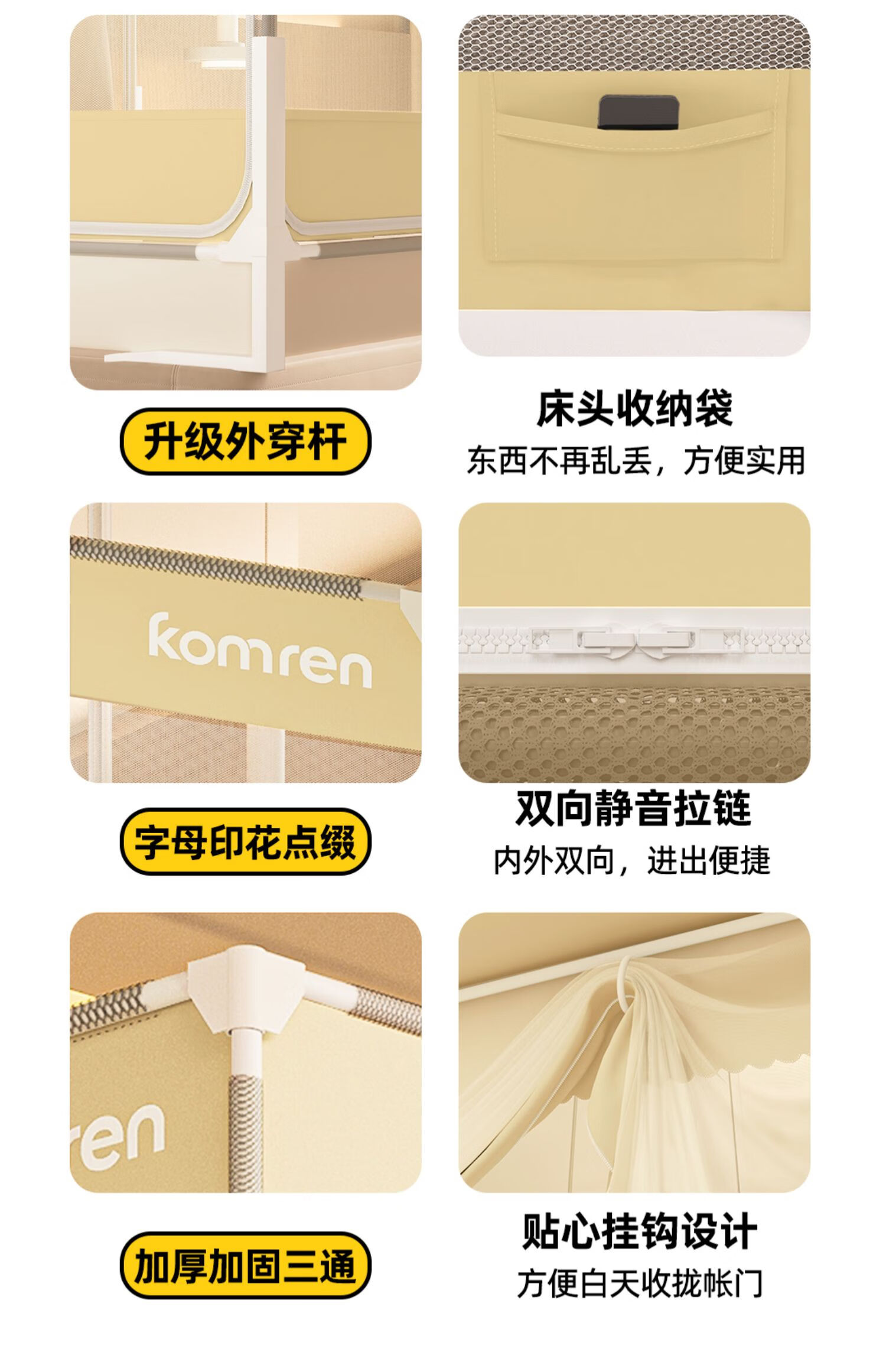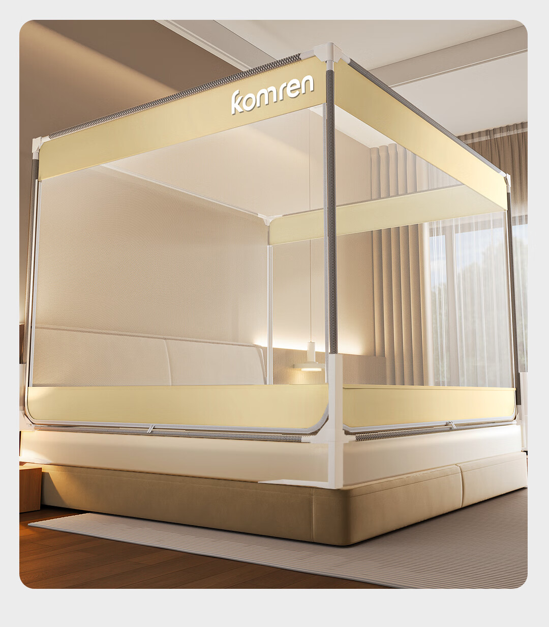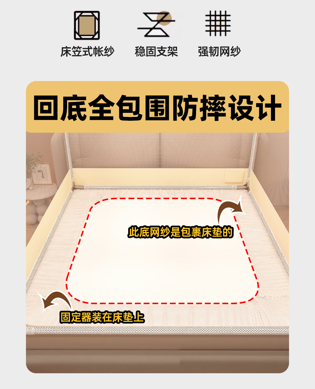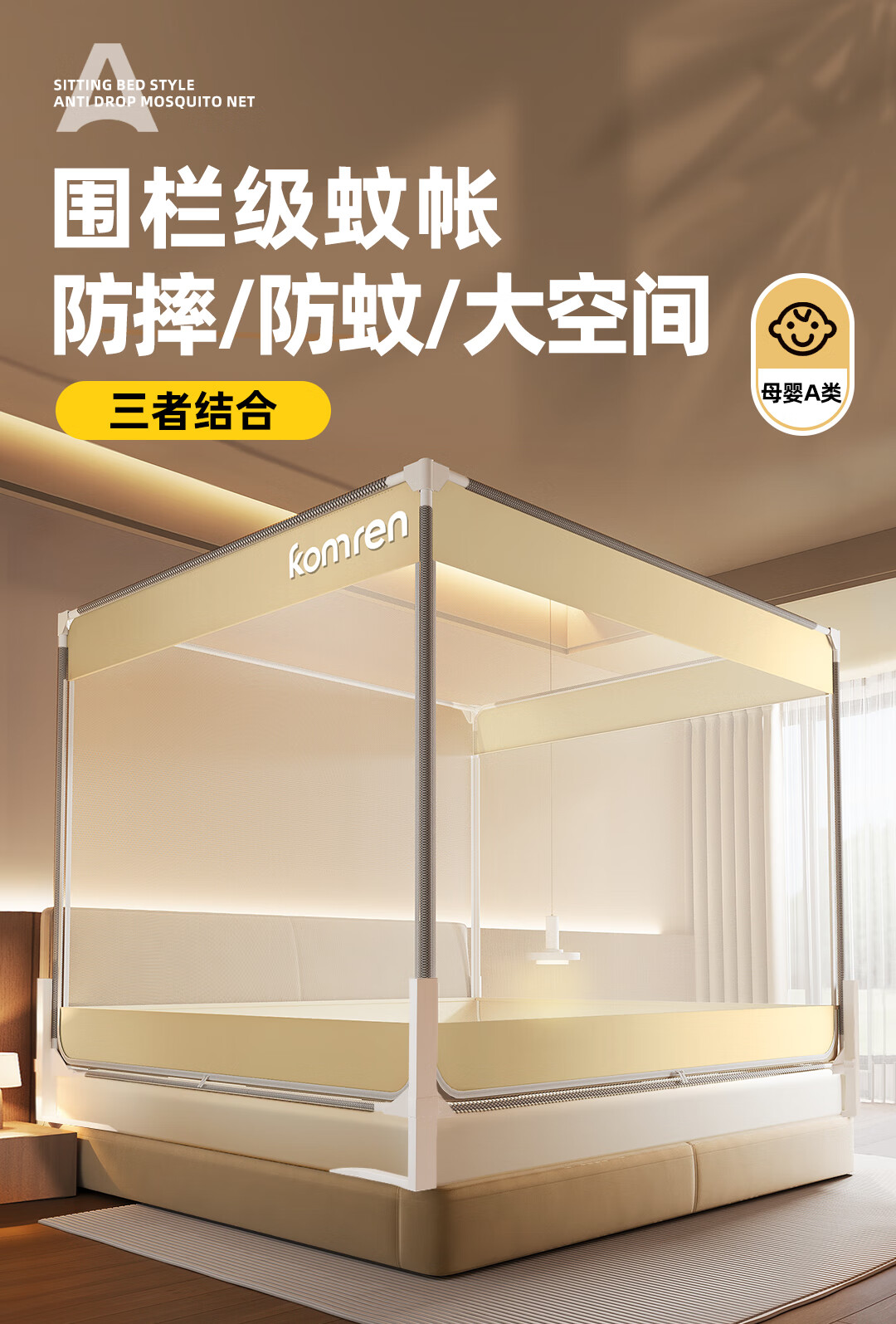 高睿2025新款蚊帐家用卧室婴儿童防止掉床围栏全底一体式升降防摔纹帐 【护栏防摔支架】蜜合米 150cm*200cm*170cm -1.5m床