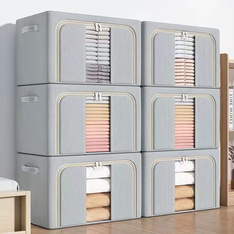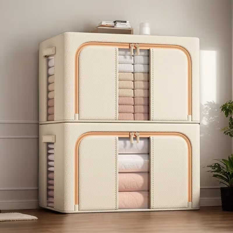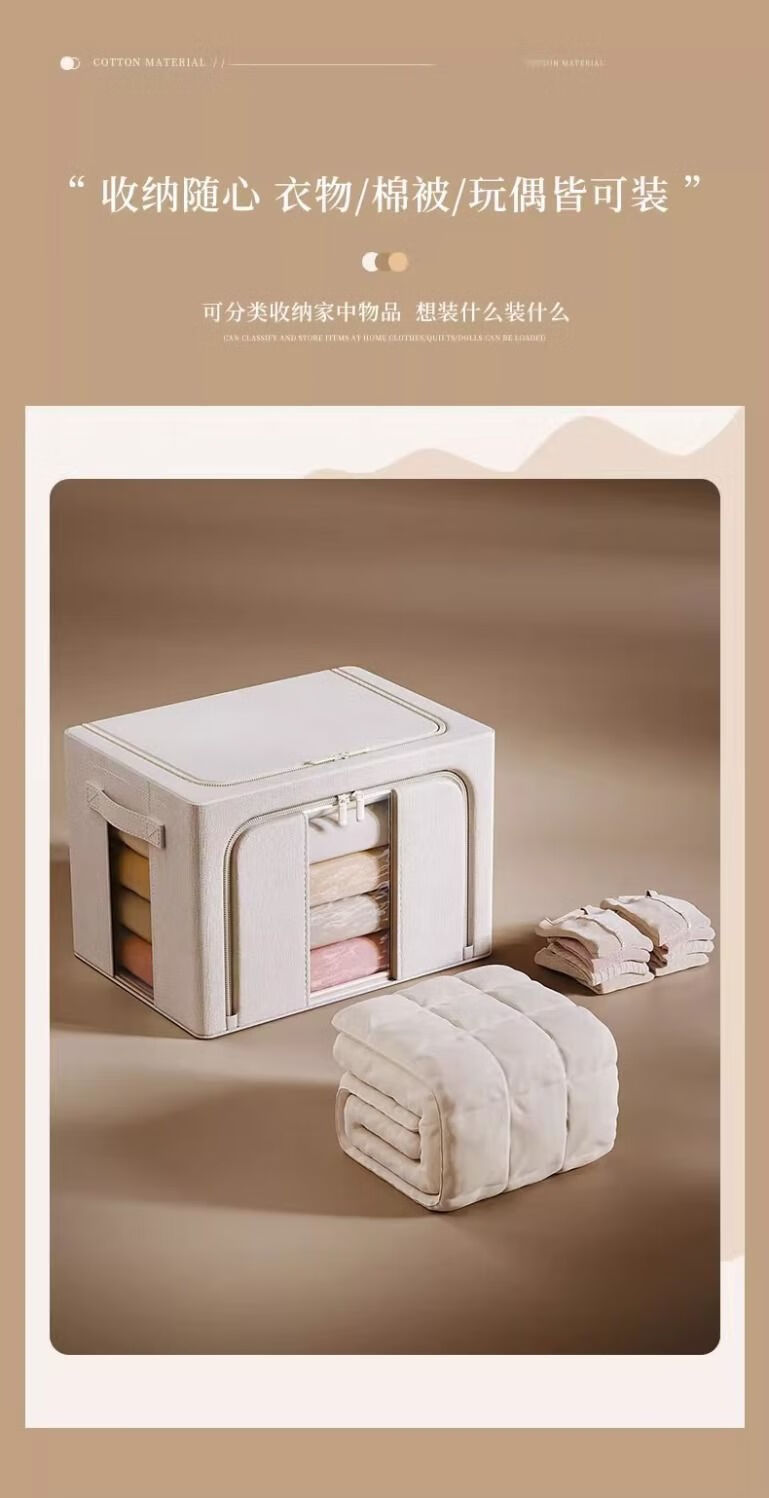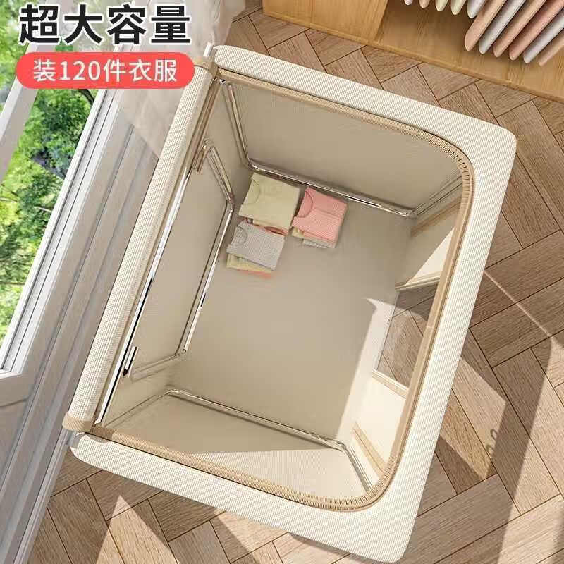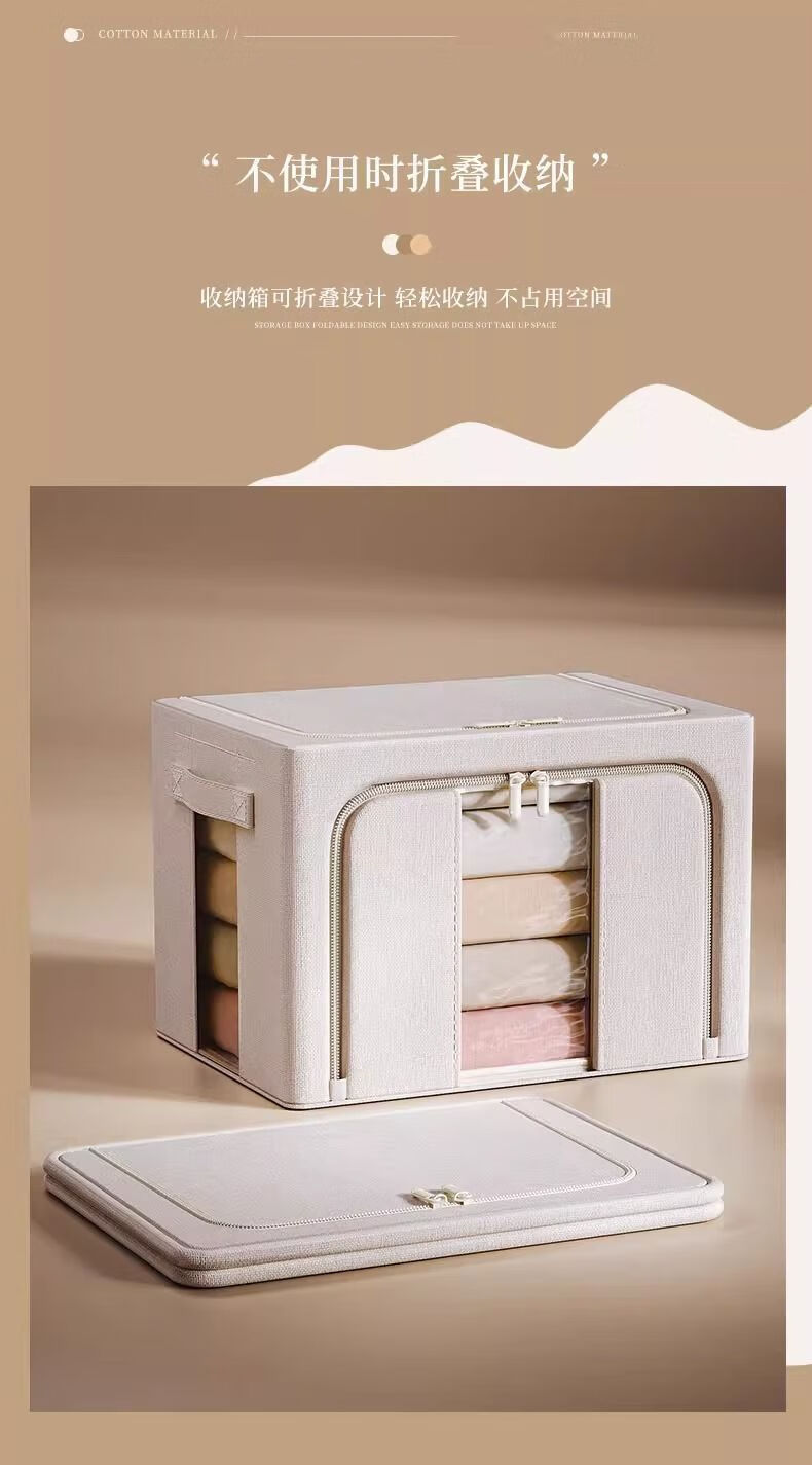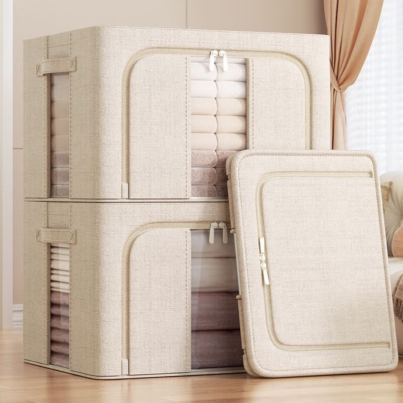 京东物流 棉麻衣服收纳箱家用大容量布艺折叠筐衣柜棉被储物神器 米色【透视窗】双开门 66升-防潮防霉【50*40*33CM】1个