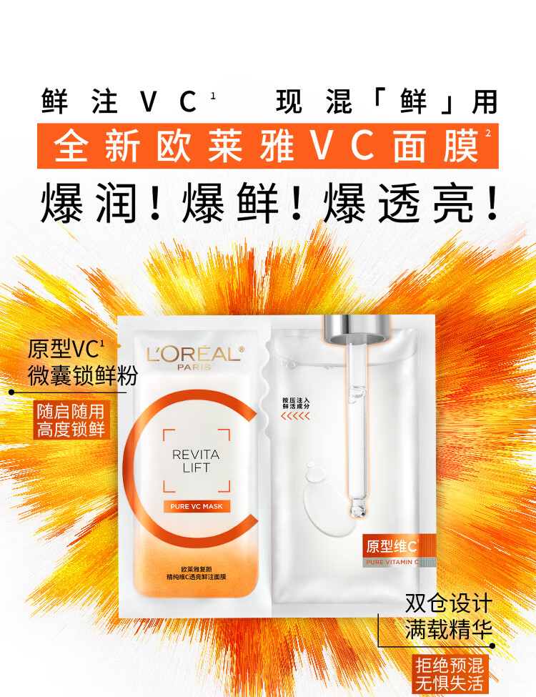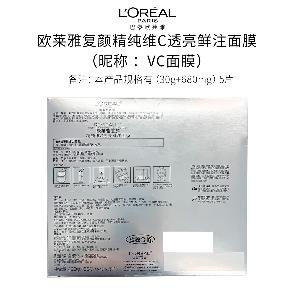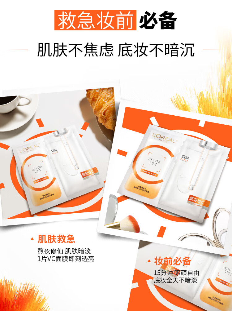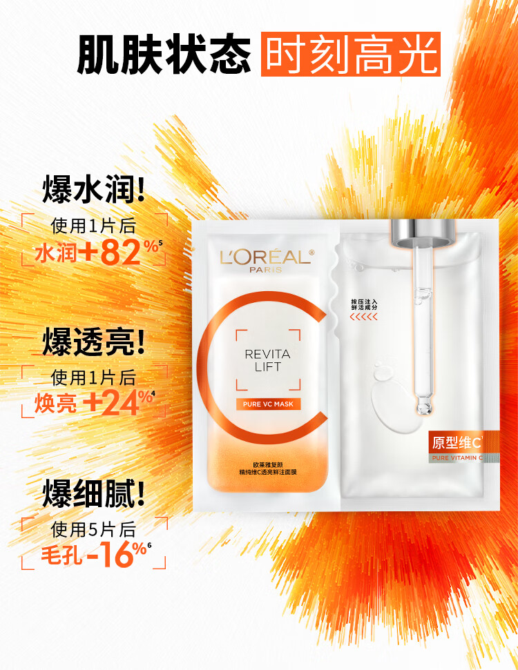 欧莱雅复颜VC面膜补水5片维C玻尿酸保湿抗皱提亮护肤品圣诞礼物