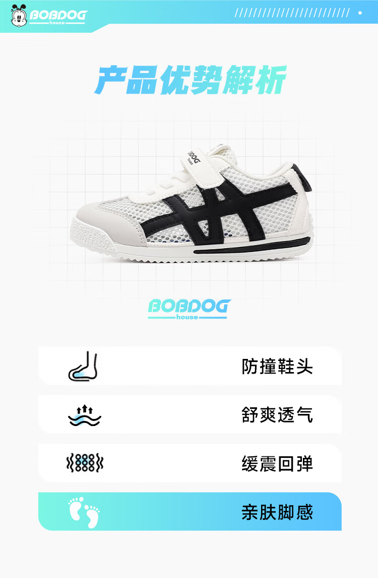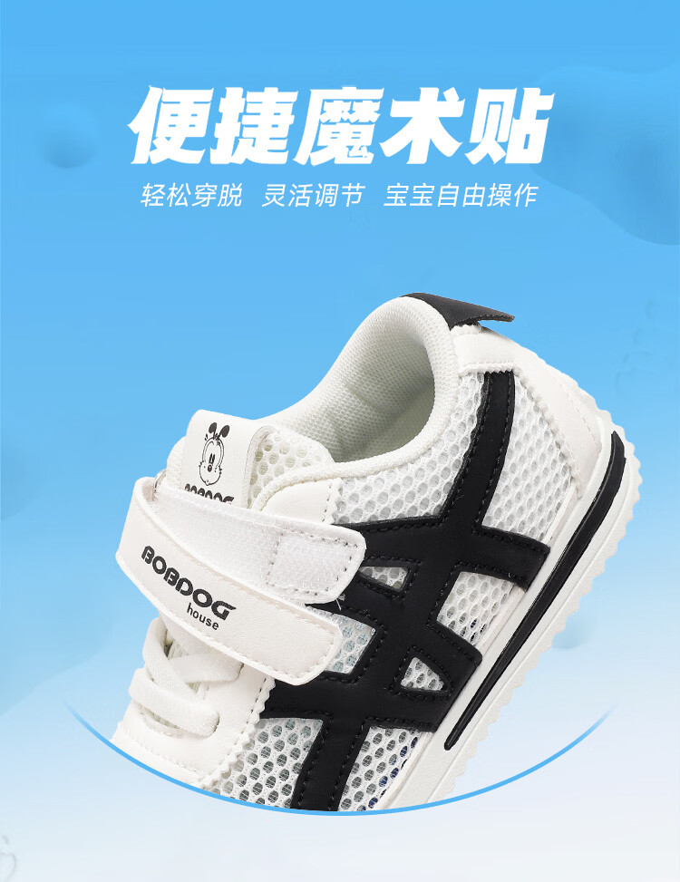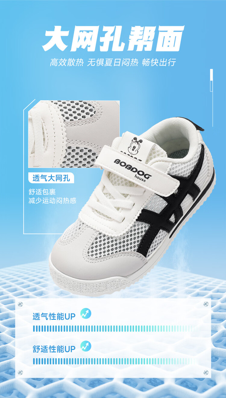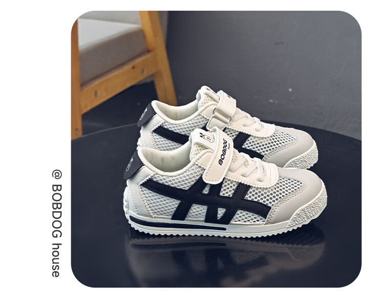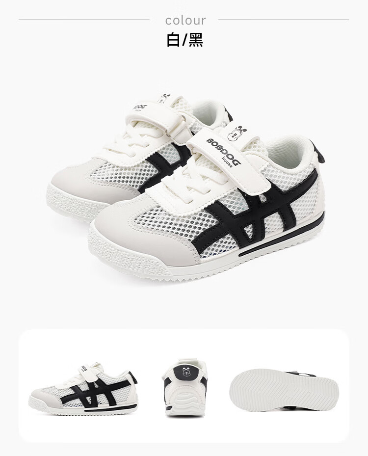 BOBDOG house童鞋2026夏季网面德训鞋女孩低帮儿童运动鞋男童休闲鞋子跑步鞋 白/黑 34 适合脚长21.0cm