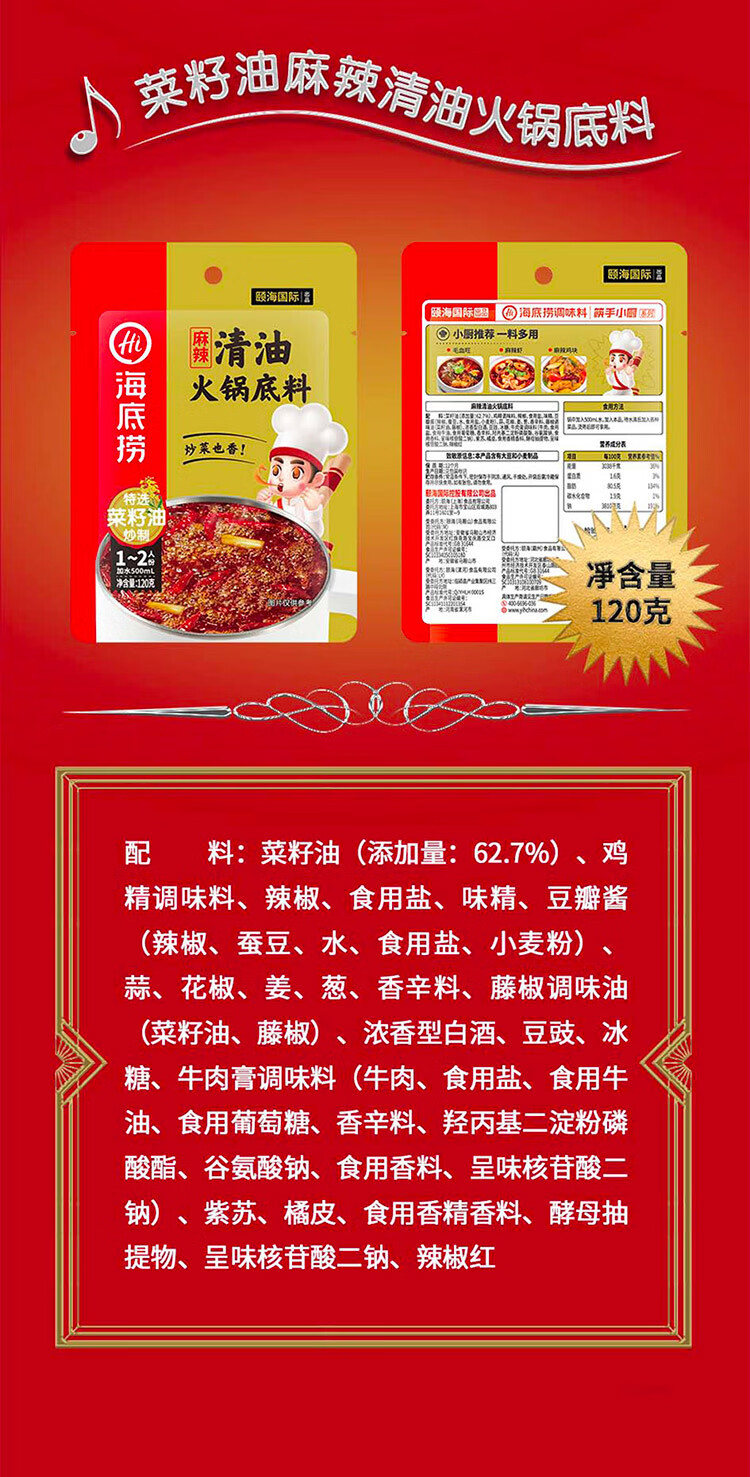 海底捞火锅底料 清油麻辣火锅底料120g 清油麻辣火锅料 一料多用