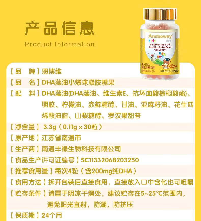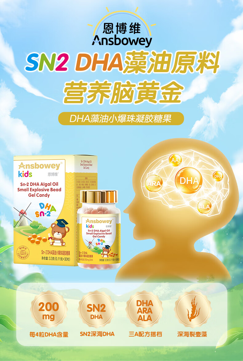 恩博维dha藻油小爆珠 儿童学生青少年3-6-12-18岁 孕妇哺乳期ARA ALA DHA小爆珠+营养师服务 30粒*1瓶