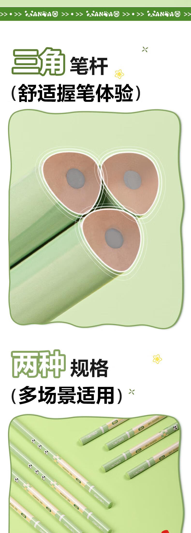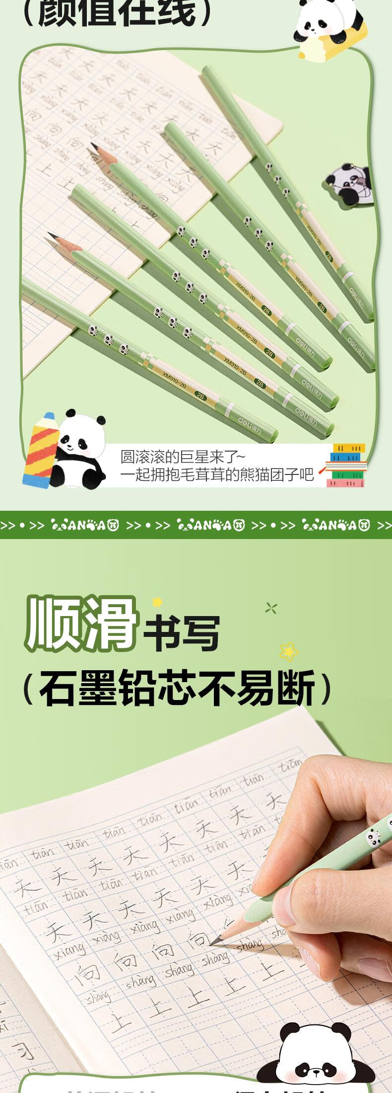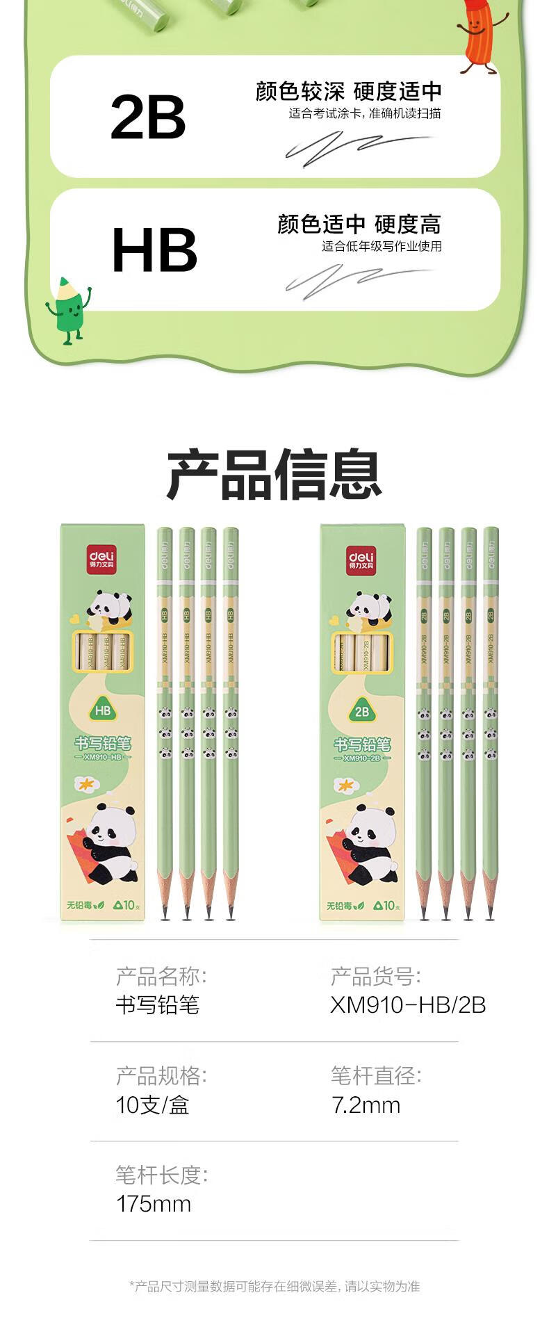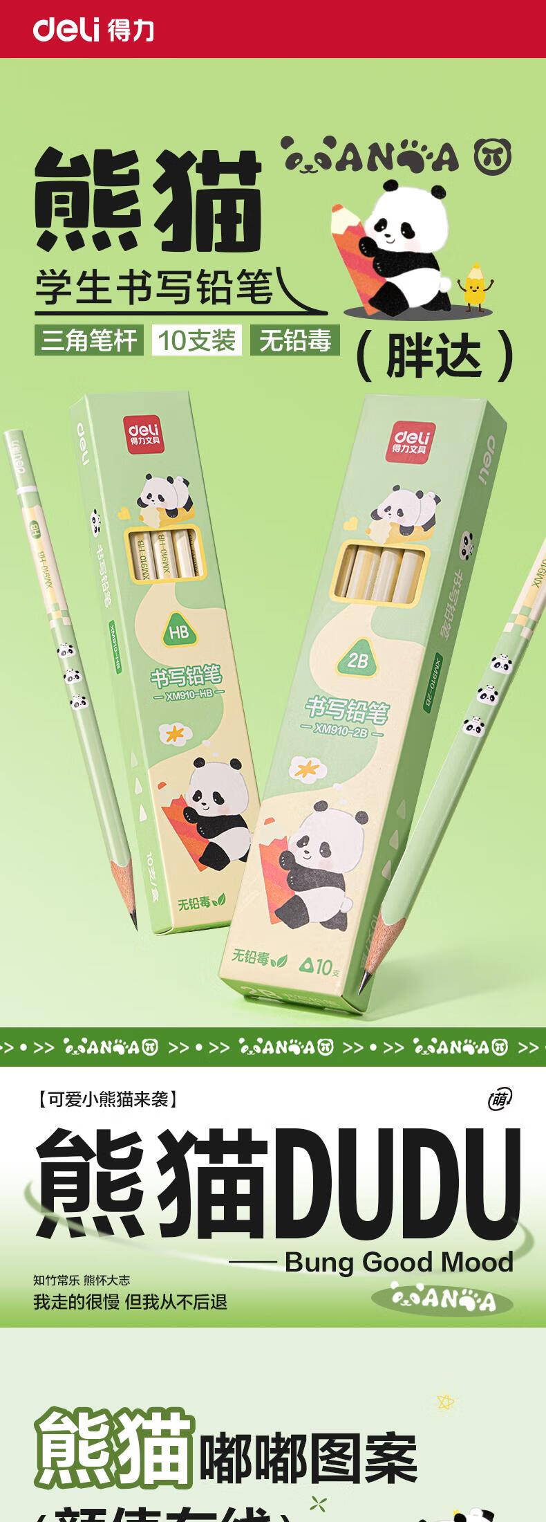 得力(deli)熊猫三角杆书写铅笔10支HB铅笔原木学生考试素描绘图铅笔写字练字书写XM910-HB学生开学文具