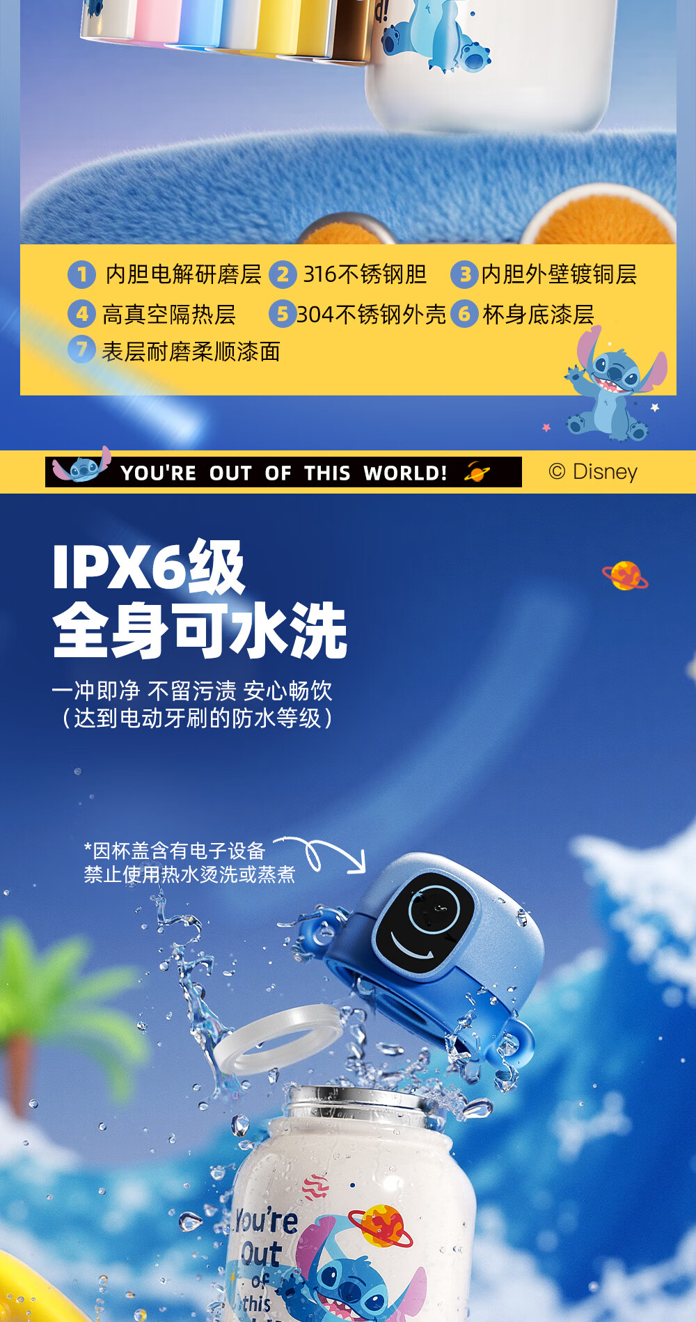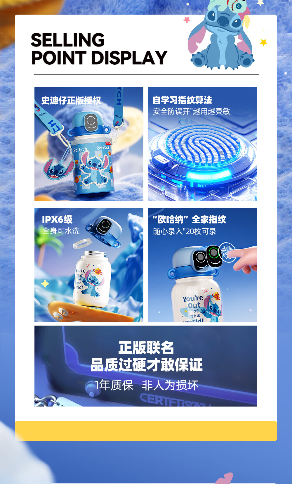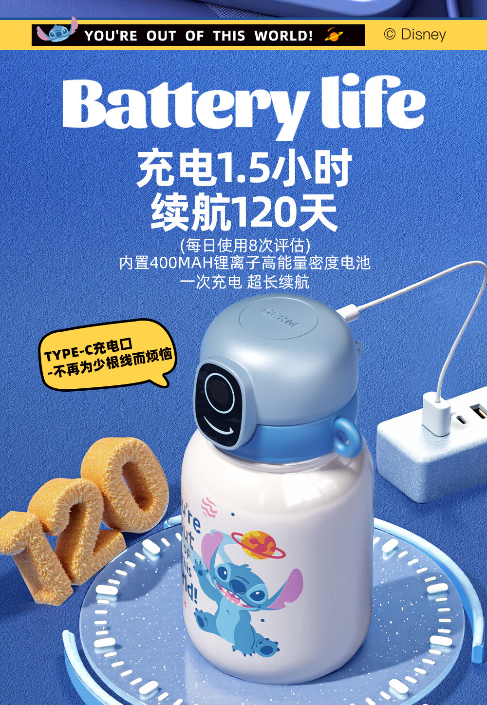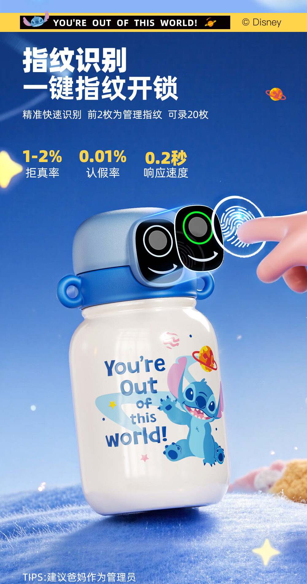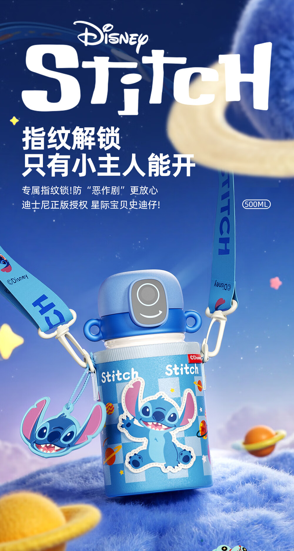 格米(germ)史迪奇指纹保温杯密码解锁儿童保温杯专用学生水杯高颜值水壶杯子 史迪奇500ML【可充电续航120天】