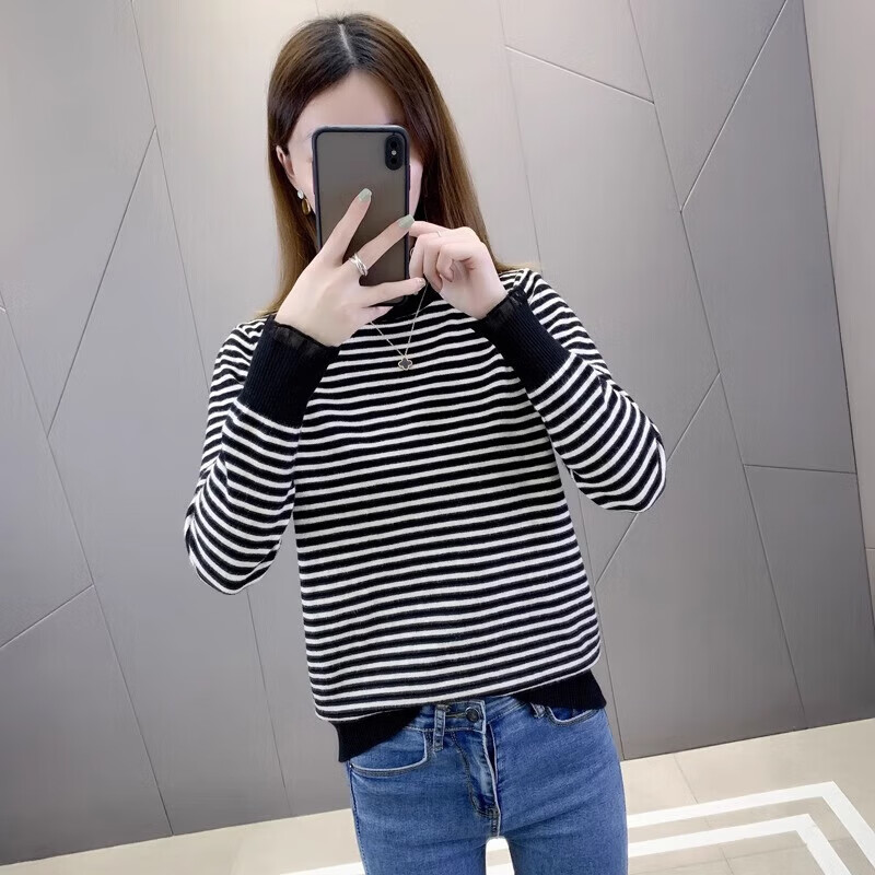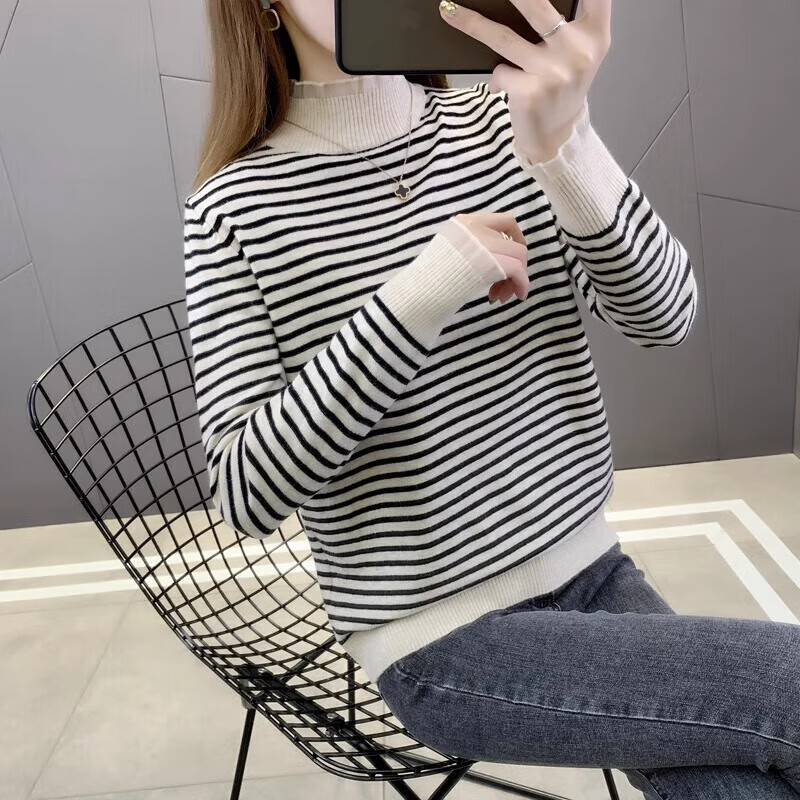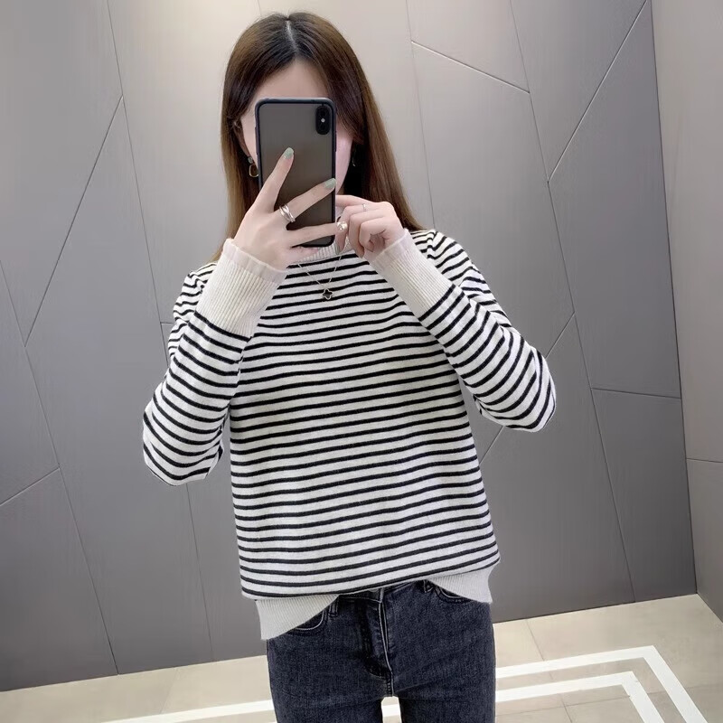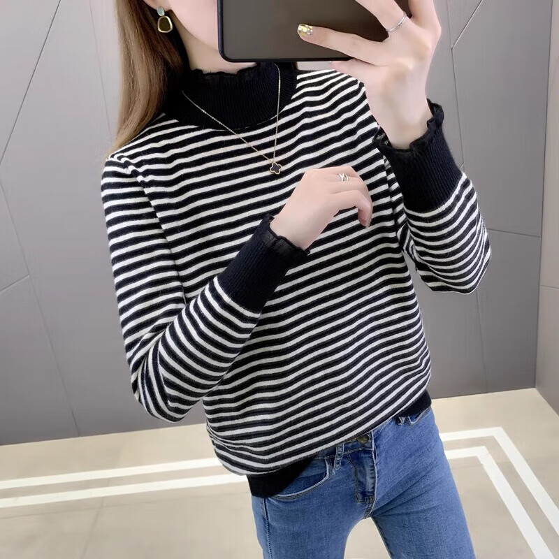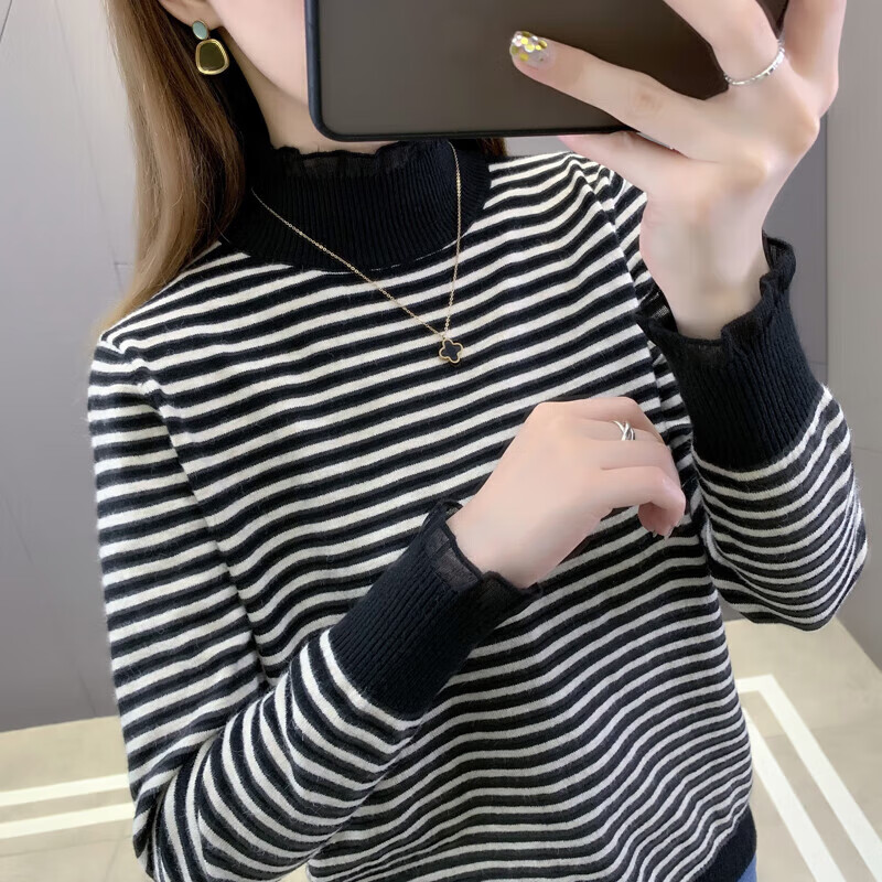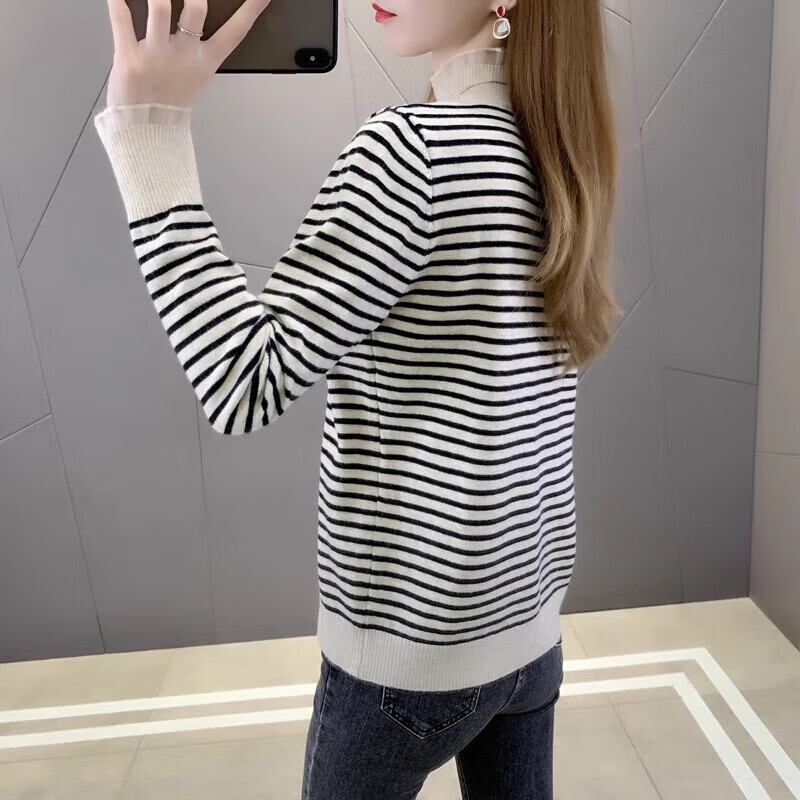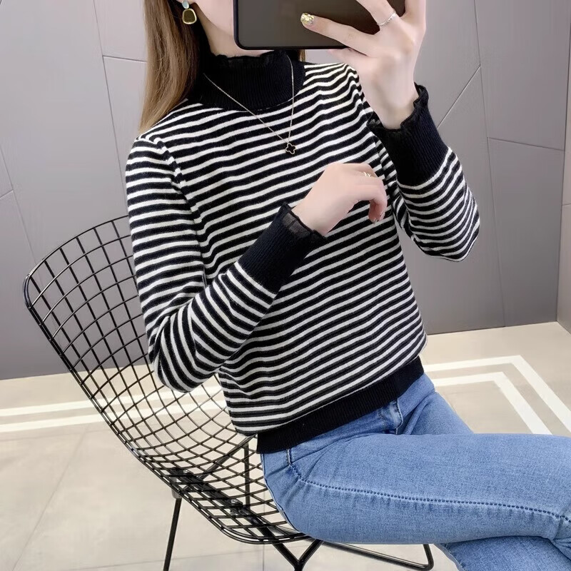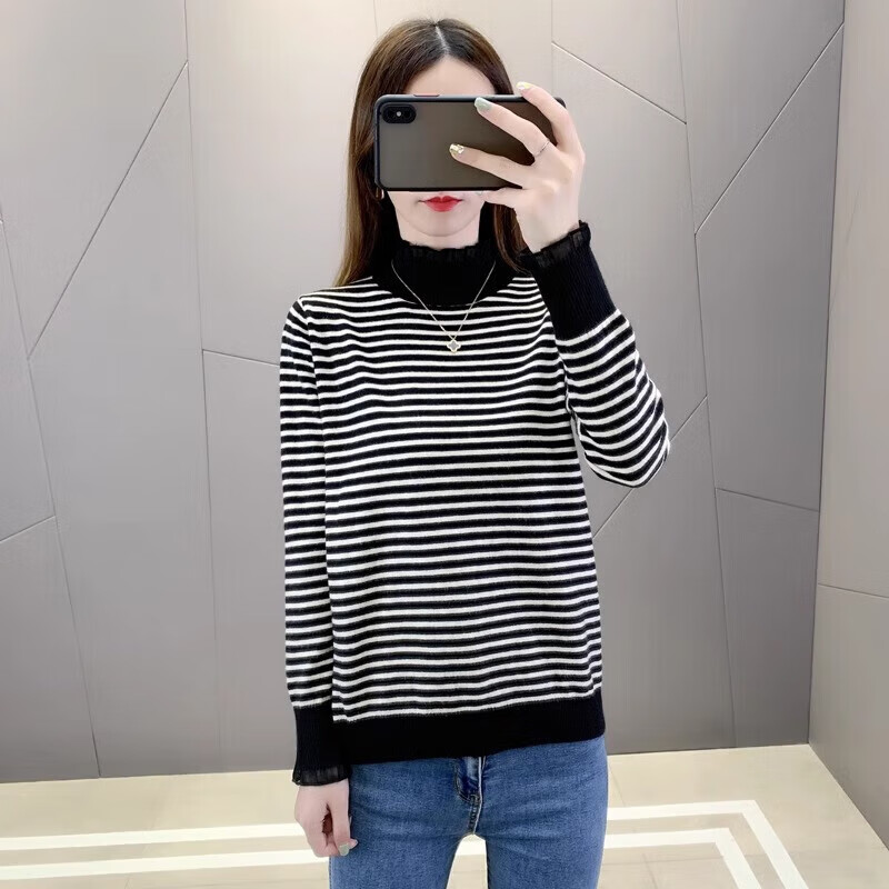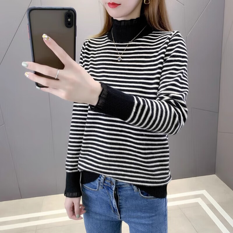 香影纯蕾丝半高领条纹针织打底衫女2025秋冬新款宽松显瘦毛衣女装内搭 杏色 S (建议95斤以内)
