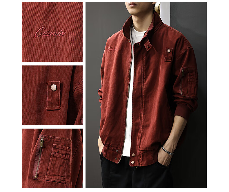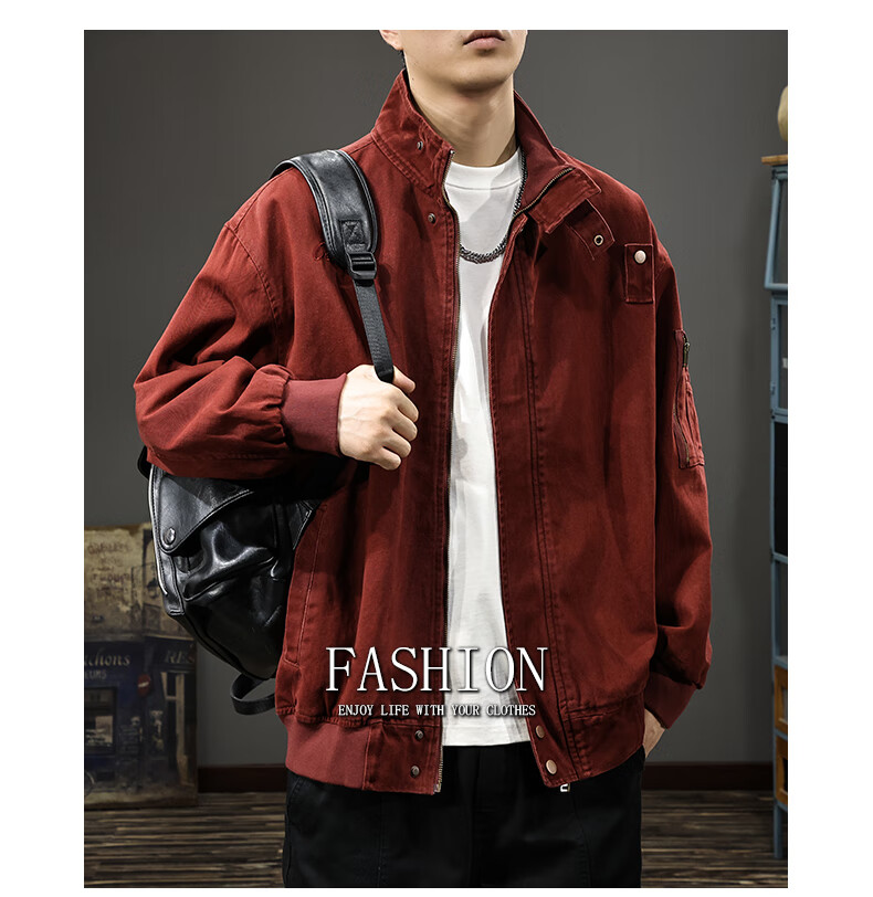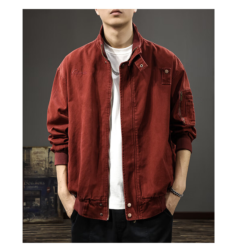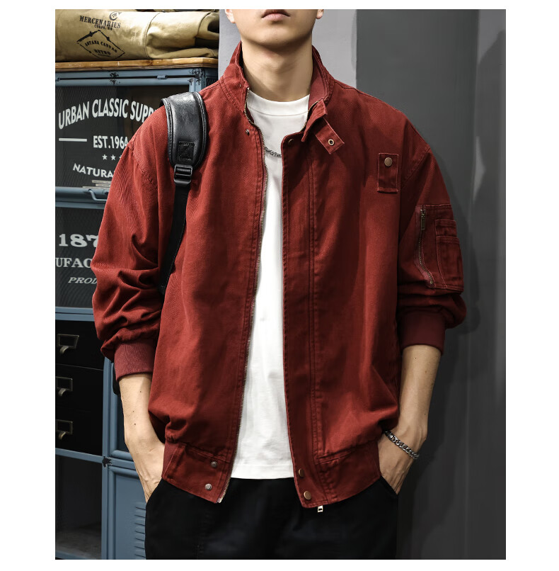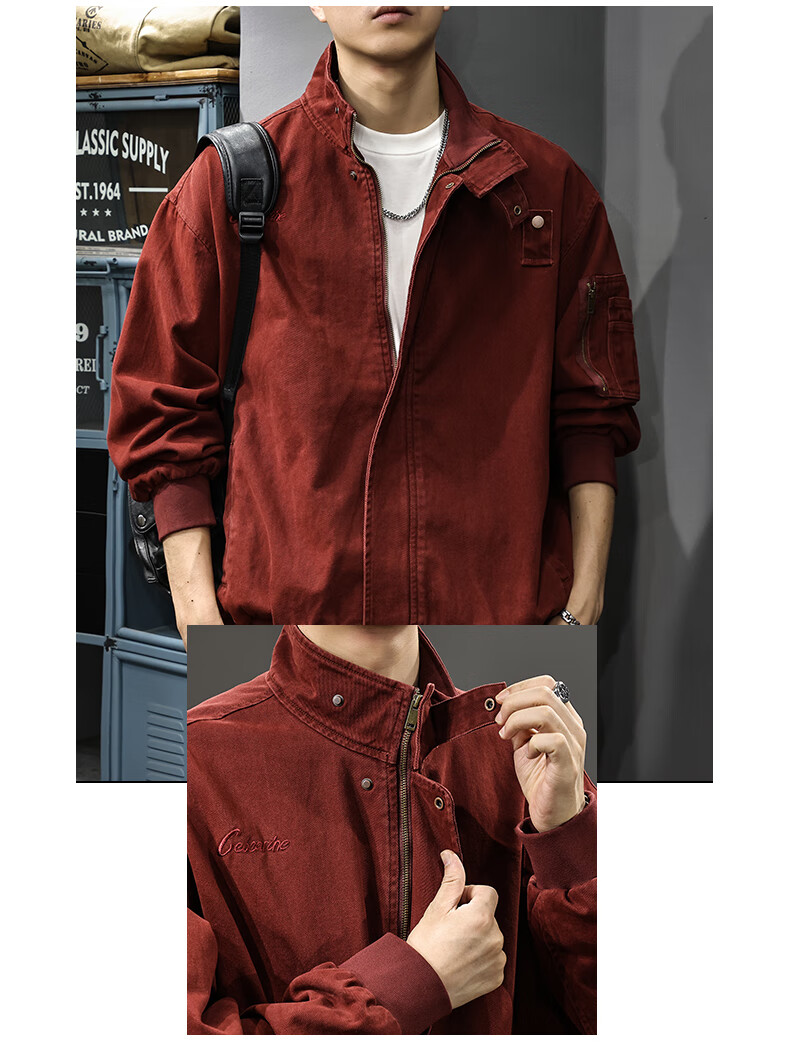 邦约恋人春秋款立领纯棉工装男夹克美式复古潮牌猎装上衣宽松刺绣休闲外套 红色 3078 L 合适体重130-145斤