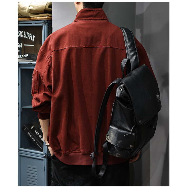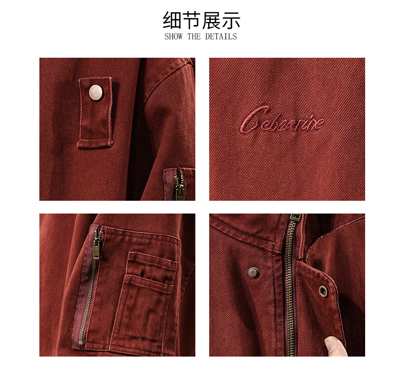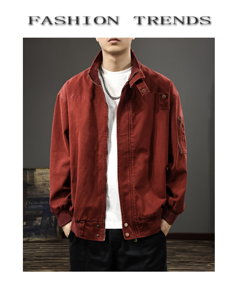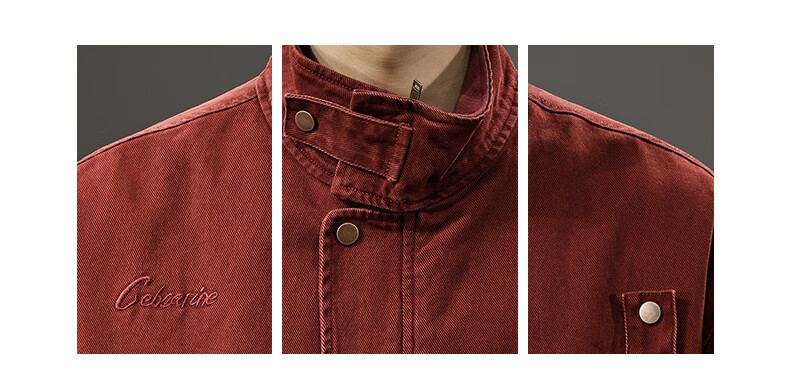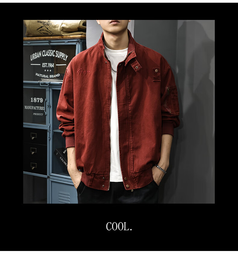 邦约恋人春秋款立领纯棉工装男夹克美式复古潮牌猎装上衣宽松刺绣休闲外套 红色 3078 L 合适体重130-145斤