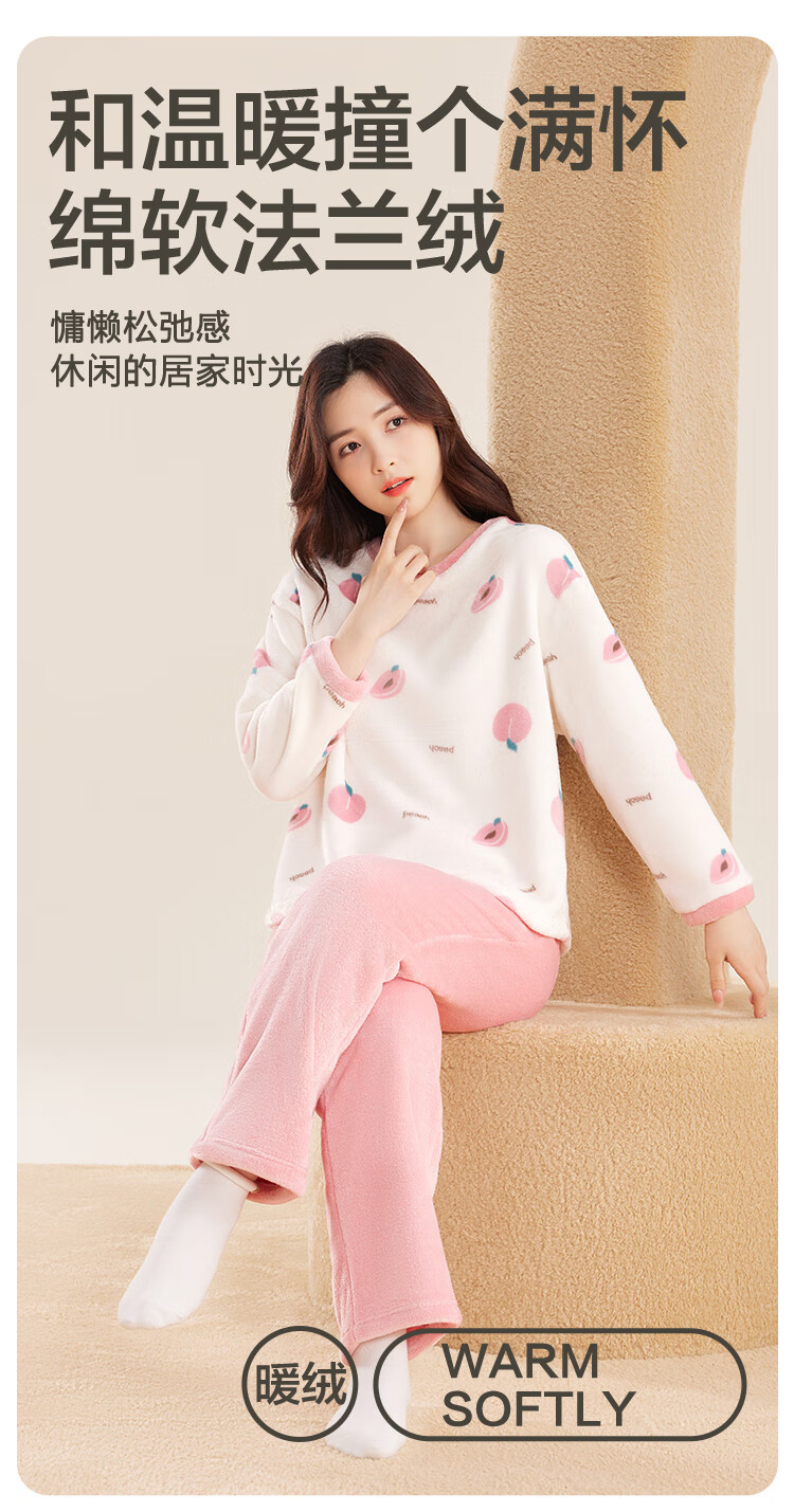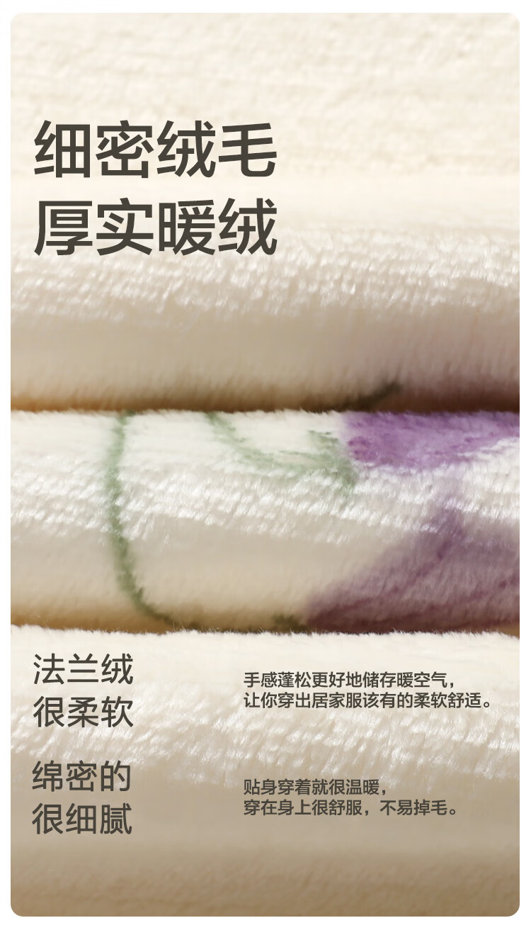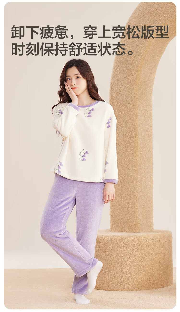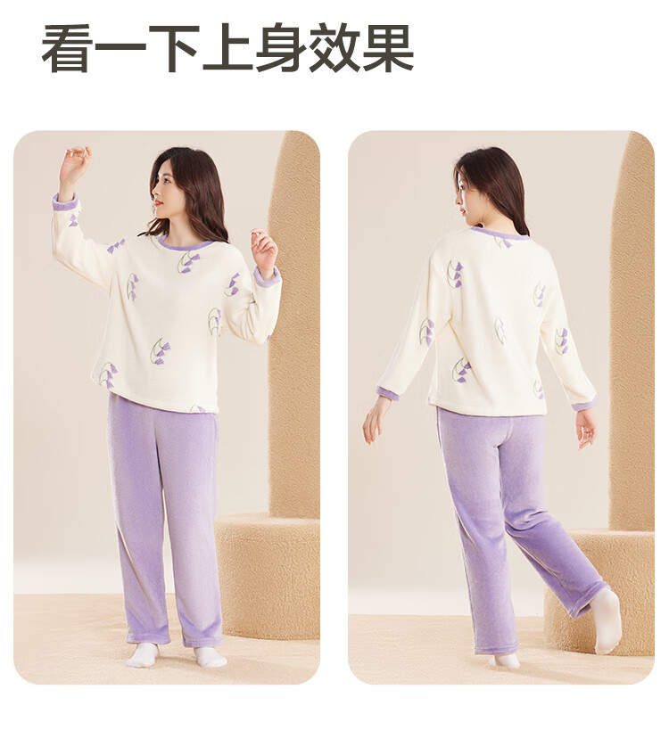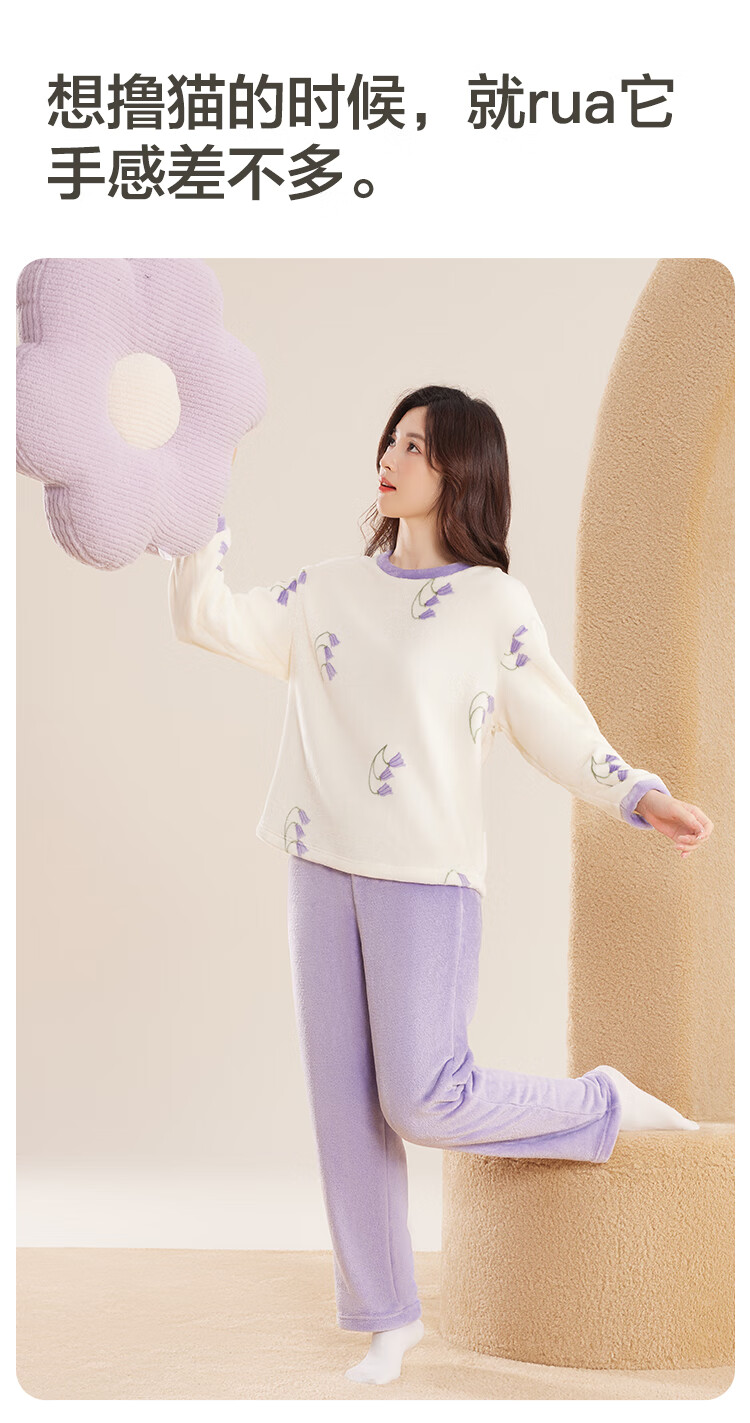红豆居家睡衣女士法兰绒甜美套头睡衣女款柔软保暖圆领家居服 风铃紫728 M 165/88A