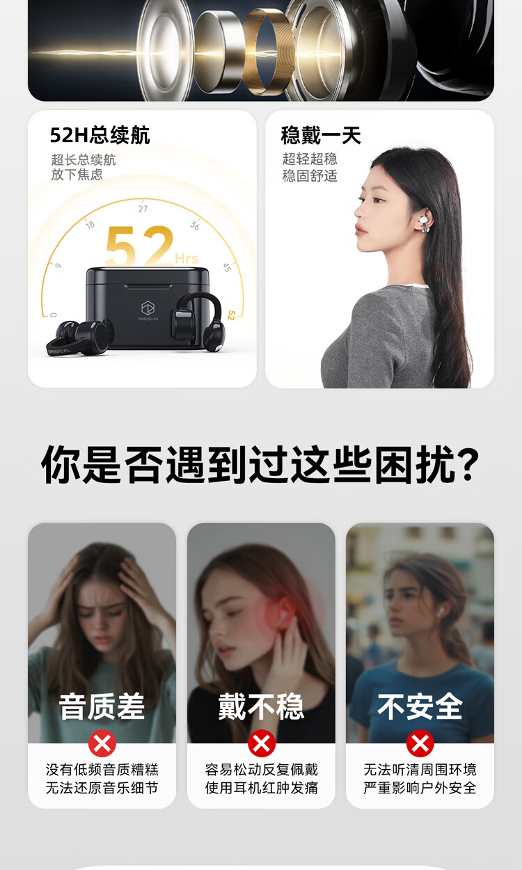 鑫羽音【甄选直发】2025新款无线蓝牙柏林之声耳机开放耳夹式不入耳高音质通话降噪超长续航适用华为vivo 黑-千元音效+超长续航+通话降噪 【手机通用】蓝牙5.4-单耳