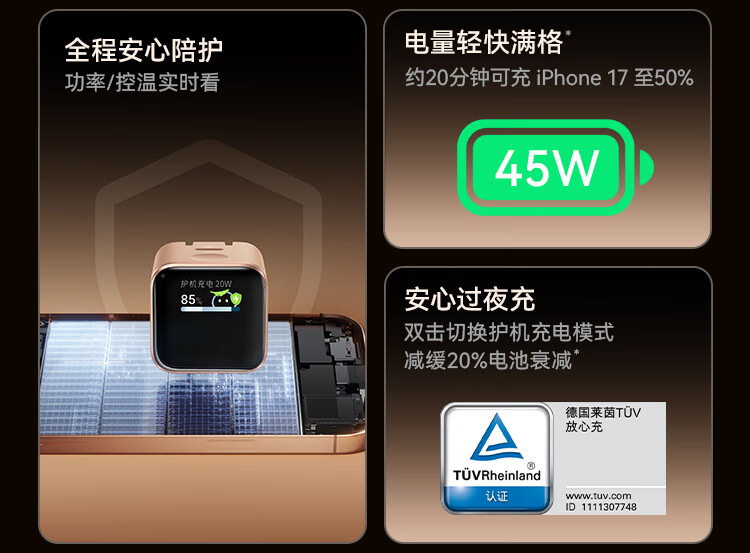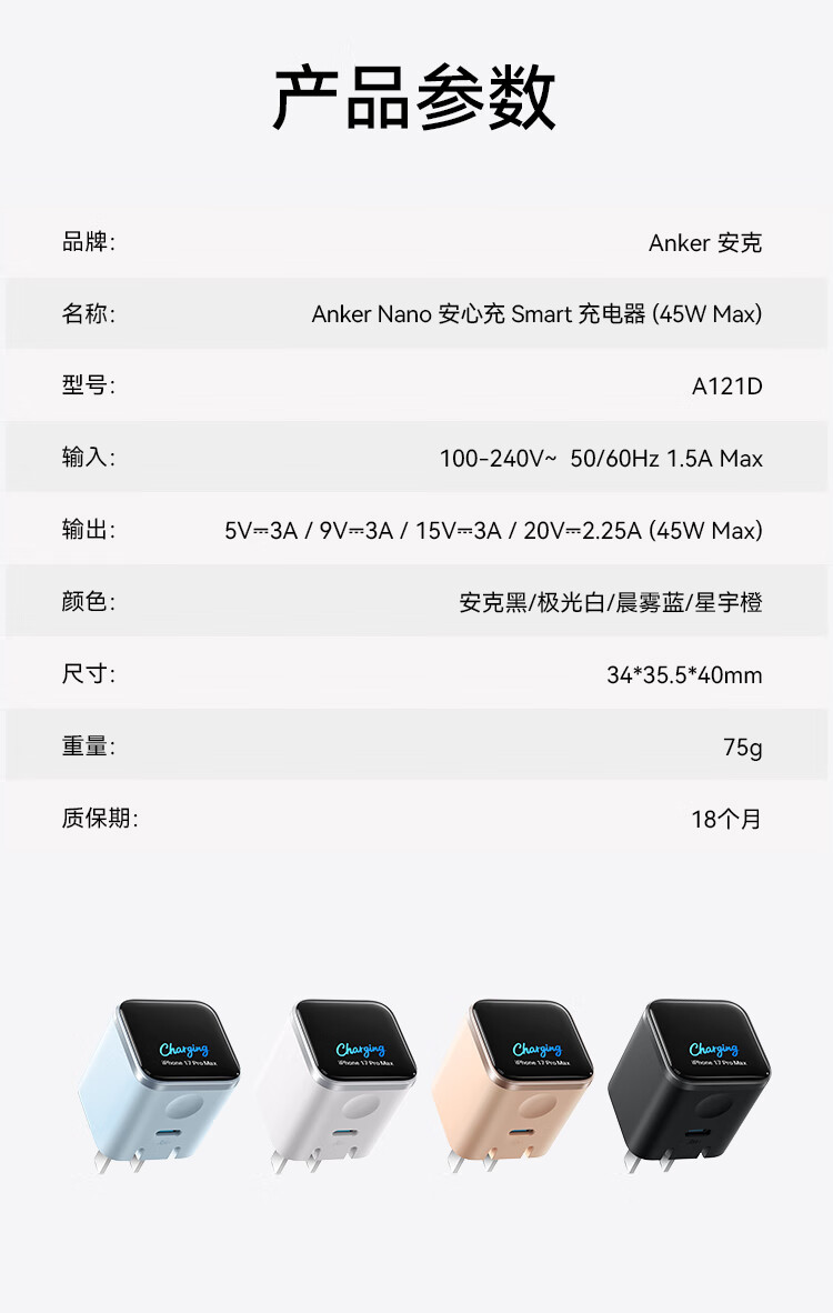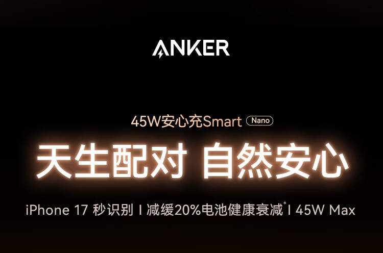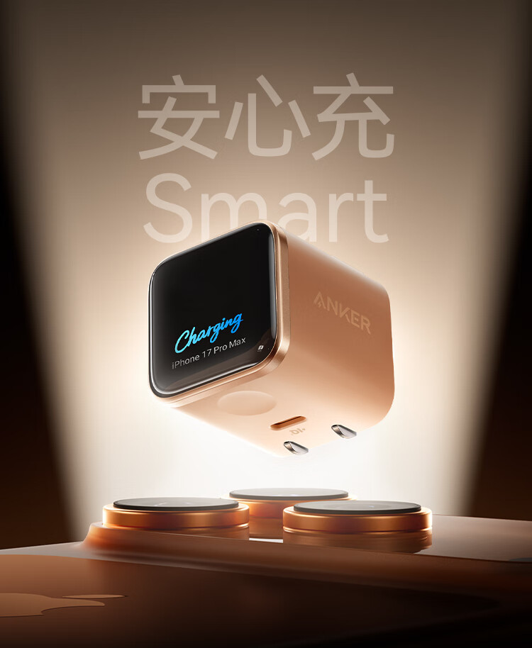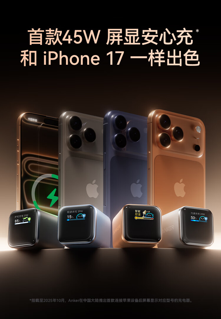 ANKER安克充电器45W智能屏显安心充Smart充电器氮化镓苹果新机充电头【智能识别iPhone17系】双折叠插脚 【45W重磅新品】极光白-AI智显屏|专利双插脚