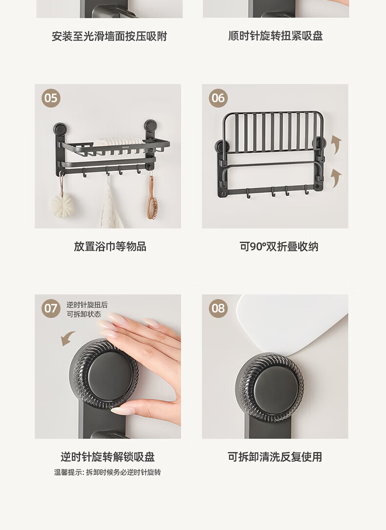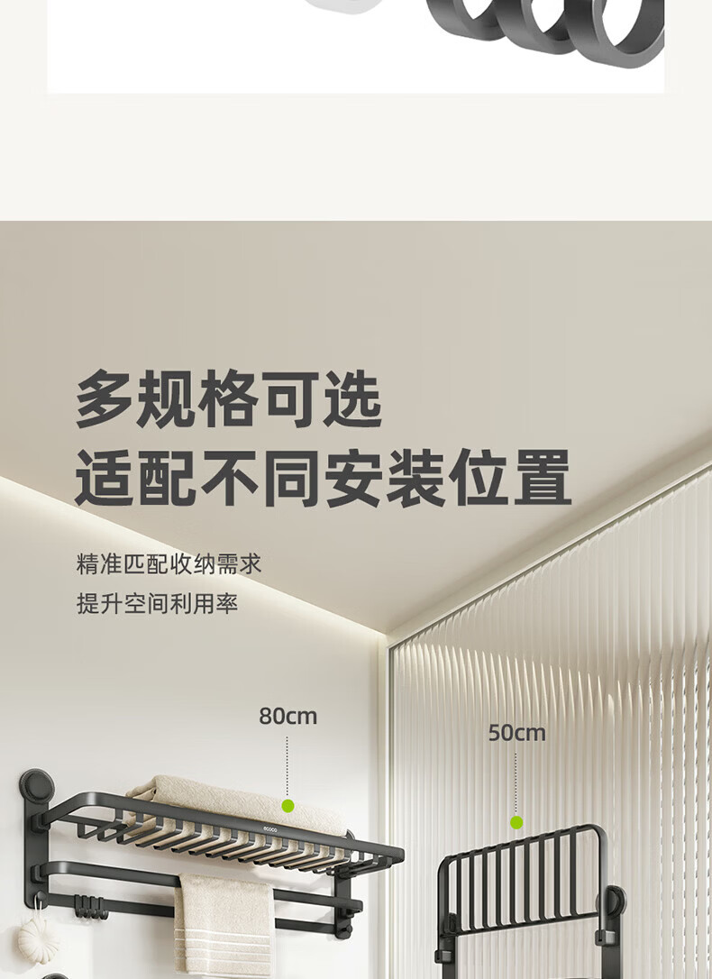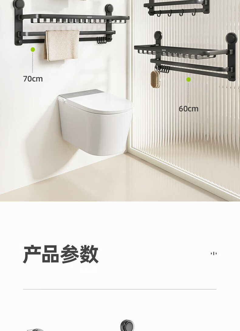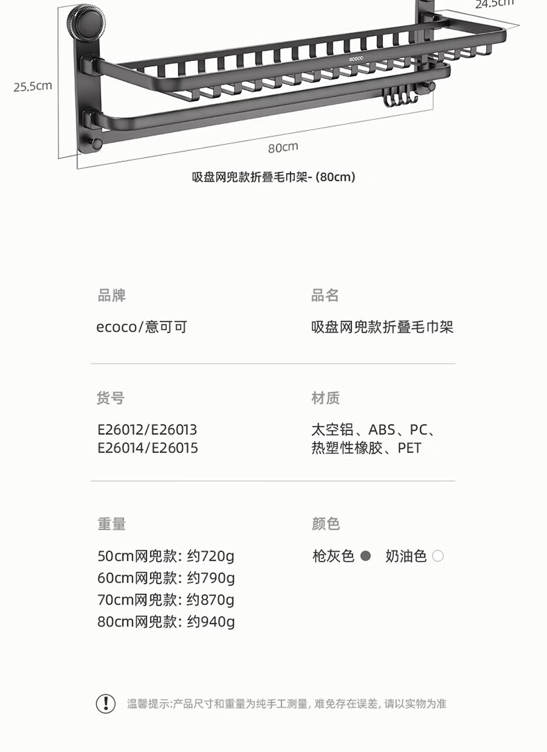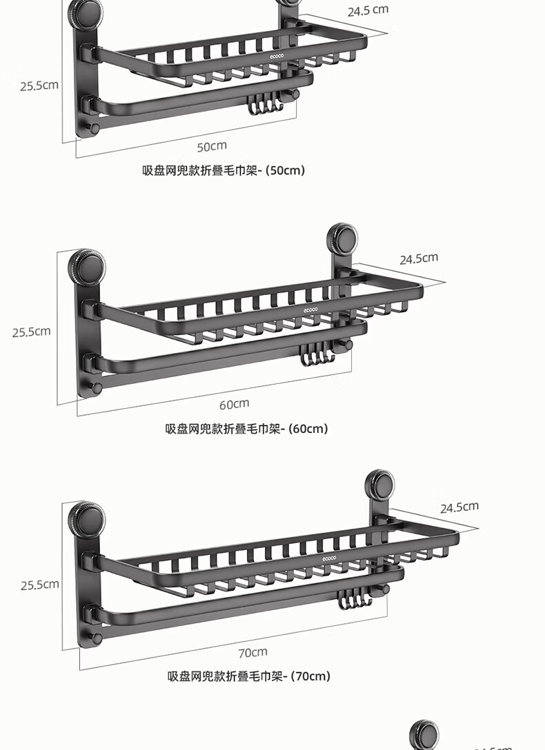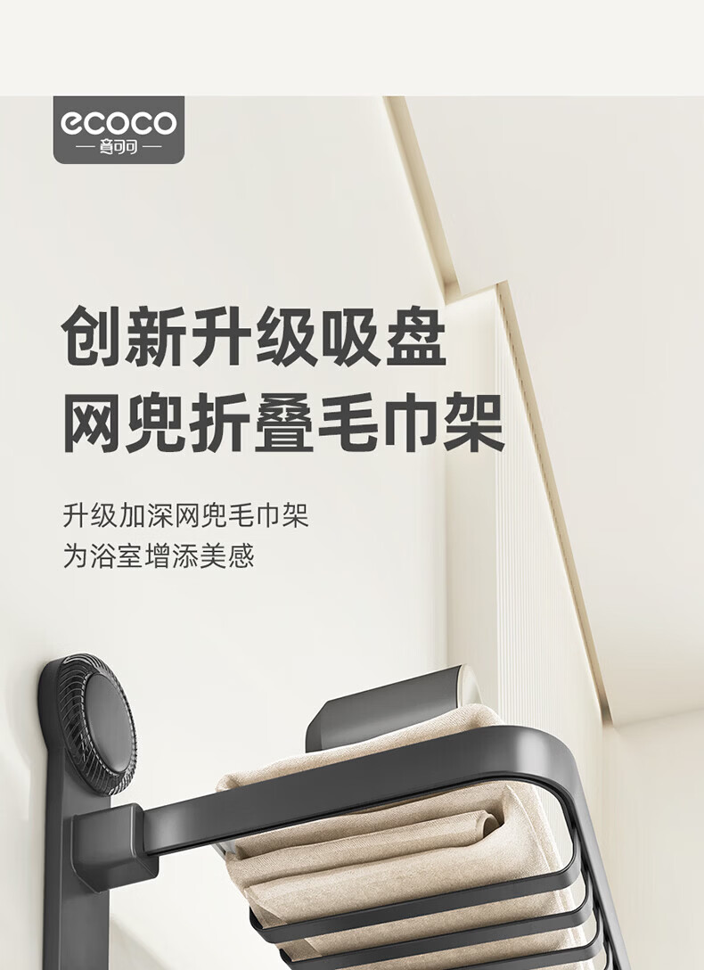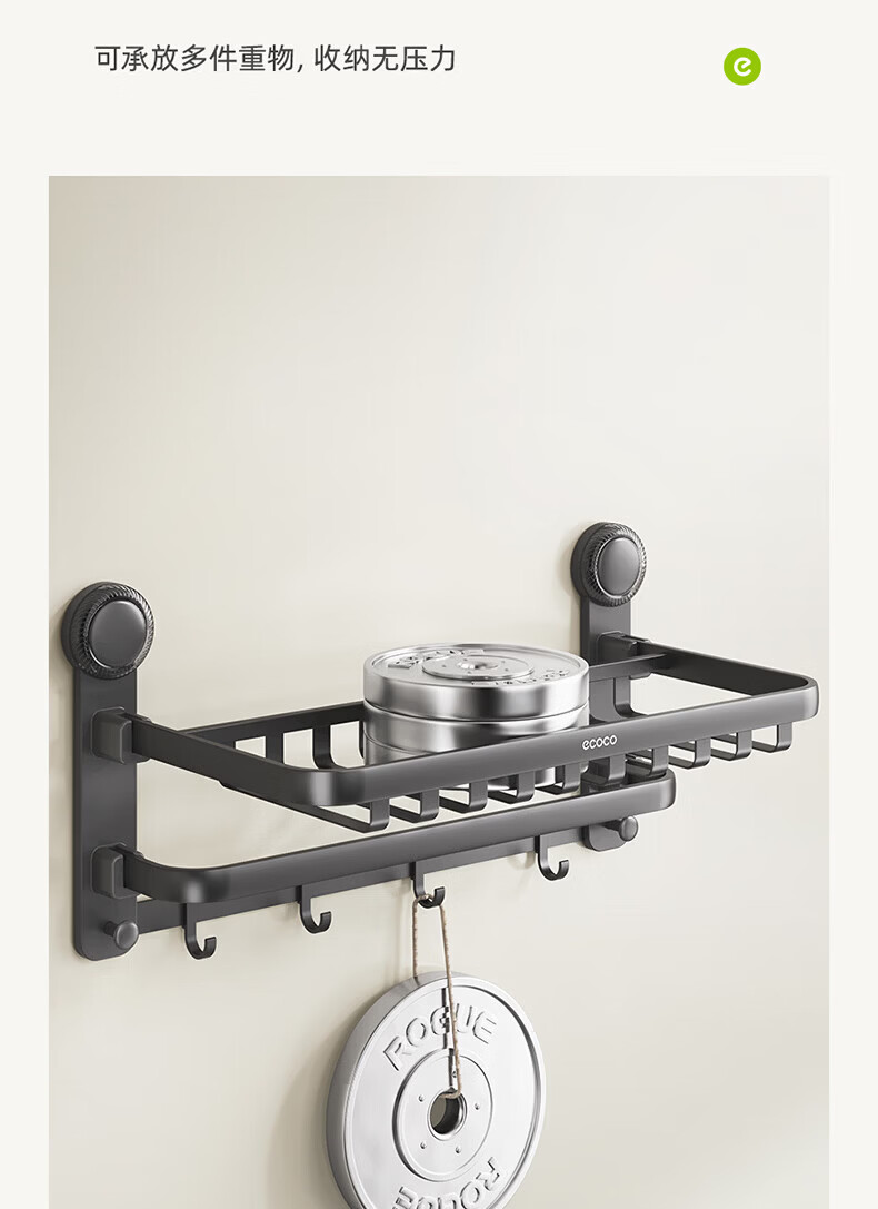 ecoco吸盘毛巾架卫生间收纳浴室置物架太空铝加厚免打孔厕所浴巾挂架 【/枪灰色】吸盘网兜款+移动挂钩 80cm