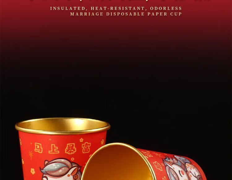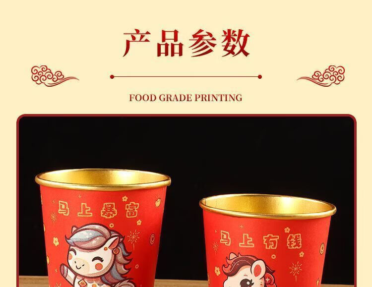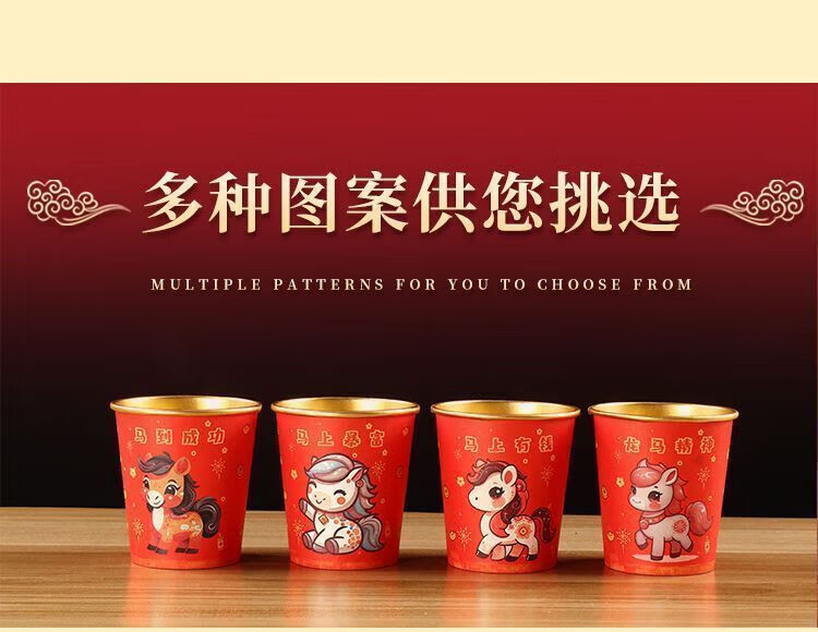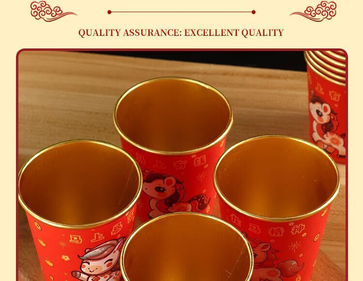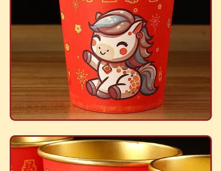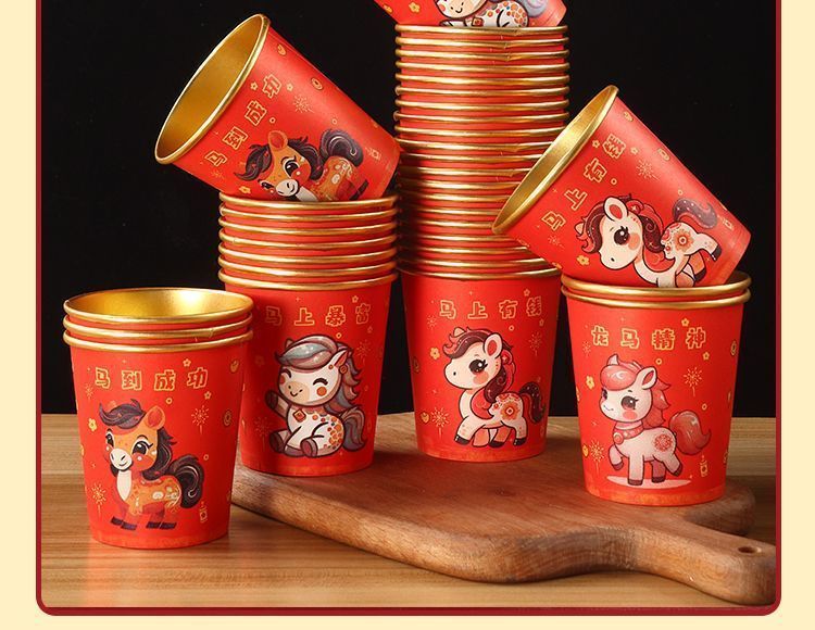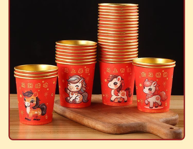 2026马年一次性加厚纸杯新年春节家用商用招待水杯喜庆金箔纸杯子 加厚金箔228ML【50】只装