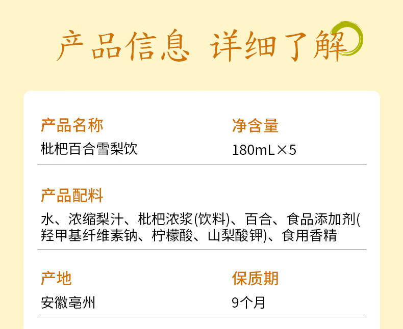 九物道枇杷百合雪梨饮清润干爽饮料即饮文火熬煮 枇杷百合雪梨饮 180ml*15袋