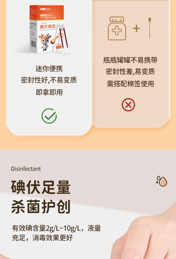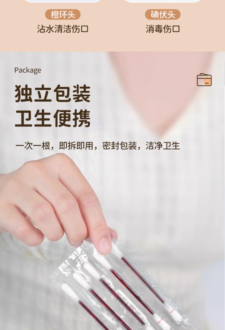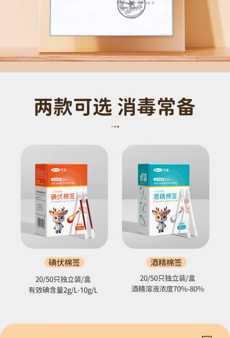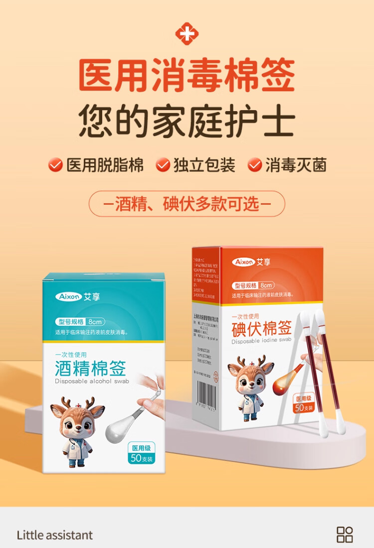 艾享医用碘伏棉签一次性婴儿肚脐护理成人伤口消毒棉棒独立包装50支