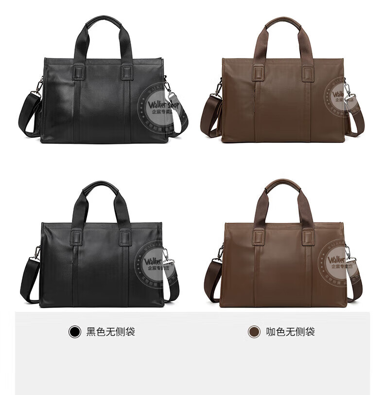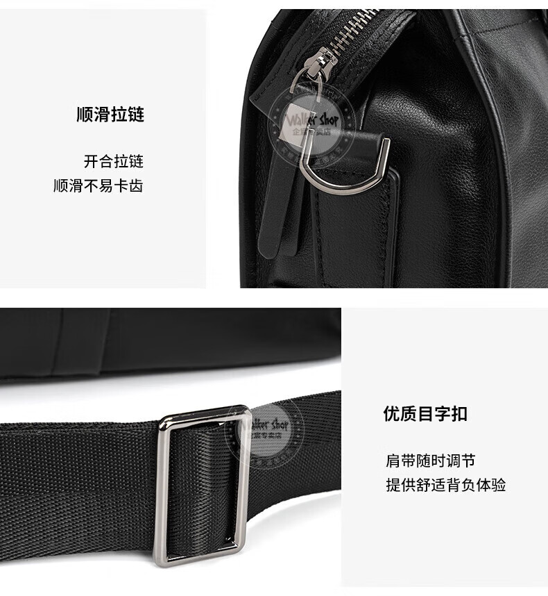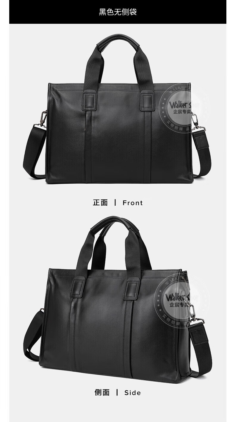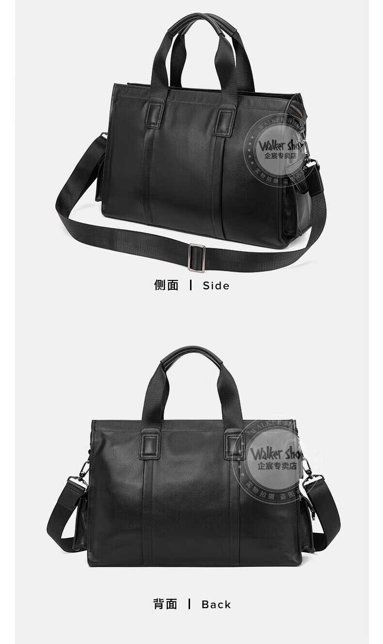 Walker Shop手提公文包【头层牛皮】男士电脑包商务大容量斜挎单肩包 黑色侧袋 中号(37.5*25.5*12)