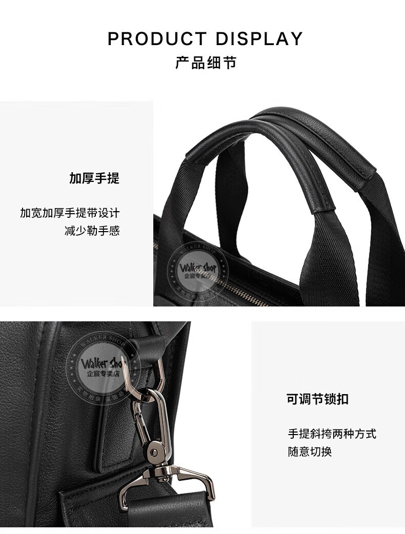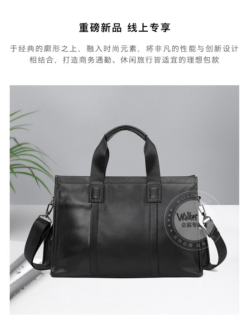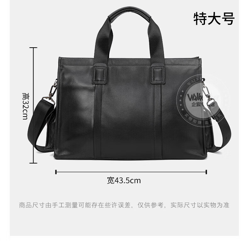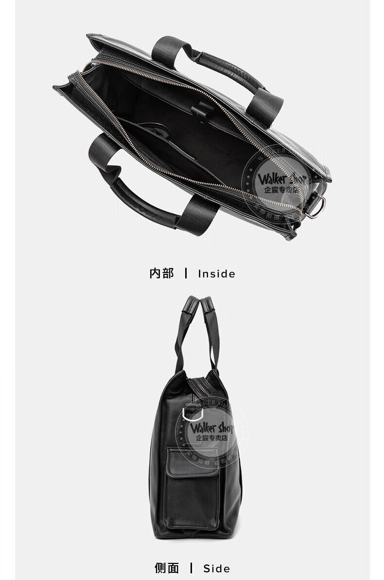 Walker Shop手提公文包【头层牛皮】男士电脑包商务大容量斜挎单肩包 黑色侧袋 中号(37.5*25.5*12)