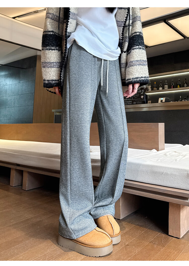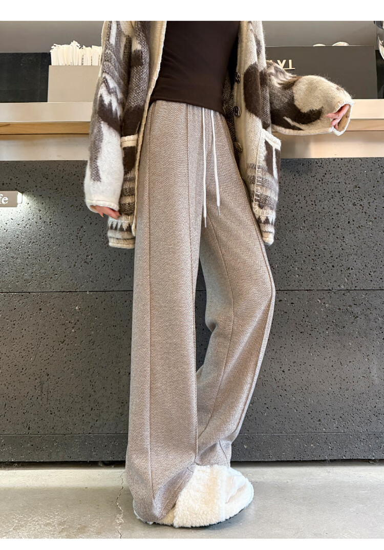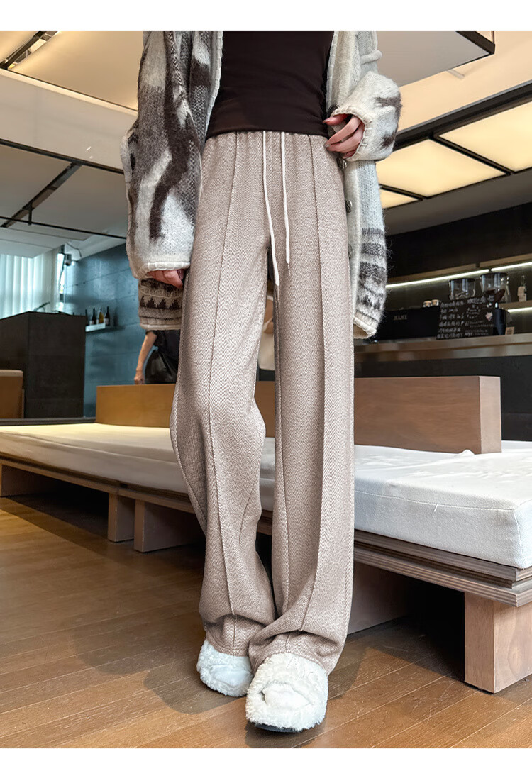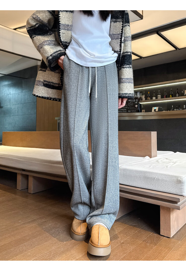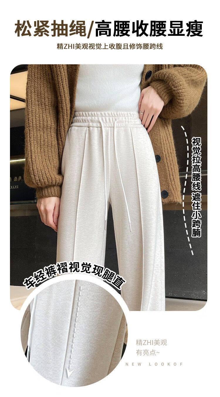 浪莎羊毛毛呢阔腿裤女秋冬2025新款高腰直筒裤加绒加厚人字纹休闲裤子 奶杏色 【抗寒保暖加绒款】 M 【建议:96-110斤】