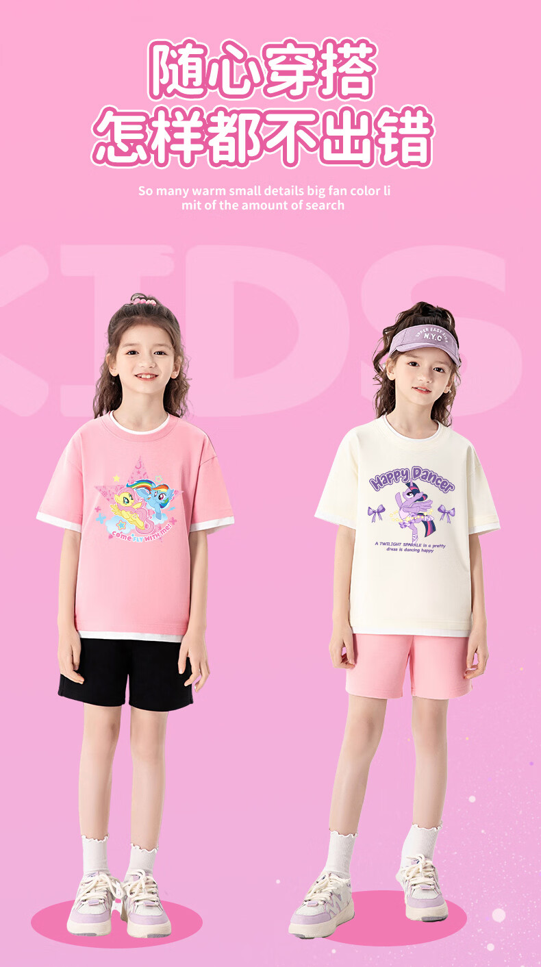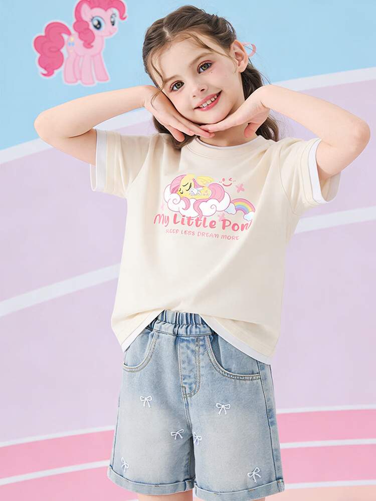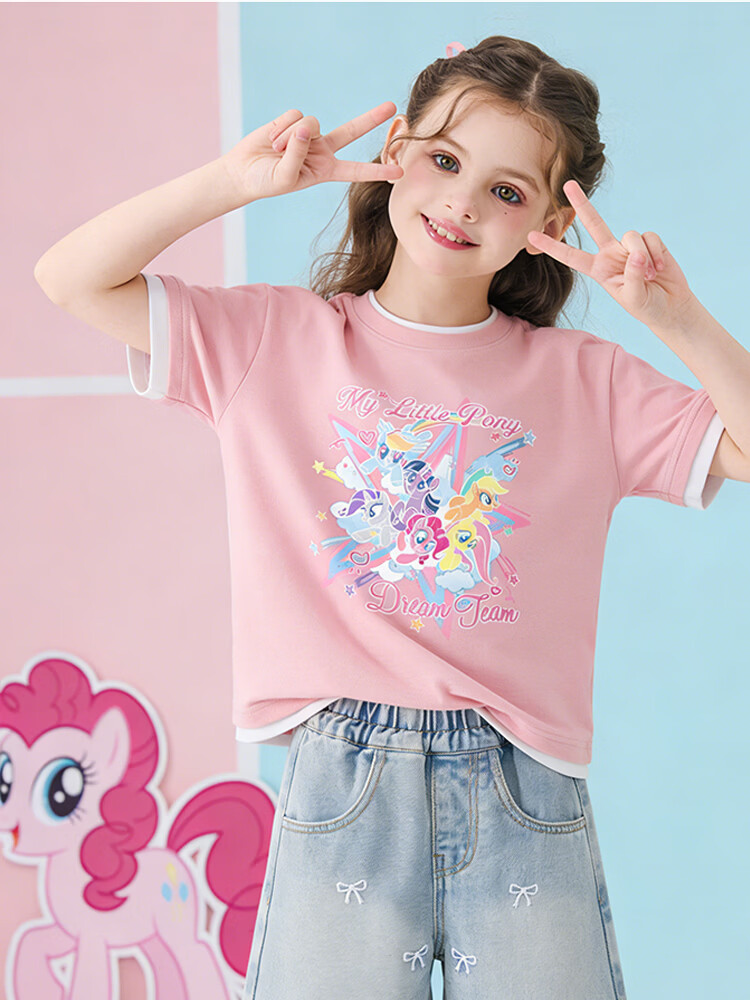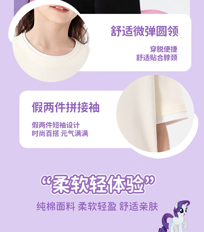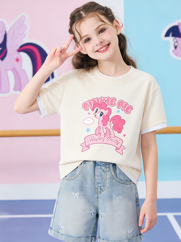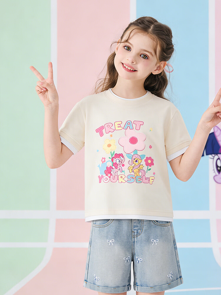 小马宝莉女童短袖t恤儿童假两件层次感上衣2026夏季新款百搭休闲运动衣 米白 云梦柔柔 150