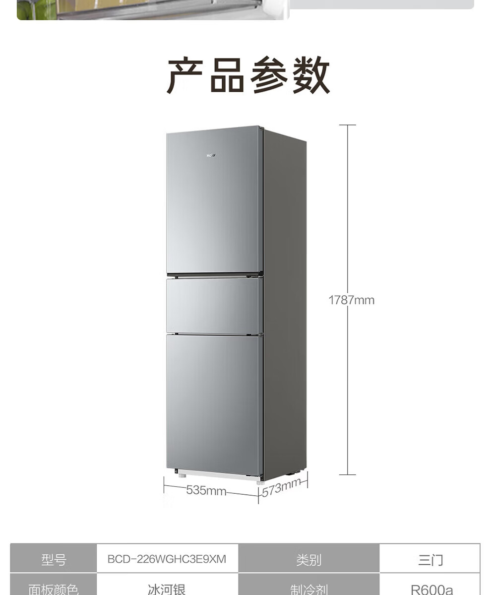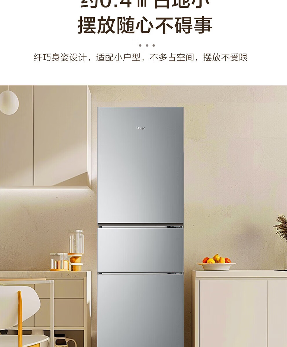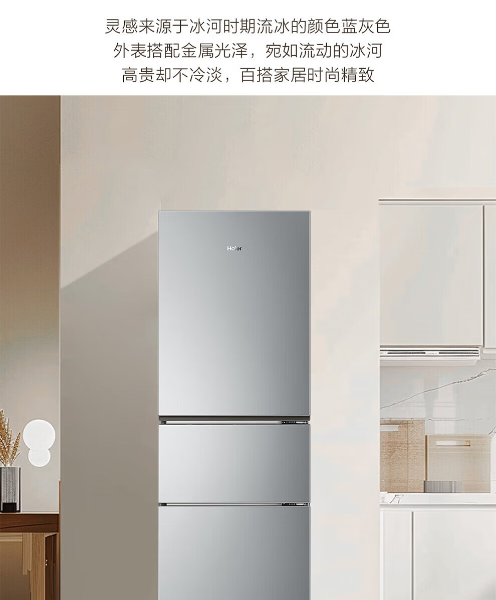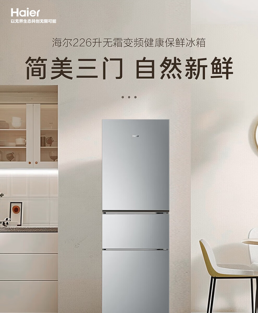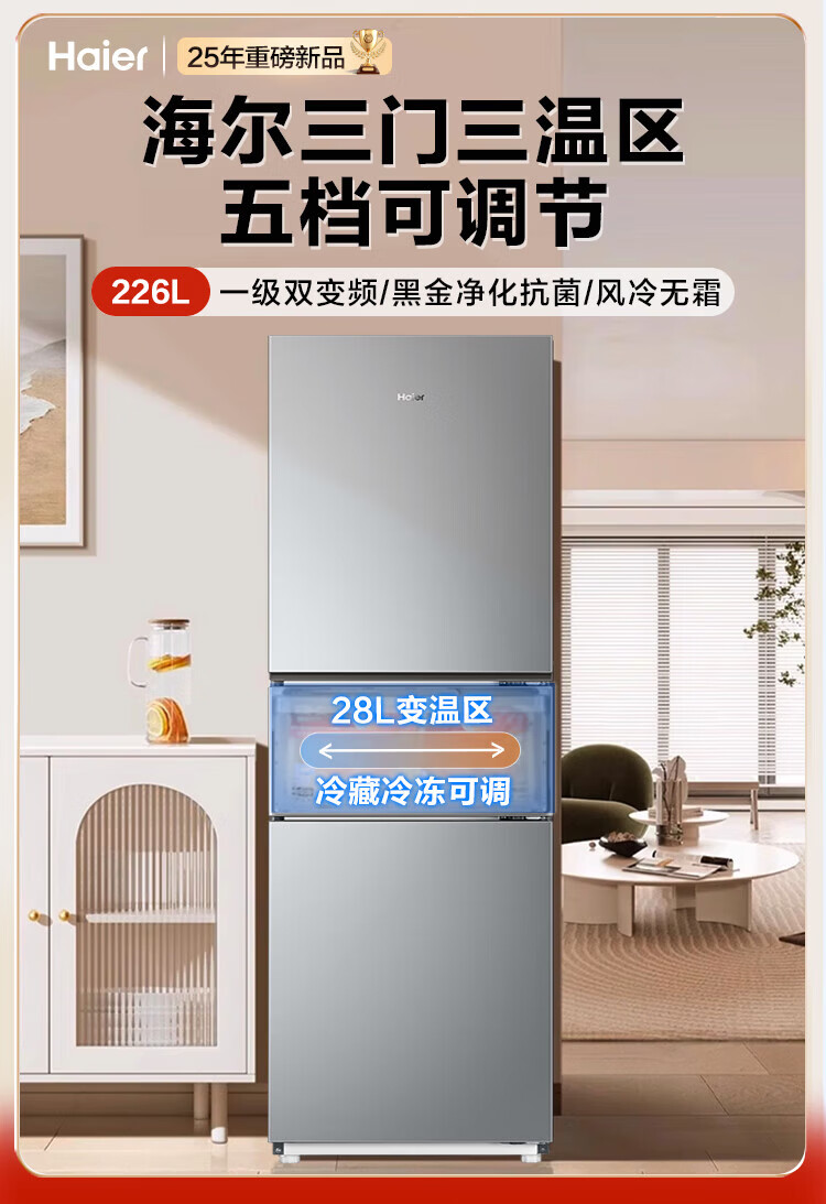 海尔冰箱226升三开门冰箱双变频三门风冷无霜家用出租房小户型电冰箱银色黑金净化以旧换新 三门三温区+风冷无霜