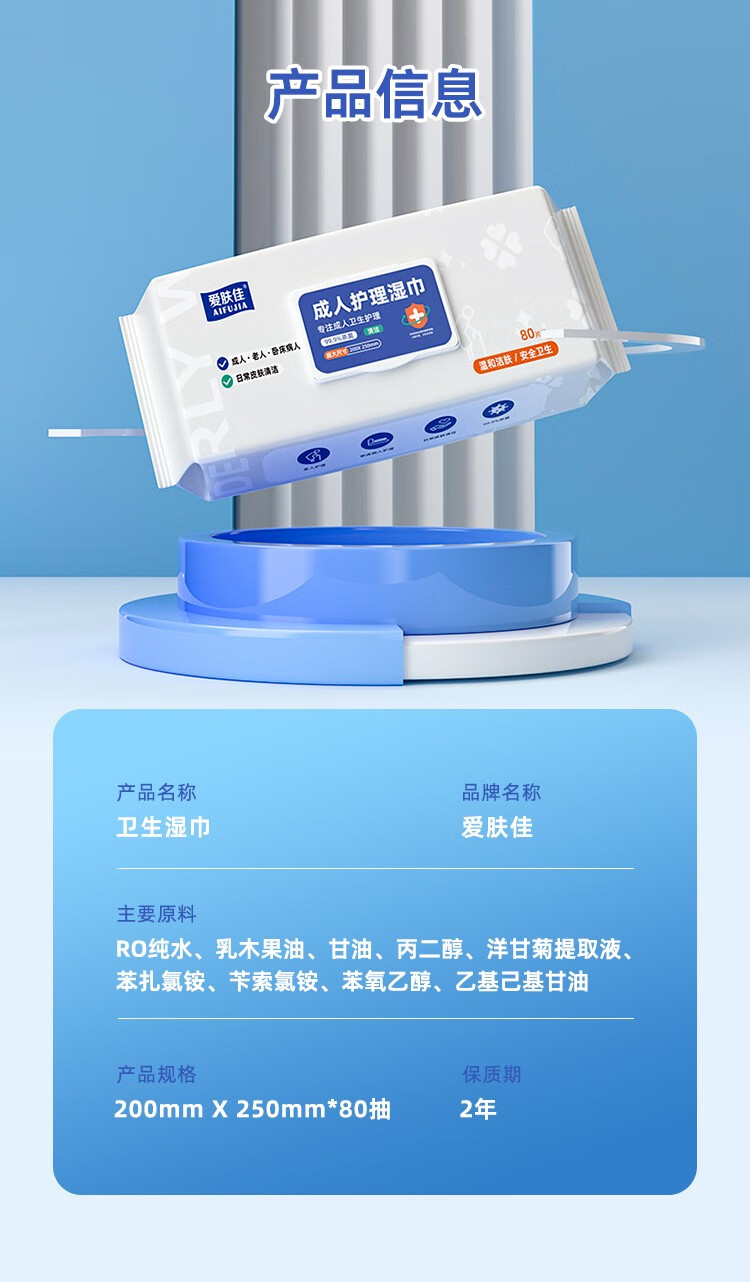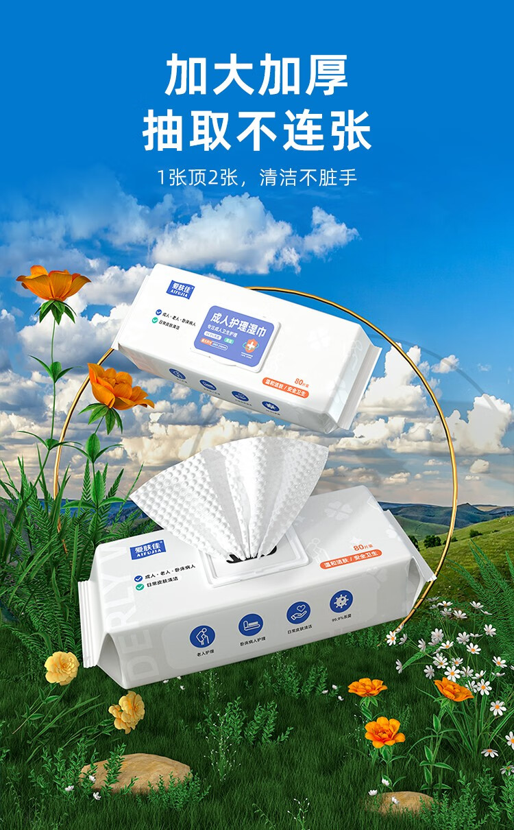 爱肤佳【精选品质】(aifujia)老年人护理湿巾专用湿纸巾卧床老人擦屁 80抽*6包(250*200mm)