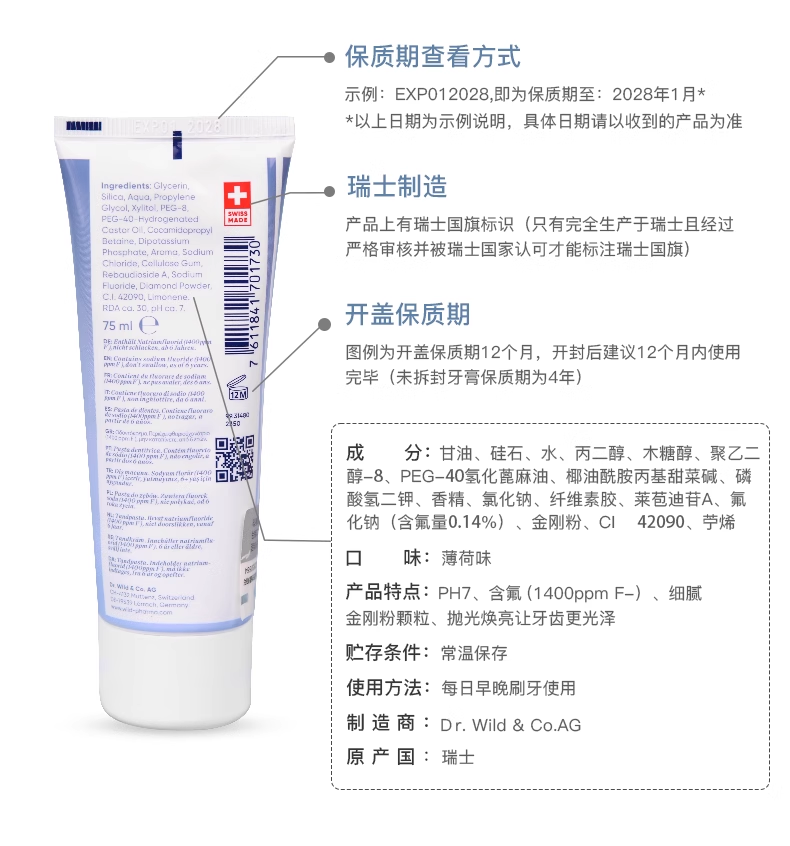 怀尔德Dr.wild瑞士进口钻石粉牙膏清洁去牙渍牙黄护龈提亮emoform75ml