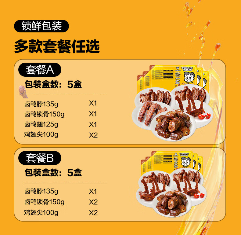 周黑鸭(ZHOUHEIYA)【多套餐可选】锁鲜 气调盒装卤鸭脖锁骨鸭翅鸡翅尖 武汉特产 【共5盒】1鸭脖1鸭锁骨1鸭翅2鸡翅尖