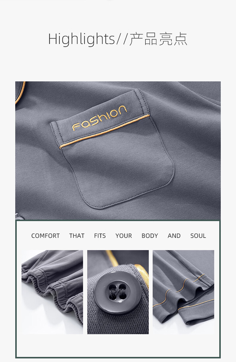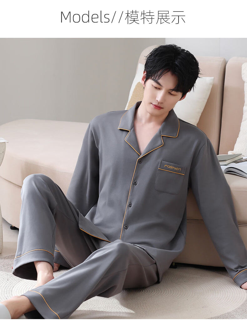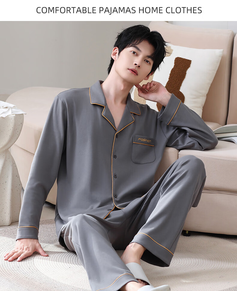 叶盼(yepan)【柔软】莱卡纯棉睡衣男士春秋长袖宽松大码高级感男款家居服套装 8705-灰色 L (170) :建议100-135斤穿着